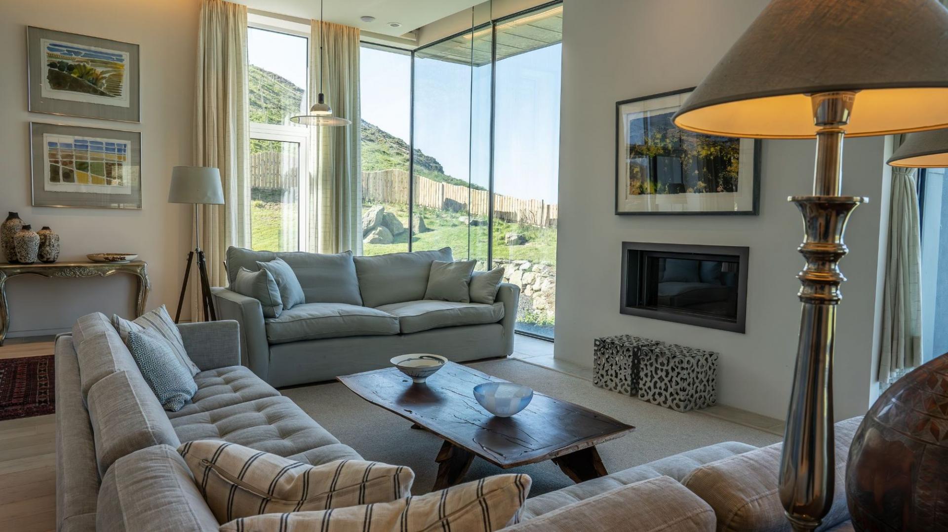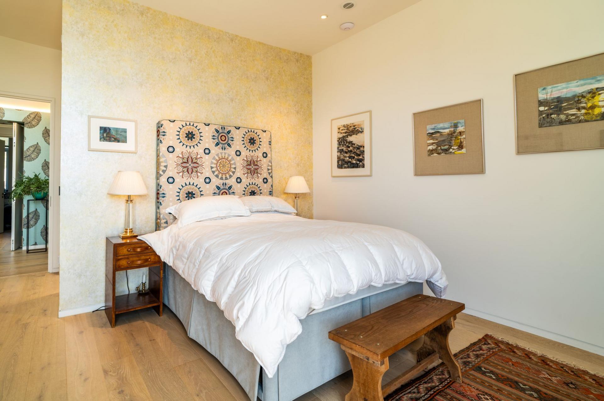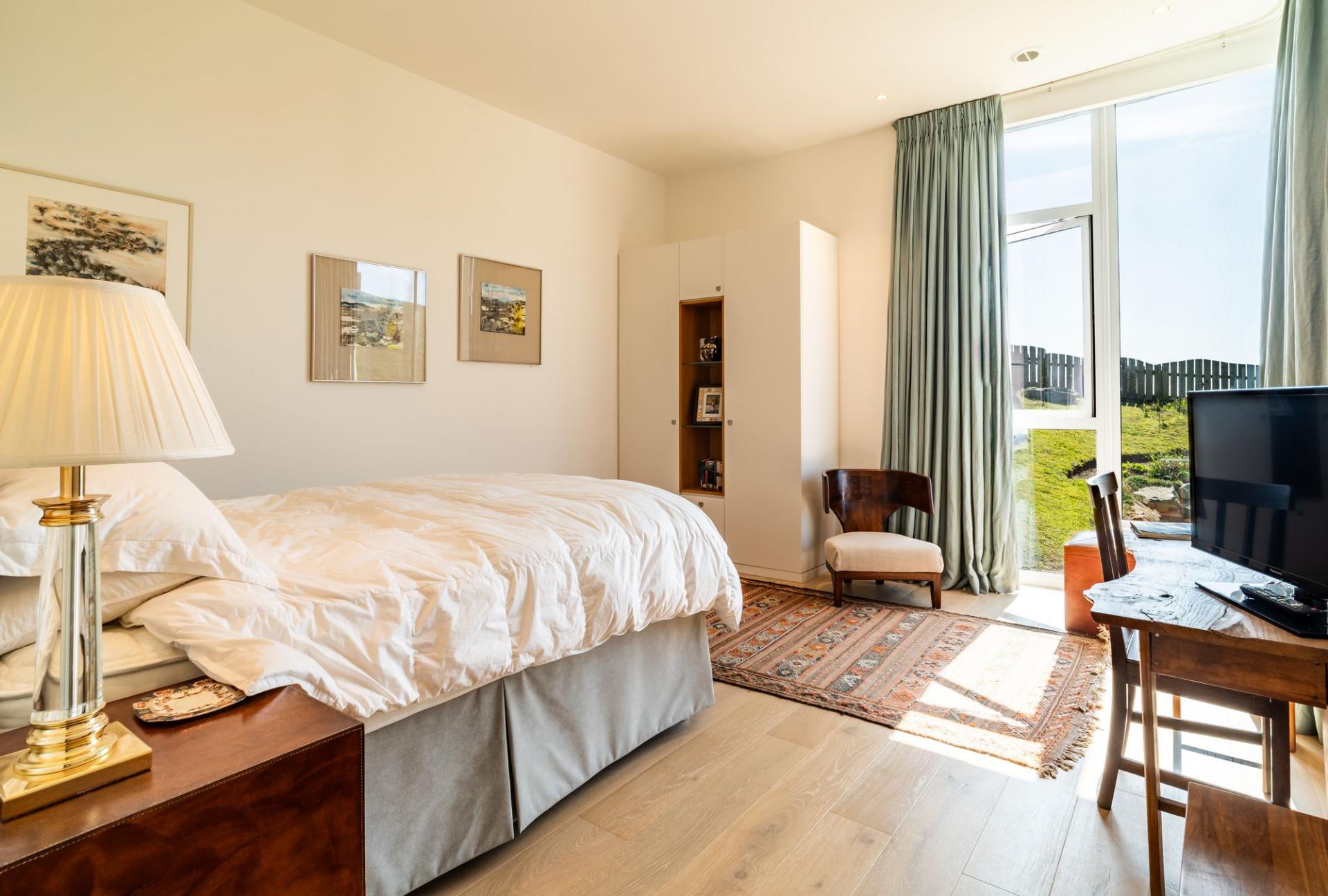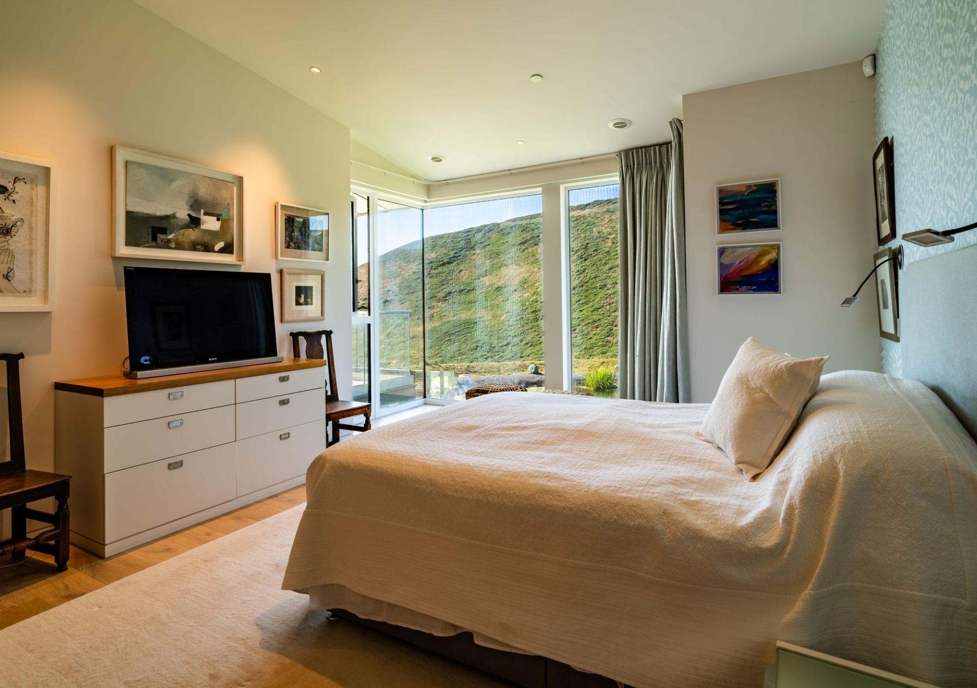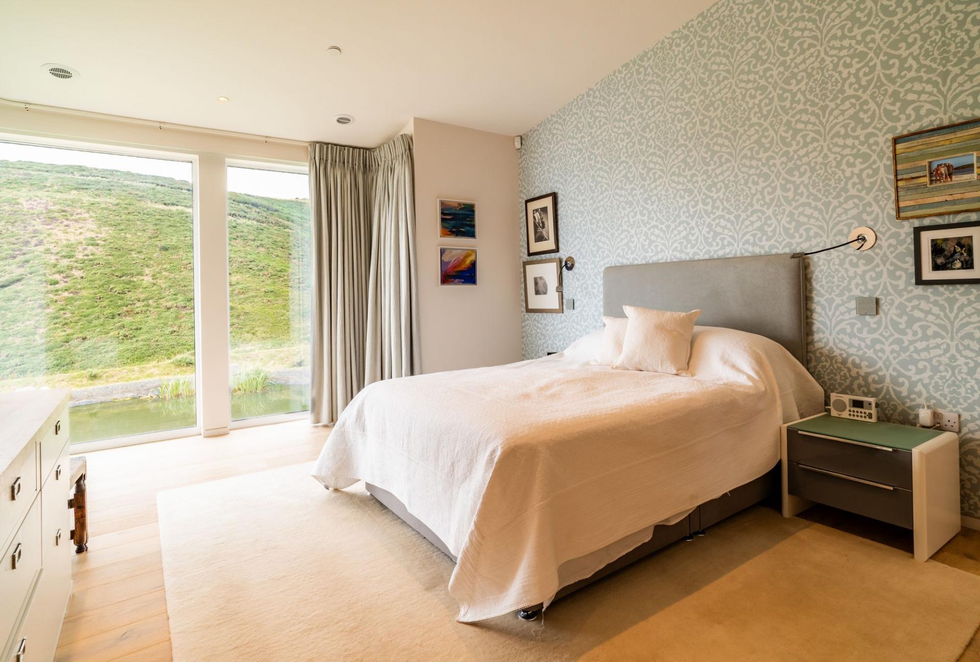 Privately set within its own wing, the principal bedroom offers a calm retreat with floor-to-ceiling views across the wildflower meadows and distant sea.