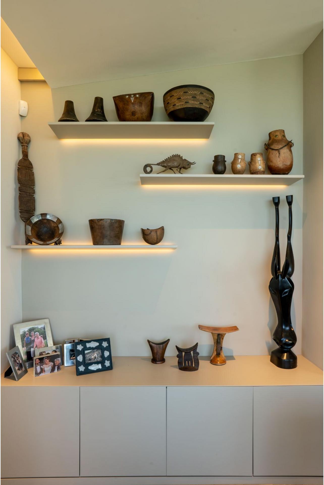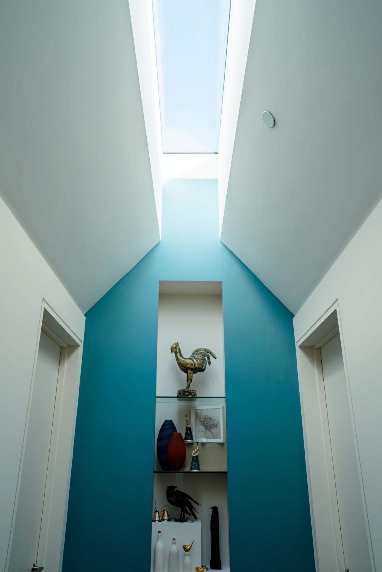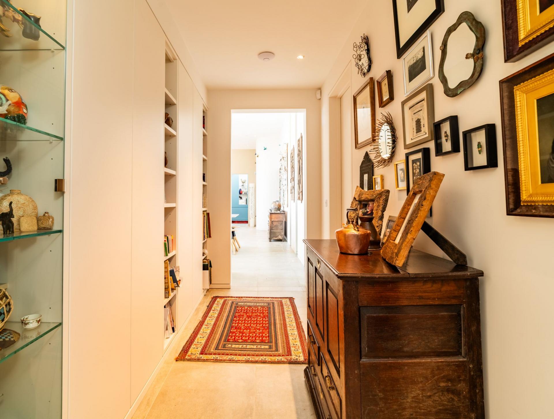 A dramatic and light-filled welcome, the entrance hall sets the tone architectural lighting, and fitted cupboards for coats and shoes. Porcelain tile floors flow underfoot, hinting at the tactile luxury throughout.