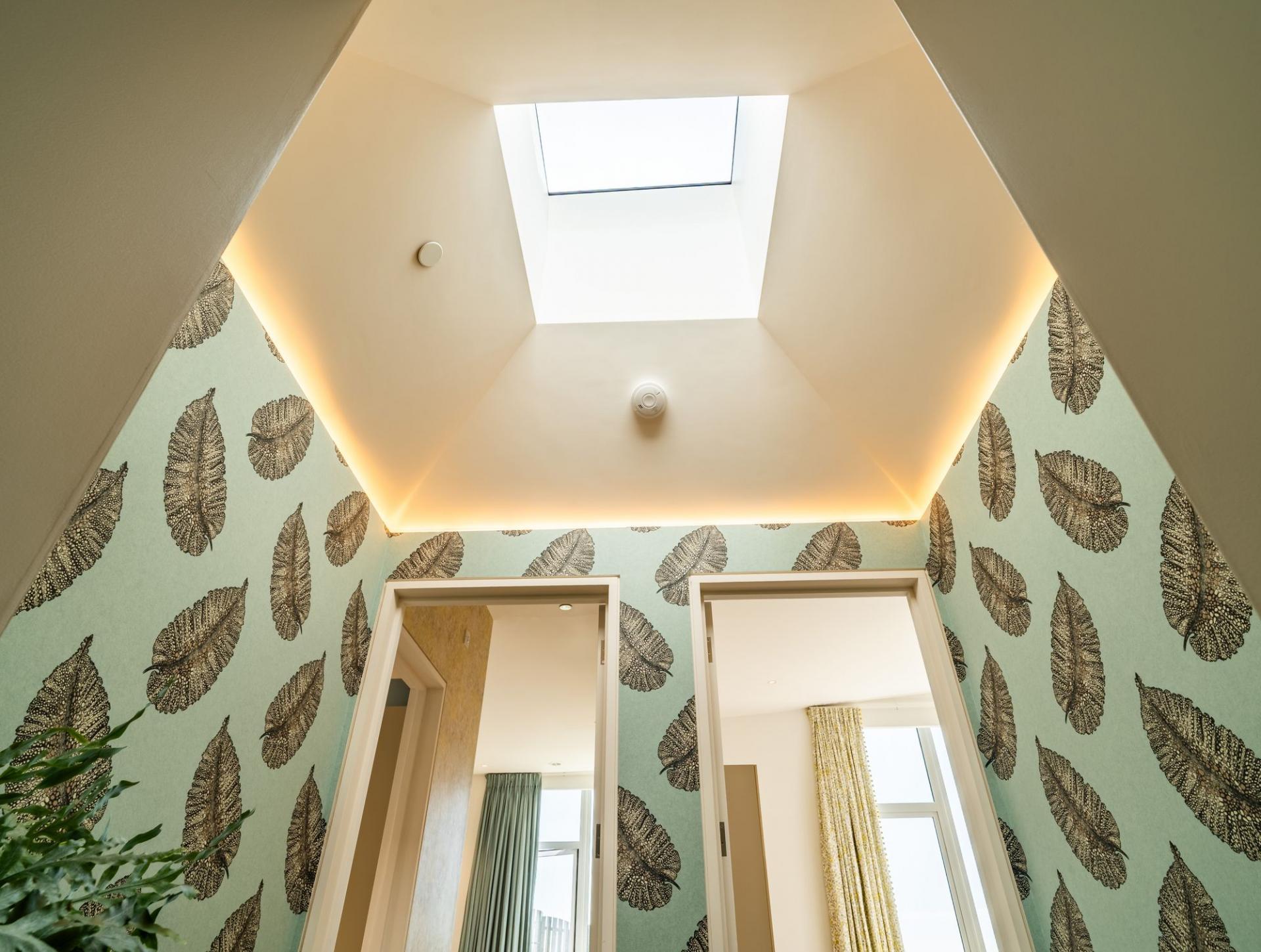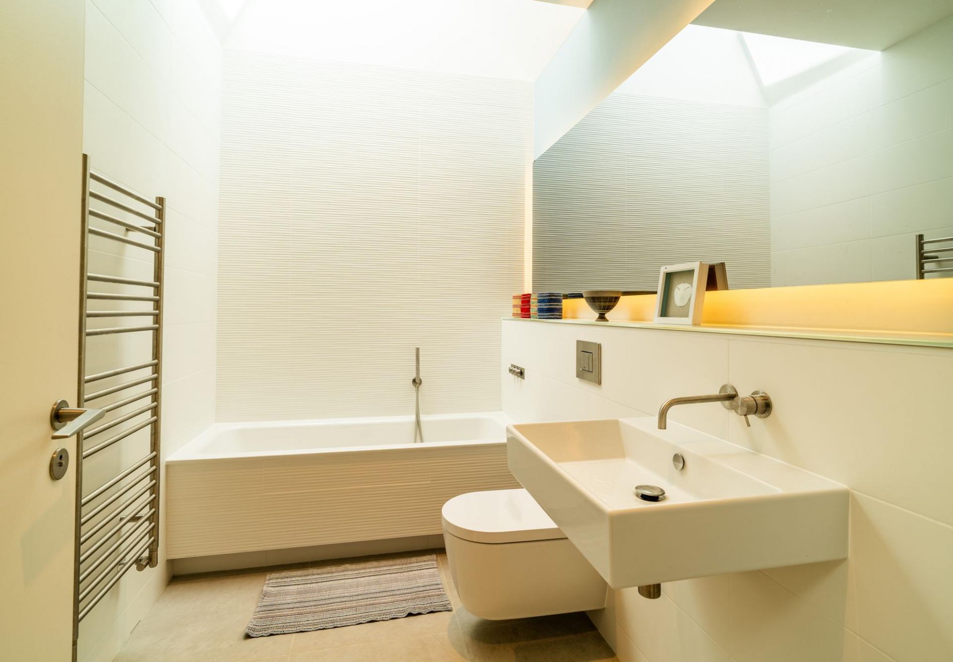 Sleek, contemporary en-suite featuring a built-in bath with hand-held shower, wall-hung basin, and WC. A large illuminated mirror enhances the sense of space, while a skylight floods the room with natural light. Finished with soft-toned floor and wall tiles, and complemented by a heated towel rail for comfort and practicality.