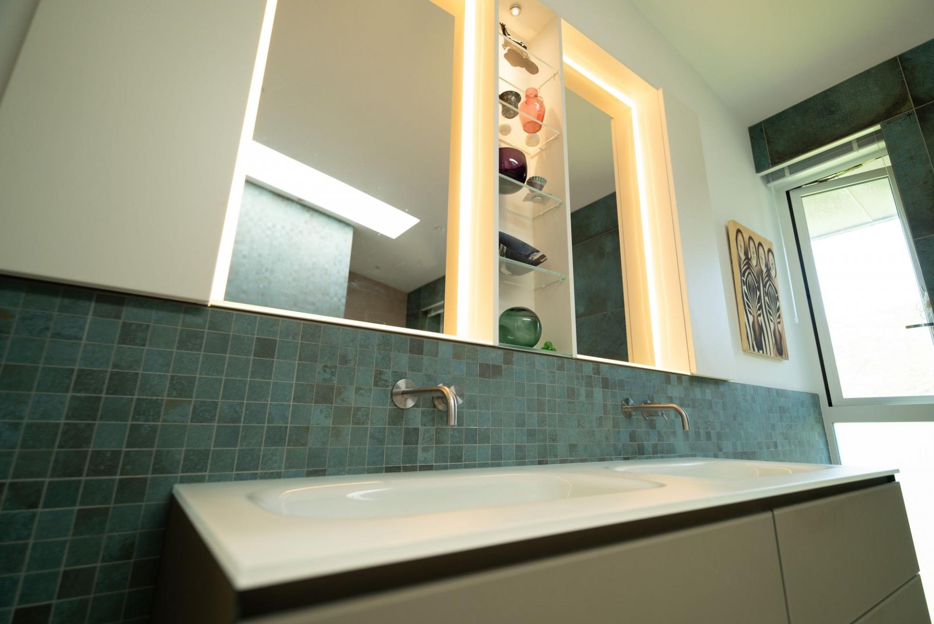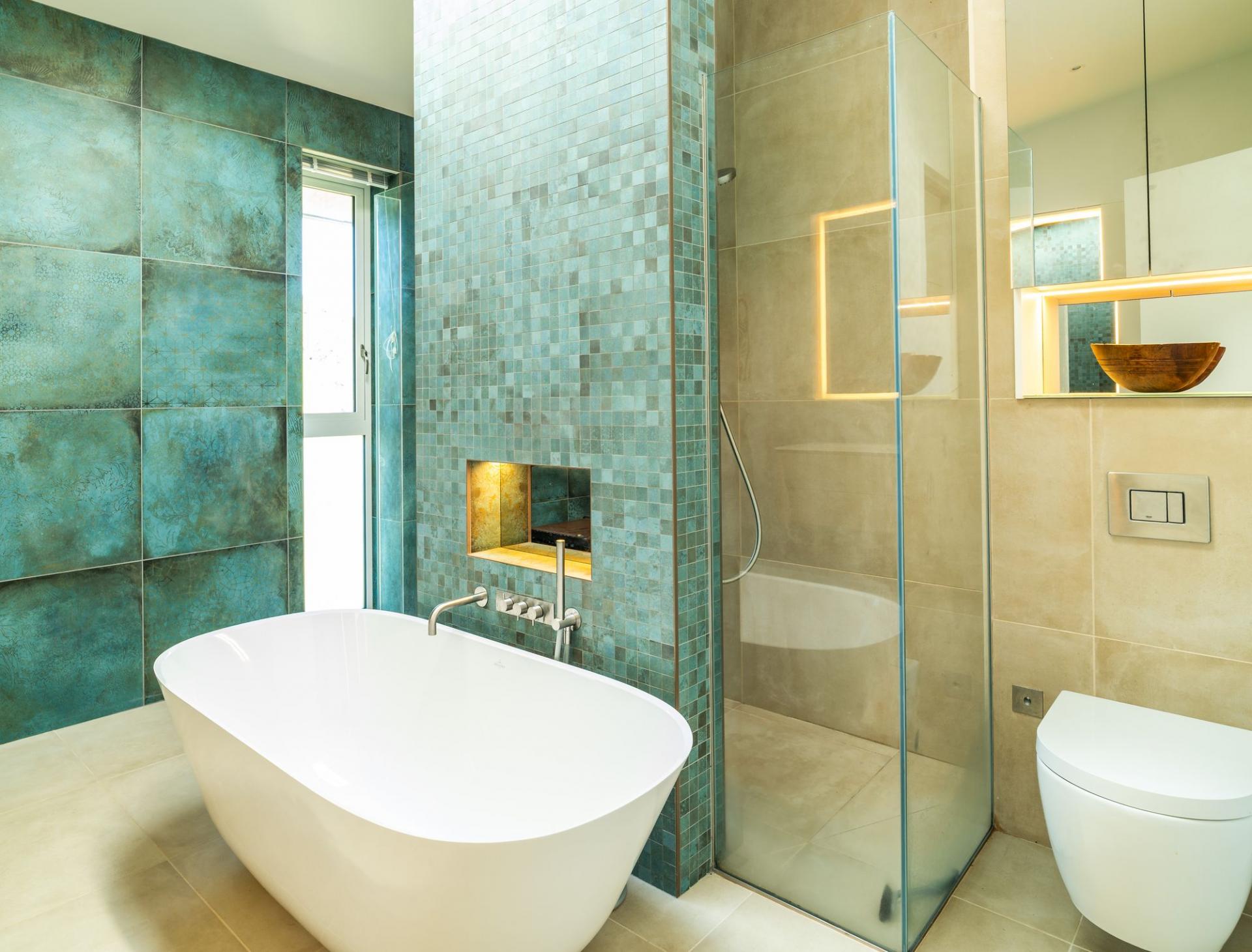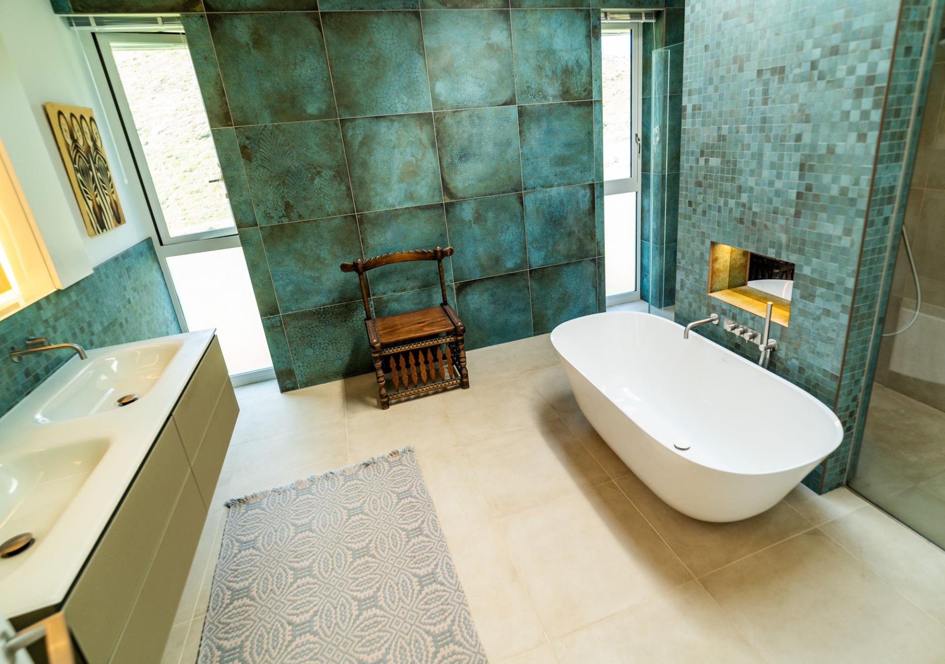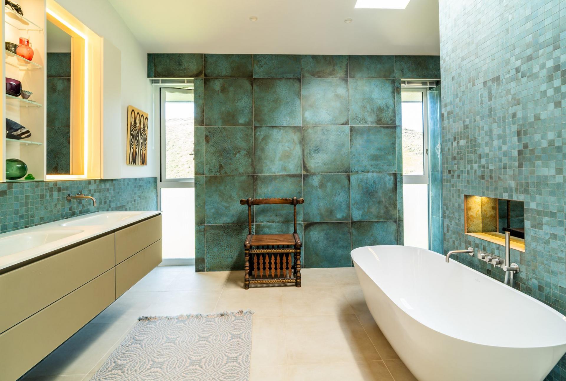 Stylish en-suite with a freestanding bath set against a striking teal mosaic feature wall, a spacious walk-in shower, and a double vanity with integrated lighting. Large skylight and windows flood the space with natural light, complemented by stone-effect tiling for a modern, spa-like feel.