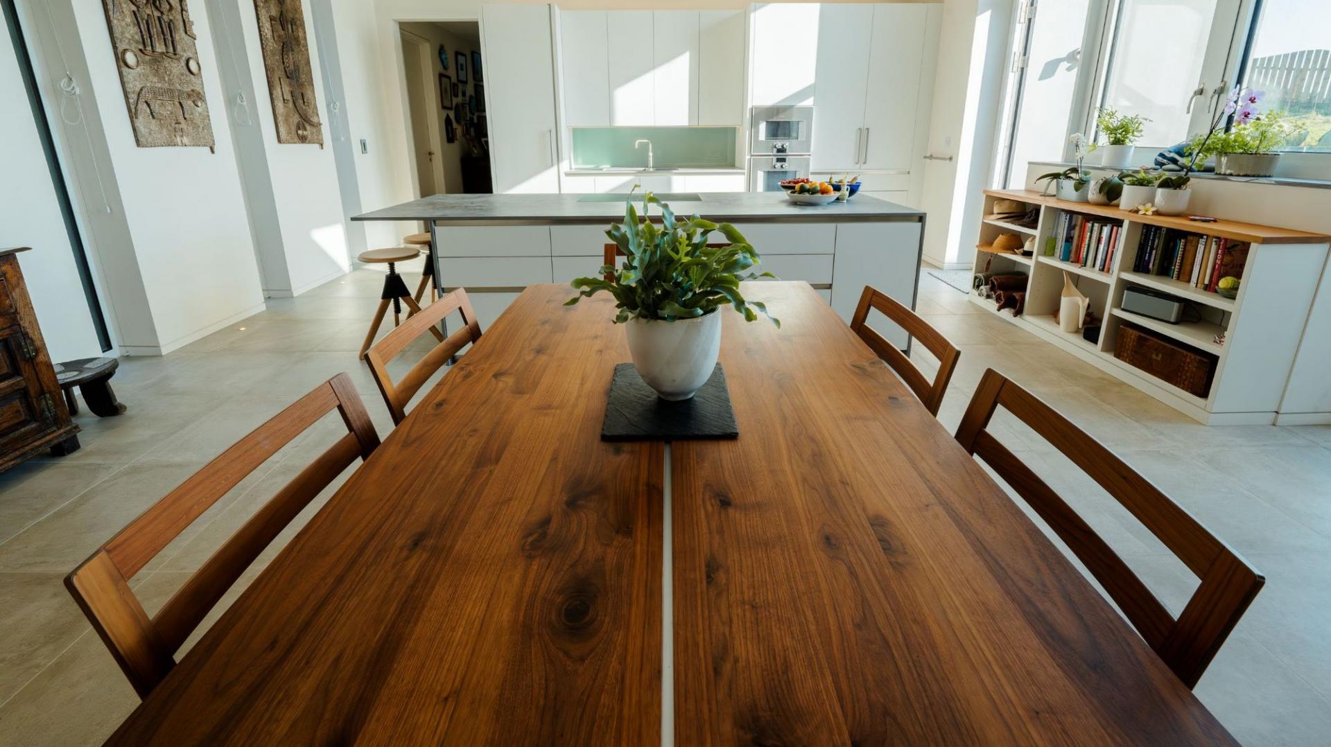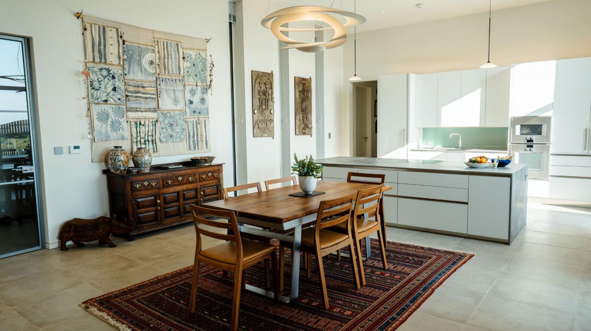 The dining zone is positioned to take in sunset views, with seamless flow to the outdoor entertaining areas and terrace.