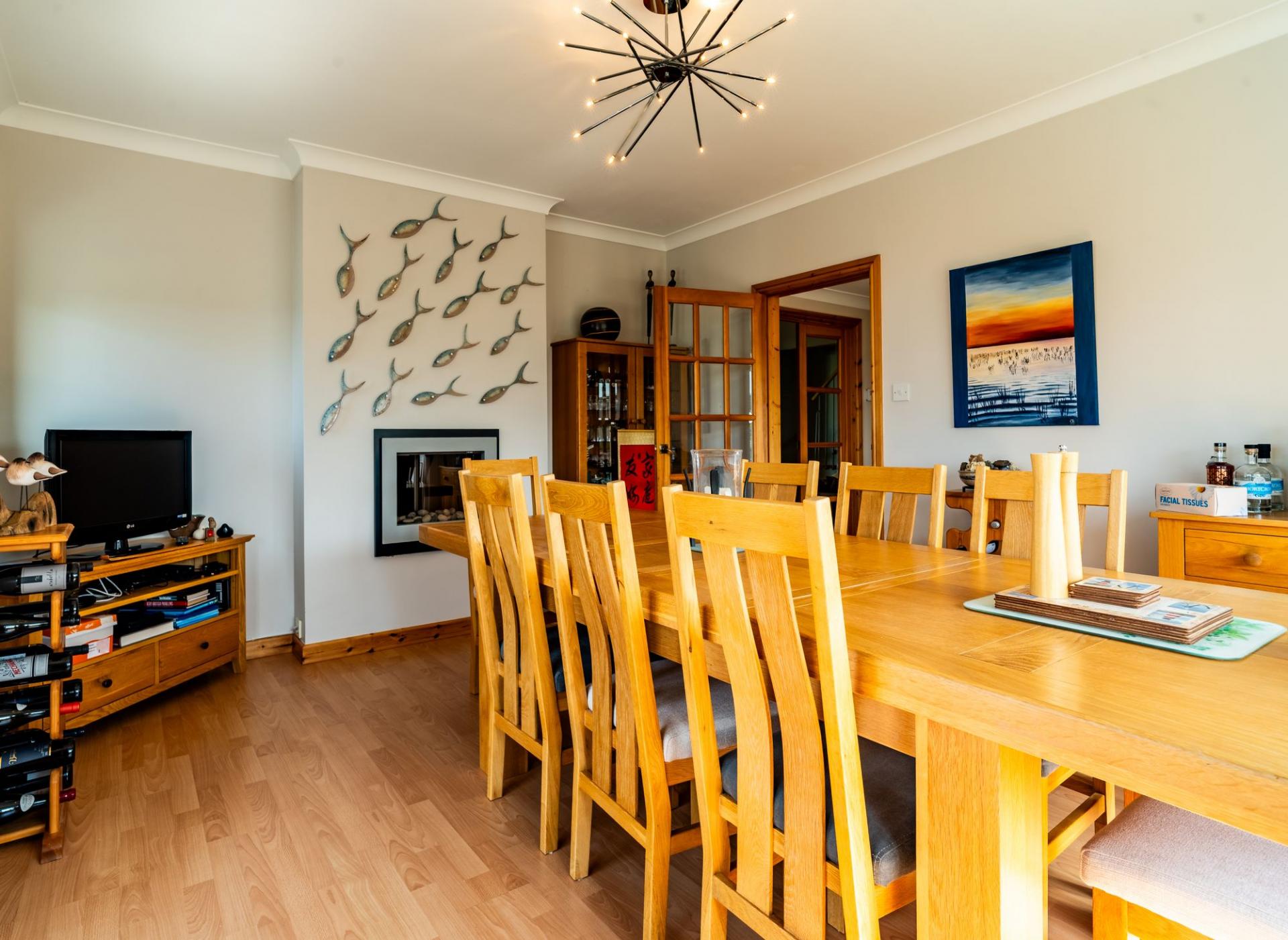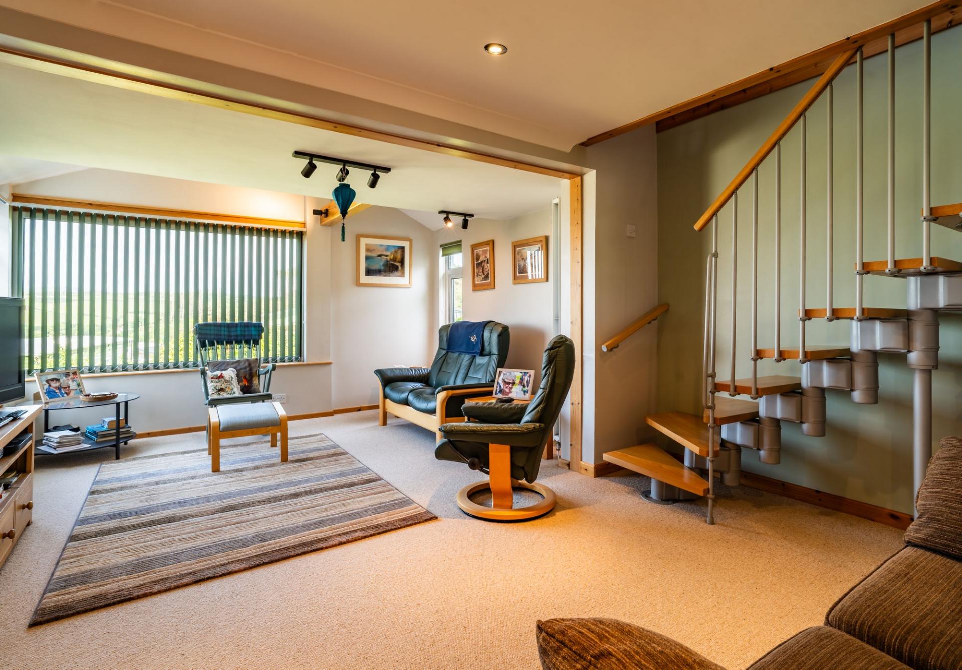 From the moment you arrive, the home’s striking roofline and commanding presence set the tone for what lies within. Inside, the accommodation is light, spacious and thoughtfully laid out, with large picture windows framing uninterrupted coastal and countryside vistas. At the heart of the home is a sleek, modern kitchen with granite worktops and a scenic breakfast bar — perfect for relaxed everyday living or entertaining with a view.