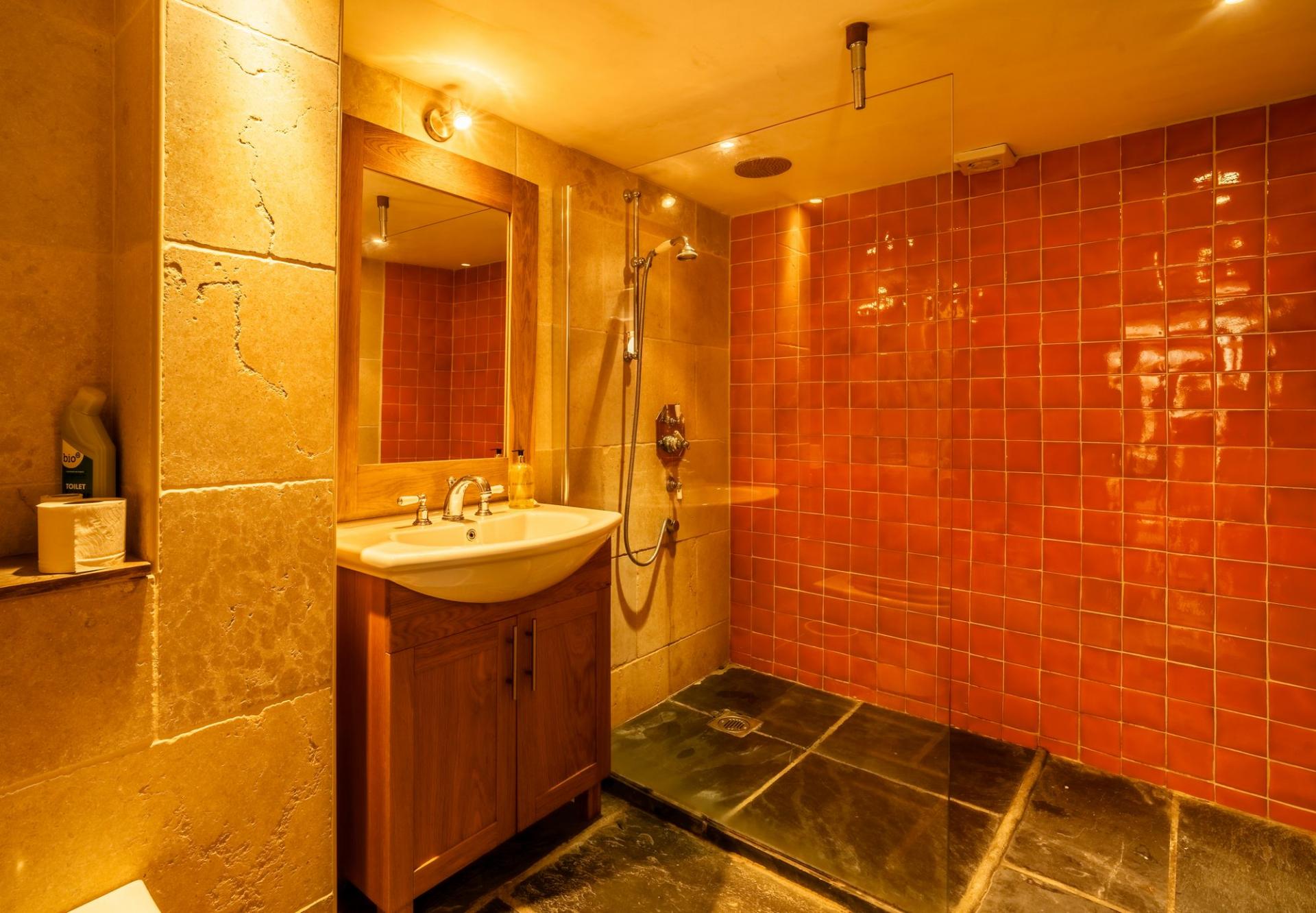 Walk-in rainfall shower, vanity basin, low-level WC, heated towel rail, tiled walls and extractor fan.