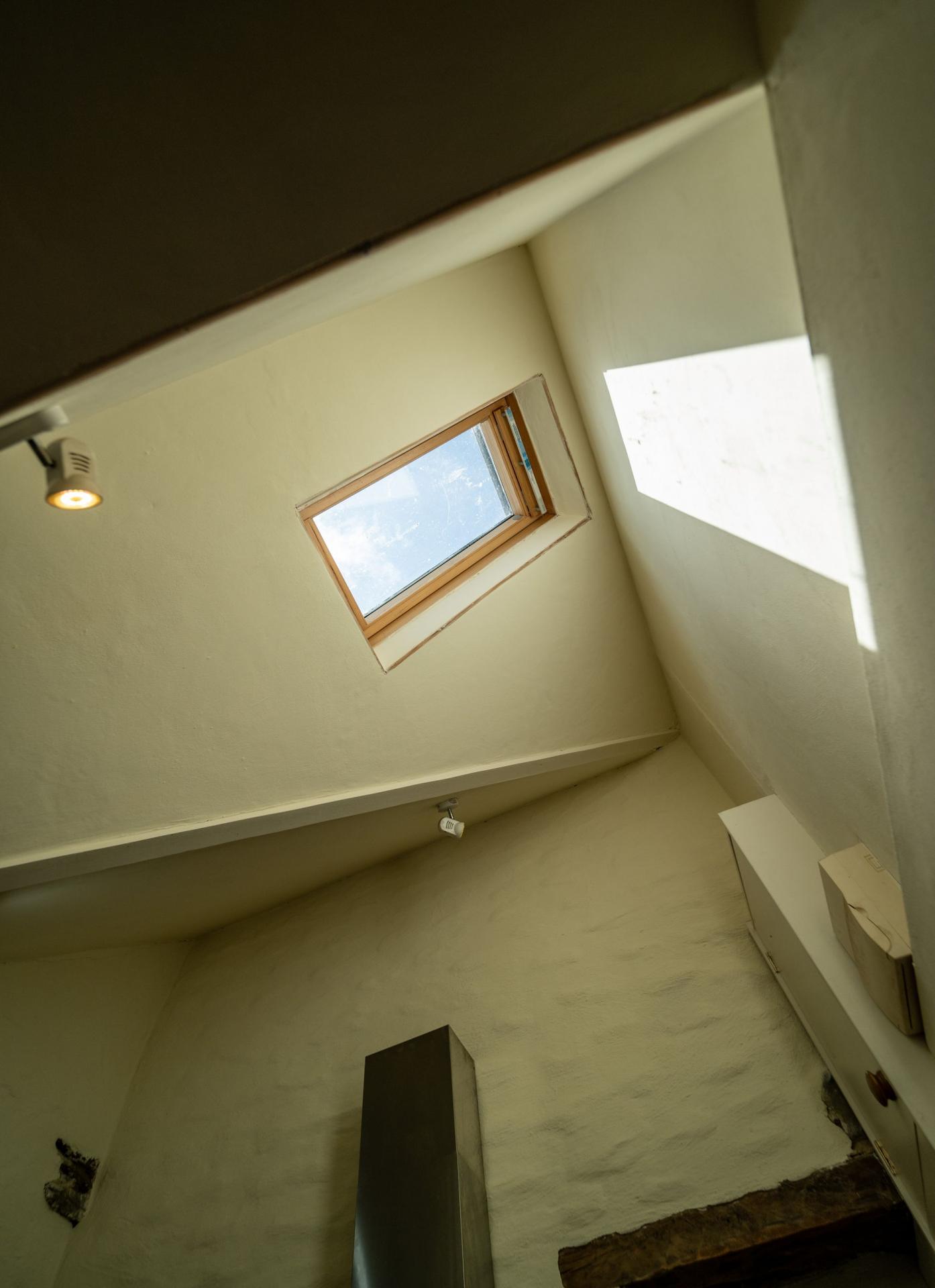 Enclosed bath, walk-in rainfall shower, vanity unit, WC, dual towel rails, Velux window.