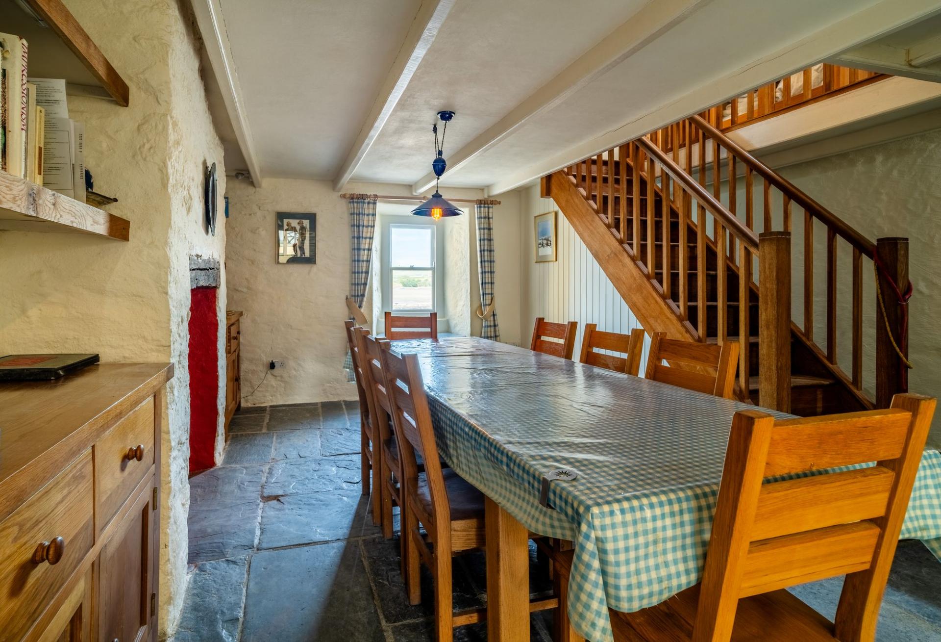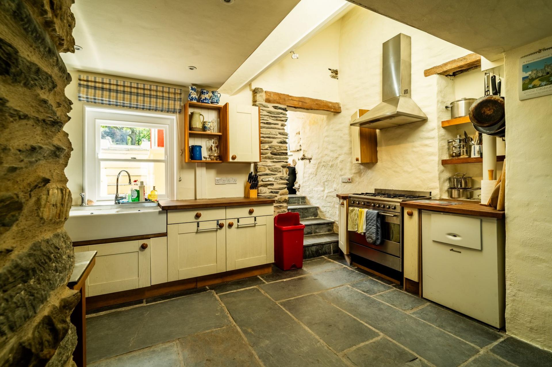 Comprising kitchen area with stone feature wall, fitted base units, double butler sink, five-ring gas range cooker, Worcester boiler, Velux rooflight, and dining area with space for 10+ seat table, beam ceiling, and front aspect views.