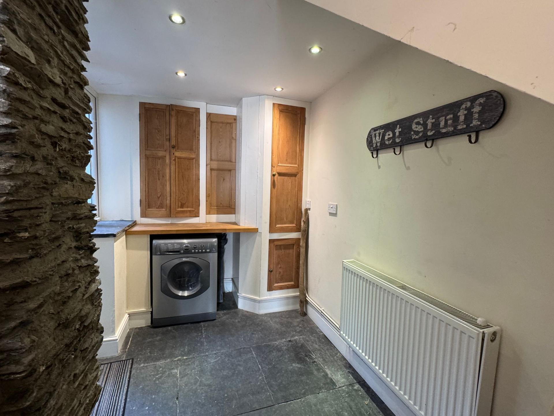 The kitchen opens into a utility room, offering an additional range of matching units, a cupboard housing the gas-fired boiler, plumbing for an automatic washing machine, cloaks hanging space, an additional storage cupboard, and a door leading directly to the yard.
