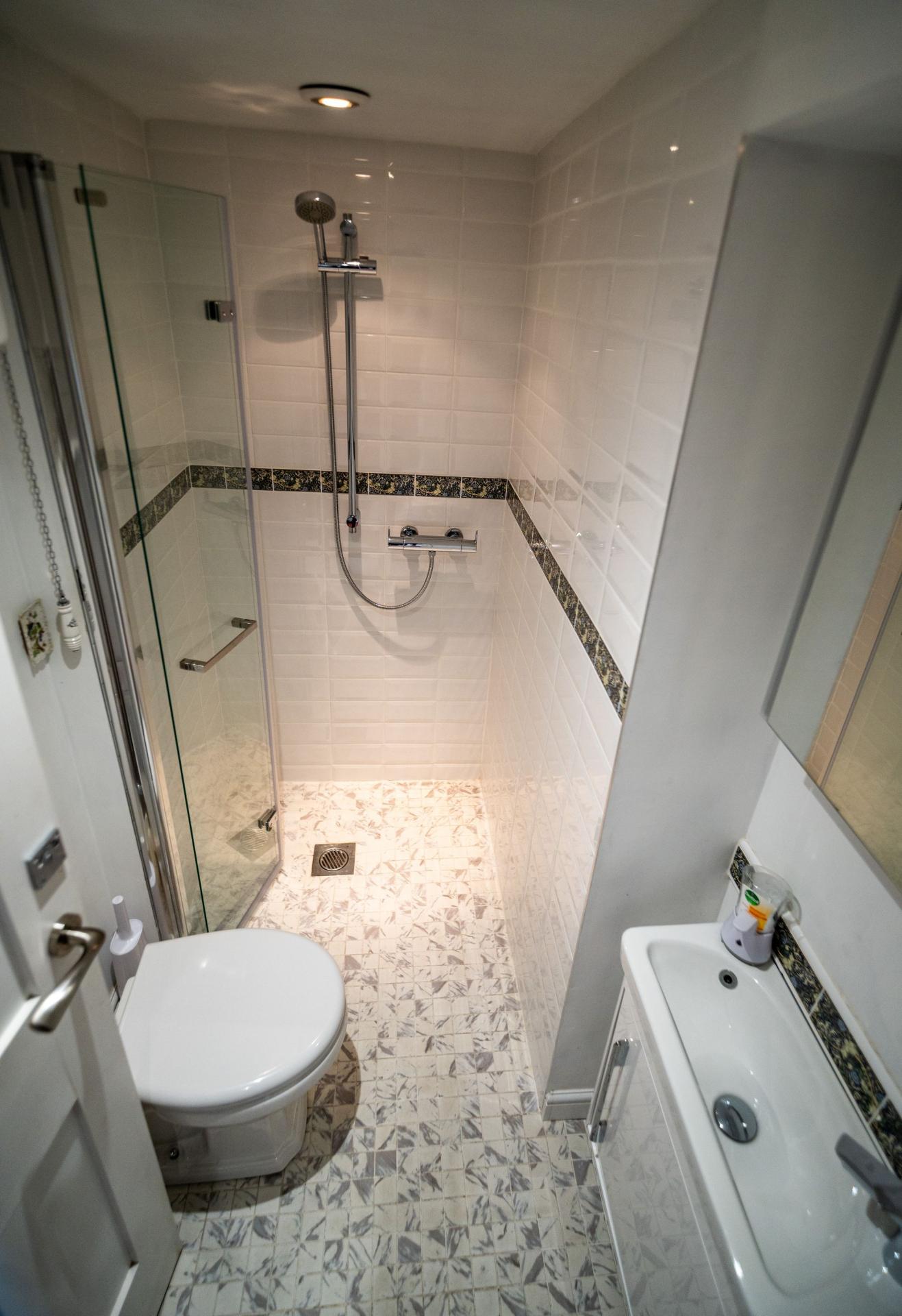 Contemporary space with walk-in shower, low-level WC, vanity basin, and radiator. Access from rear hallway. Attractive William Morris tile border.