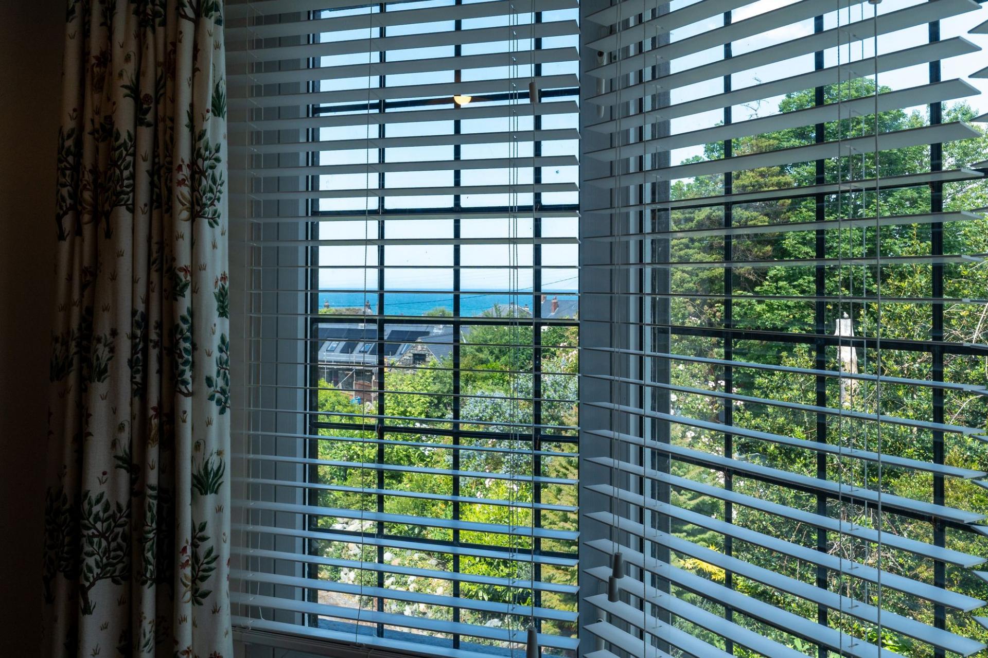 Dual aspect double bedroom with bay window, sink, original fireplace, leaded light windows, sea and hill views, and a charming atmosphere.