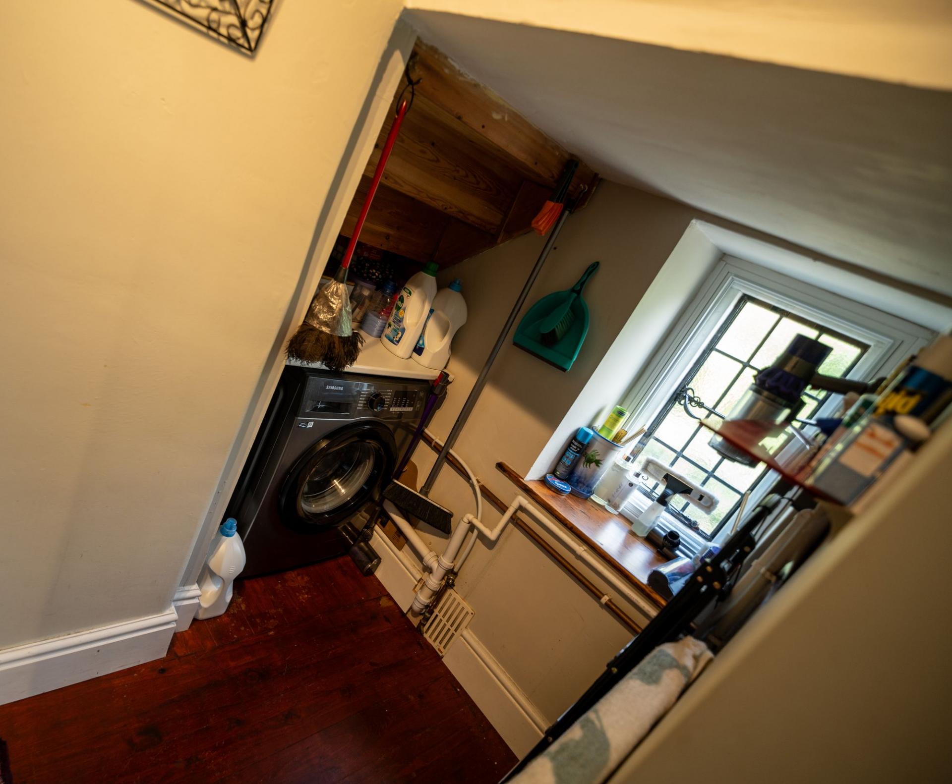 Characterful room with original cupboards, space for fridge freezer, quarry tile flooring, and garden-facing leaded light window. Connects to kitchen and rear hallway. A useful laundry drying rail is located on the ceiling (rise and fall).