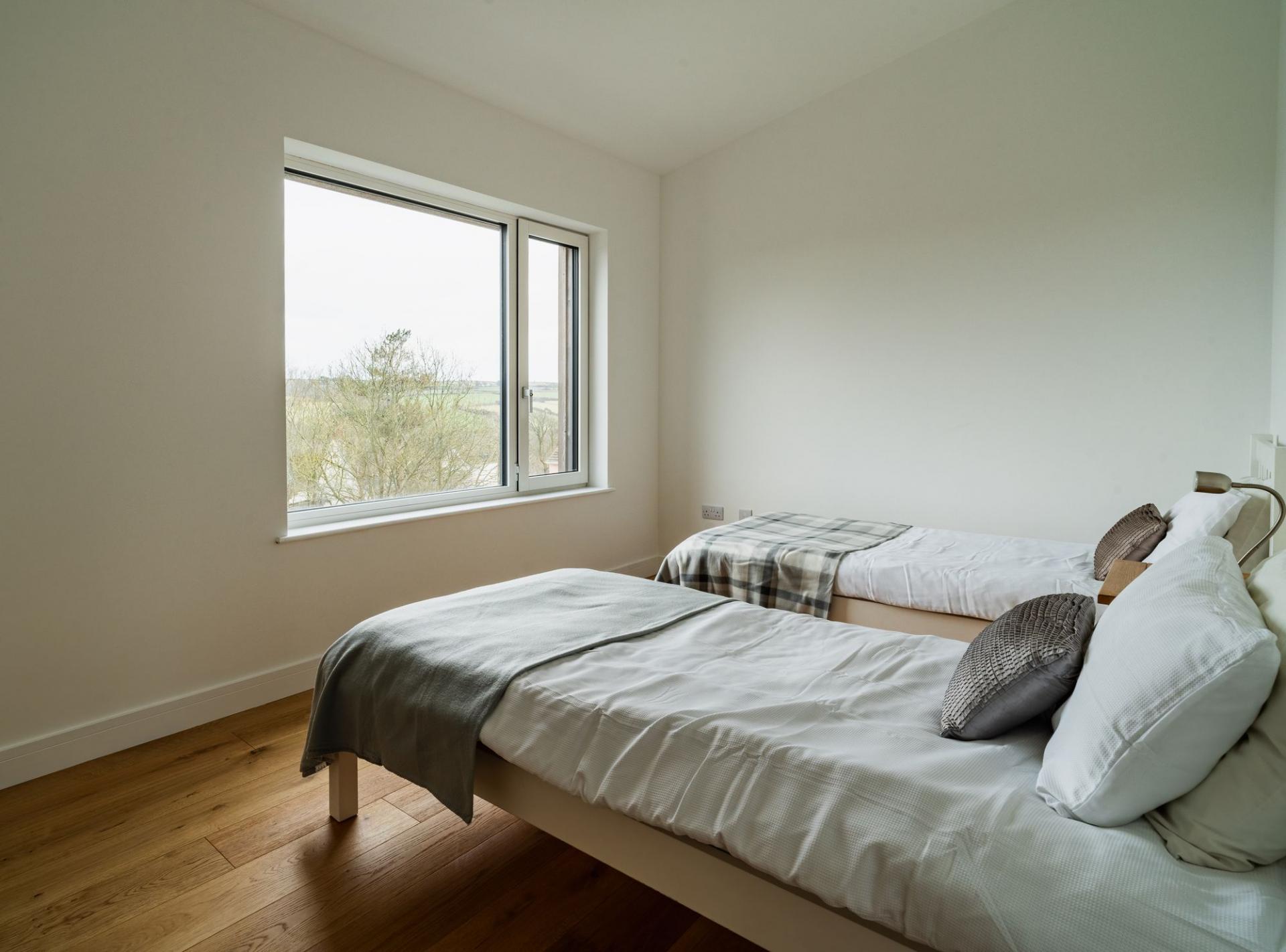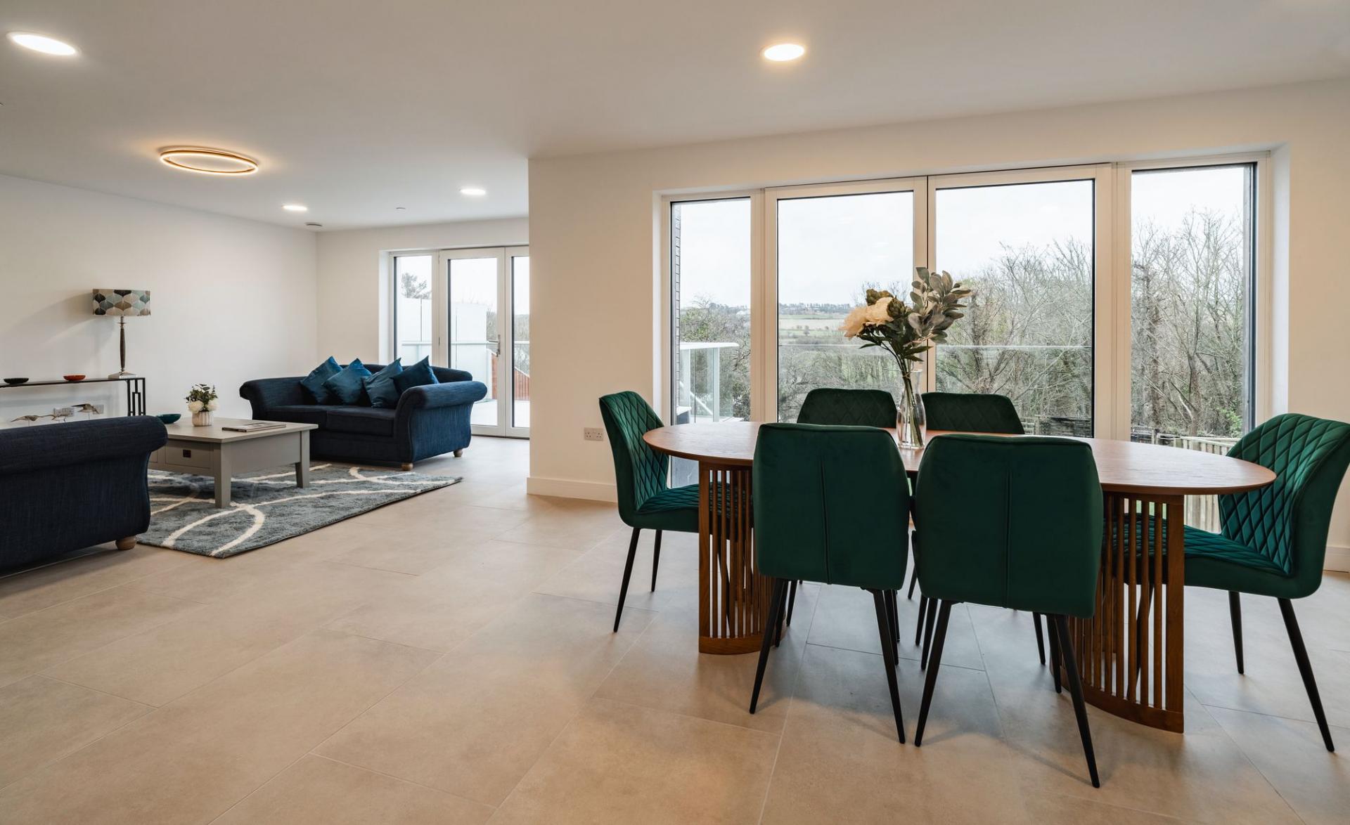 At the heart of each home, an attractive open-plan living area seamlessly connects to a south-facing terrace, boasting expansive countryside views. The integration of living spaces continues with a light-bathed dining area featuring full-height windows and a chic, modern kitchen with dual-aspect views. The large windows in the southern elevation flood the interior with light and contribute significantly to the overall energy efficiency of the homes.