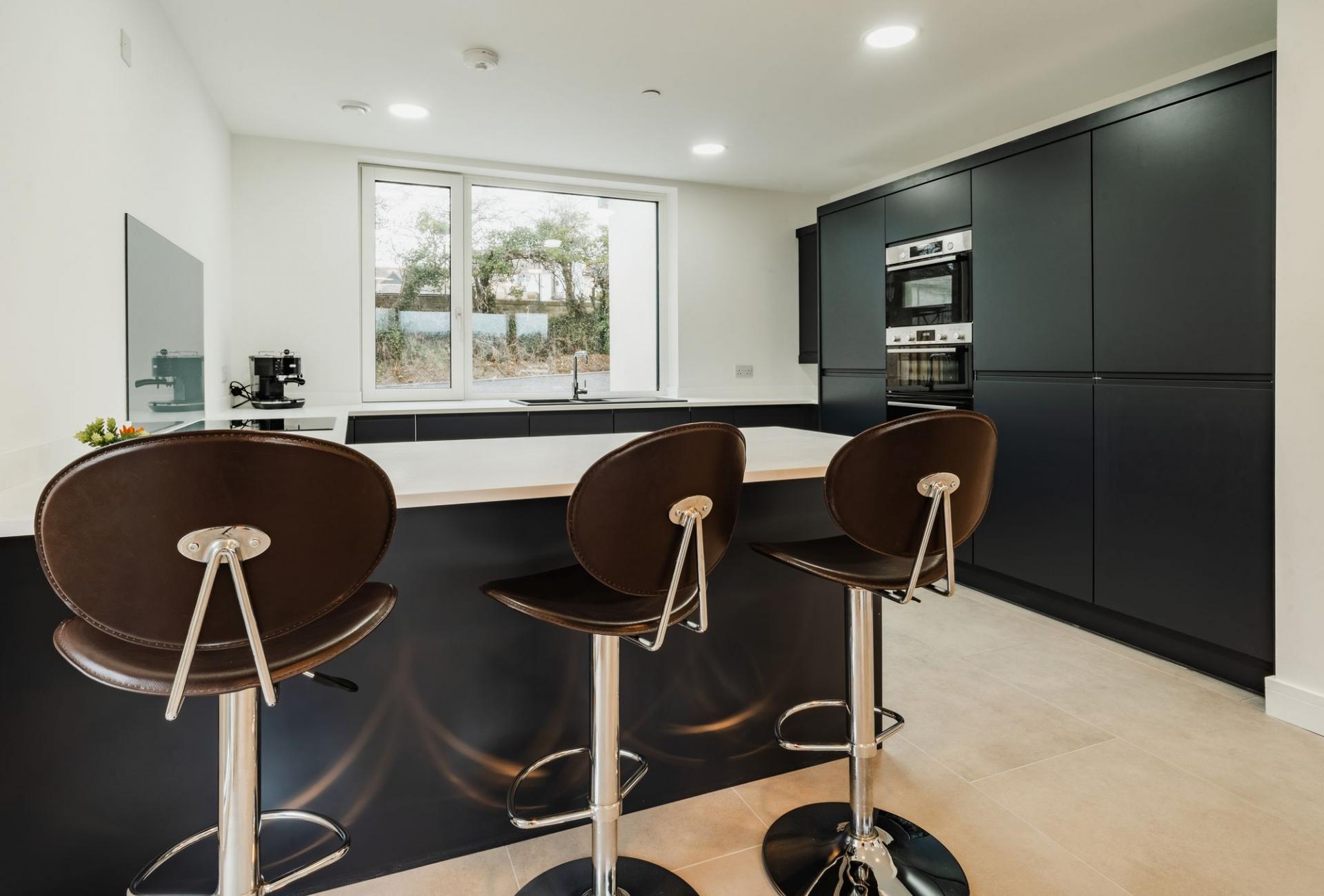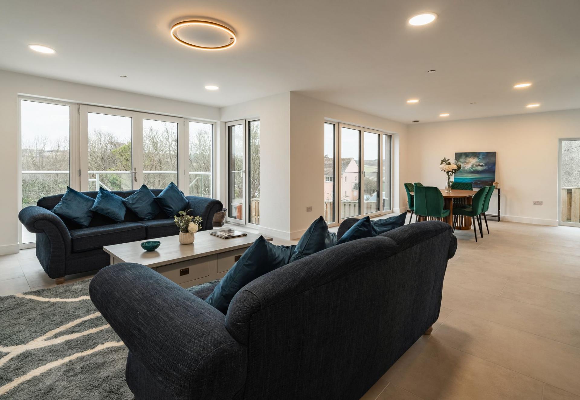 At the heart of the home lies the open-plan living area—a stunning fusion of lounge, kitchen, and dining spaces. Designed to maximise natural light and scenic views, this area is flooded with daylight from the full-height south-facing windows. The sleek, dual-aspect kitchen offers both functionality and flair, while the adjoining dining and sitting areas create the perfect environment for entertaining or relaxing.
