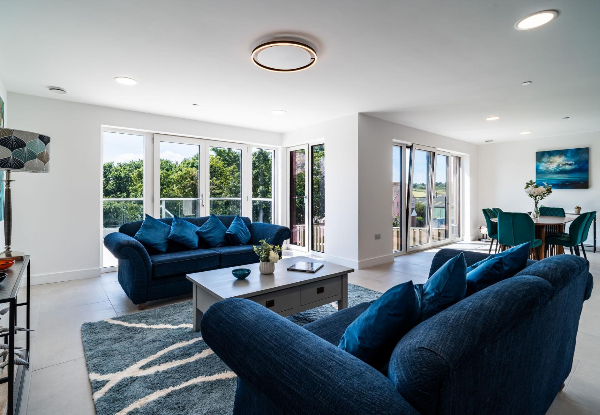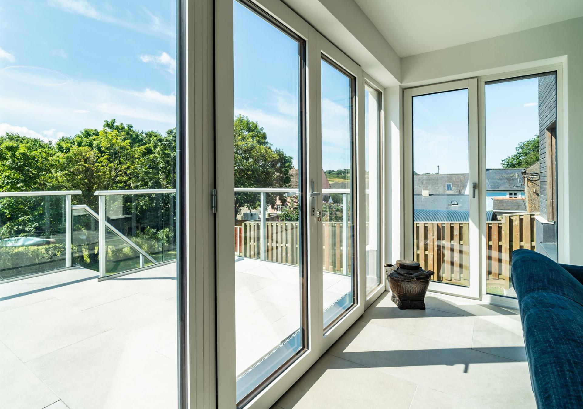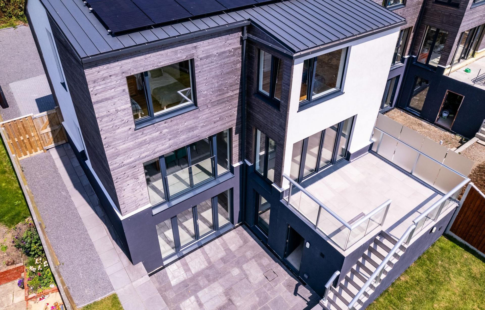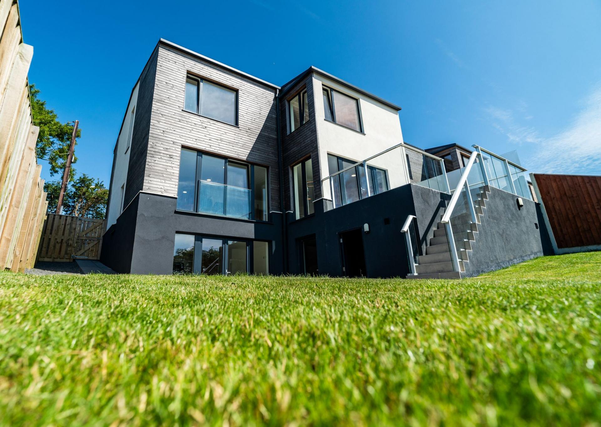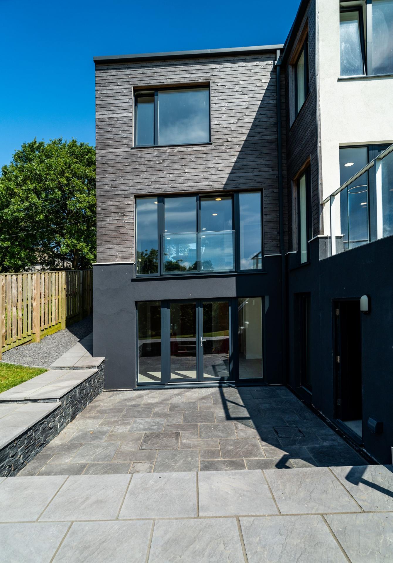 Inside, the home offers a spacious open-plan layout flooded with natural light through expansive triple-glazed windows. The main living space opens out to a glass-fronted balcony and landscaped garden—perfect for relaxing or entertaining. The sleek kitchen is fully fitted with contemporary appliances and clean, minimalist finishes.
