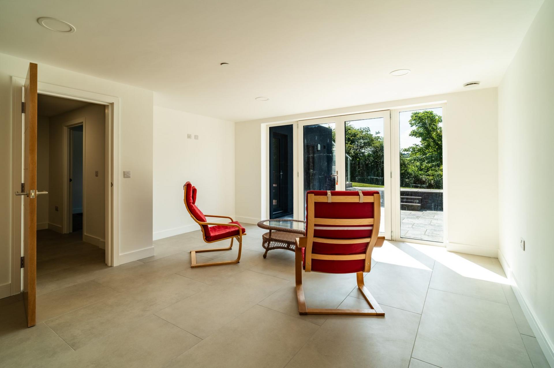A bright and open reception area with floor-to-ceiling glazing, wood flooring, and direct access to the garden terrace. Designed to maximise natural light and passive solar gain in line with Passivhaus principles.