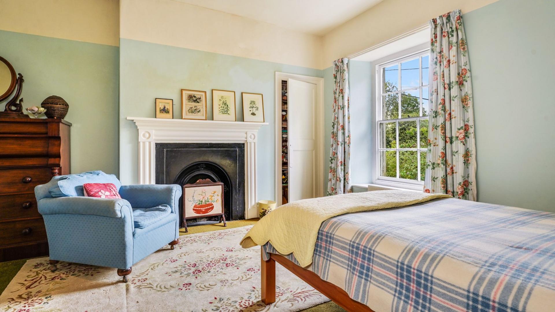 Dual aspect, shuttered sash windows overlooking gardens, large walk-in cupboard, radiator and original Victorian tiled and faux marbled fireplace.