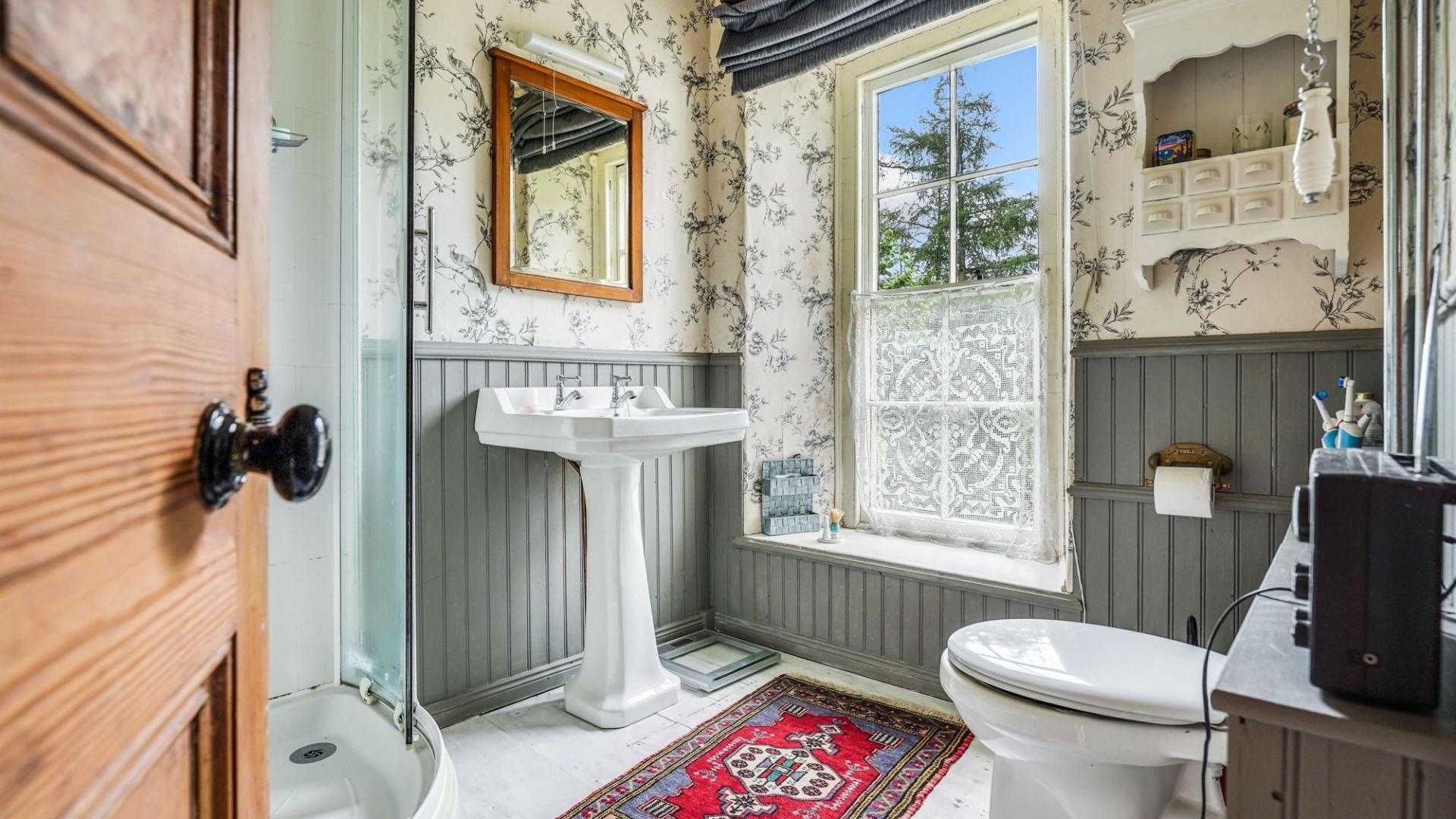 Low level WC, cast iron bath, pedestal hand basin, original airing cupboard, heated towel rail and radiator.