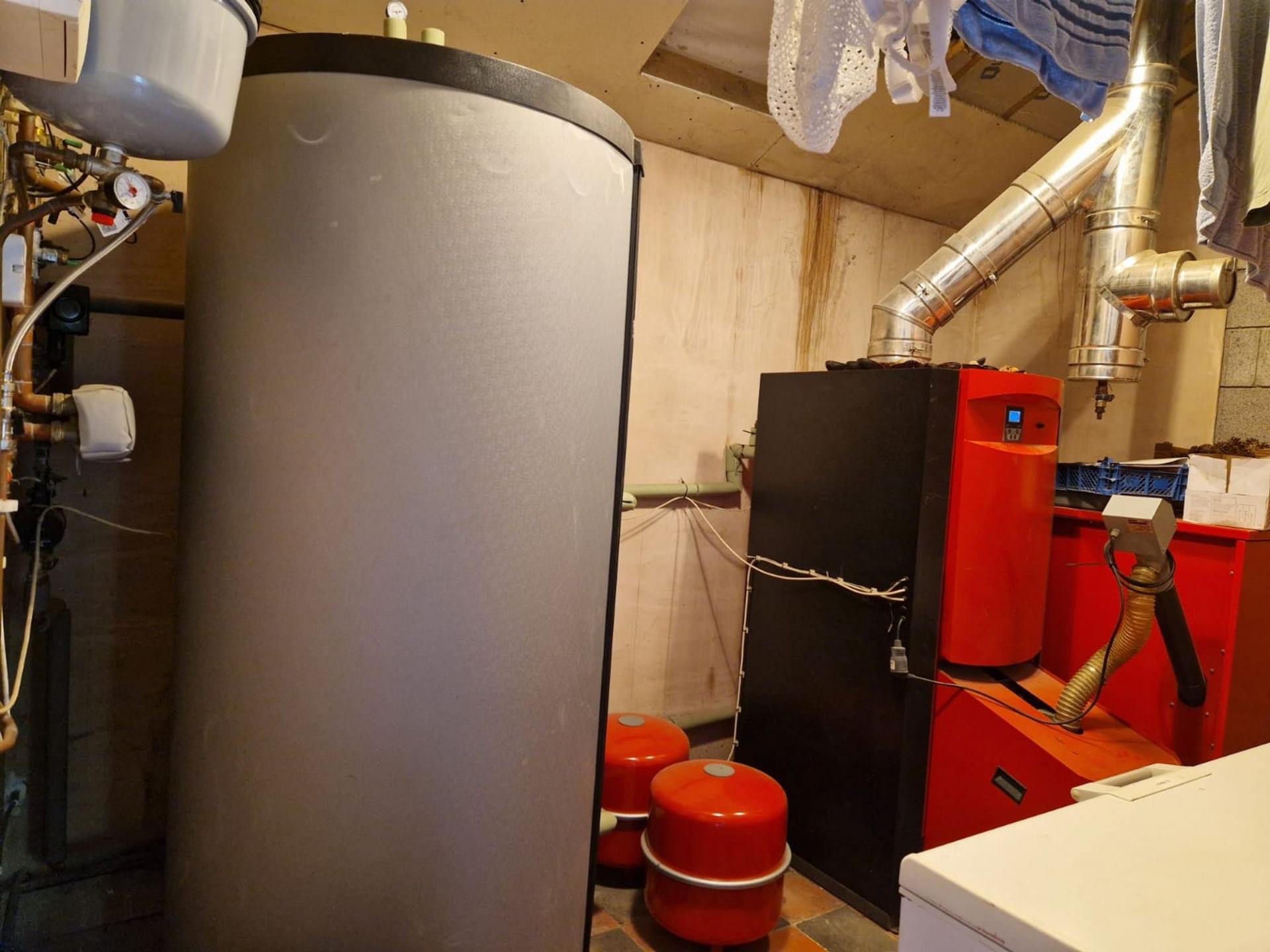 Wood pellet central heating system with pellet silo (12 years of commercial renewable heat incentive grant still to run), hot water buffer and control unit and quarry tile flooring.