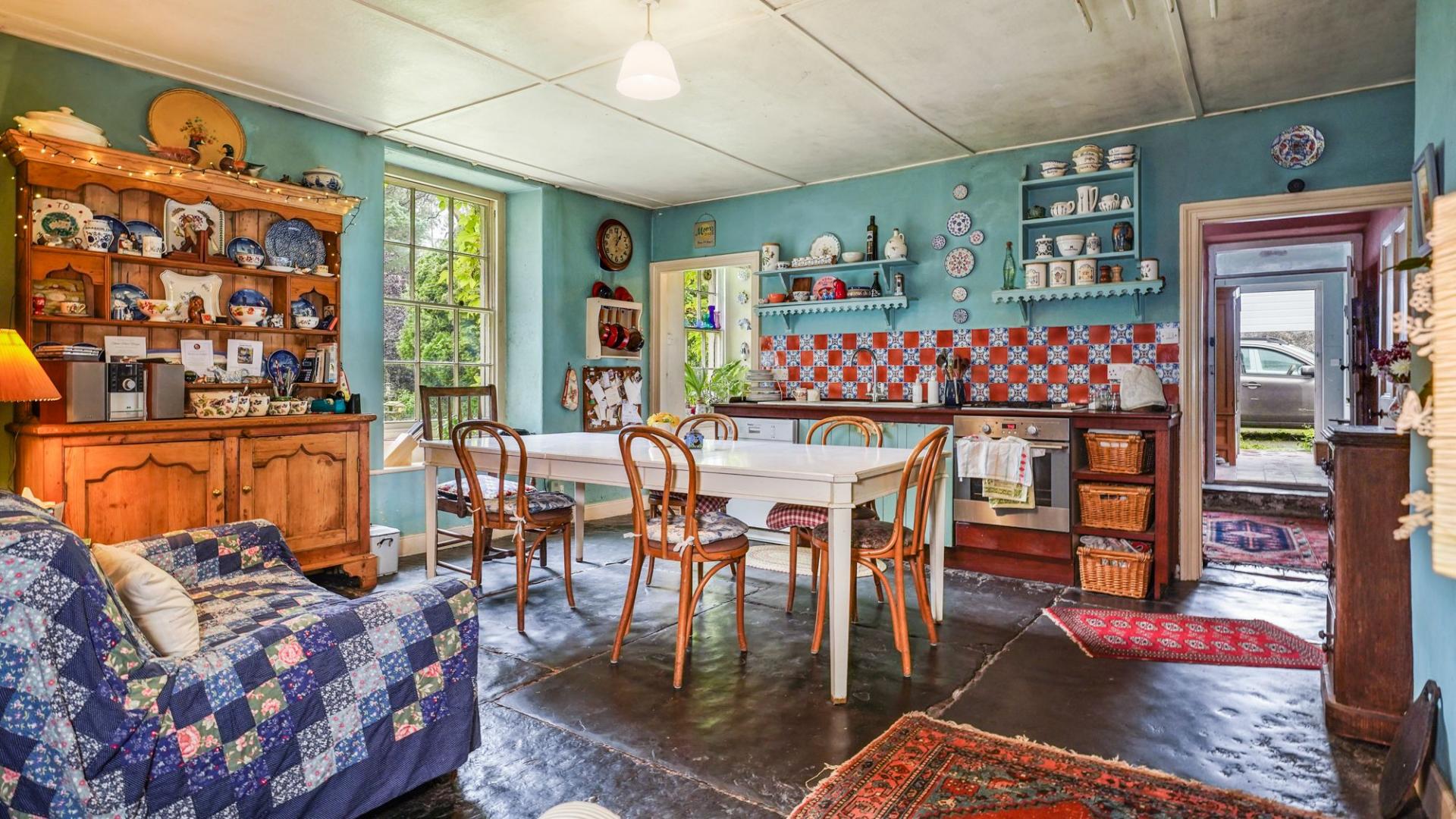 Side aspect, with two original windows overlooking the rear garden, lovely flagstone slate flooring, original bread oven, copper, cooking grate with original kettle crane and an original Belfast sink.