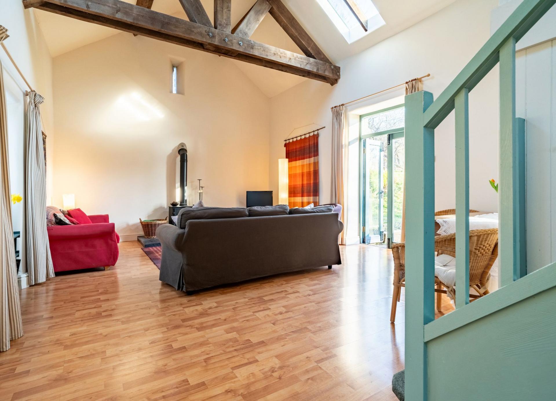 Triple aspect, vaulted ceiling with an A frame roof with patio doors to garden, Windows to the front, Built in wood burner, Laminate wood flooring, Part panelled walls.