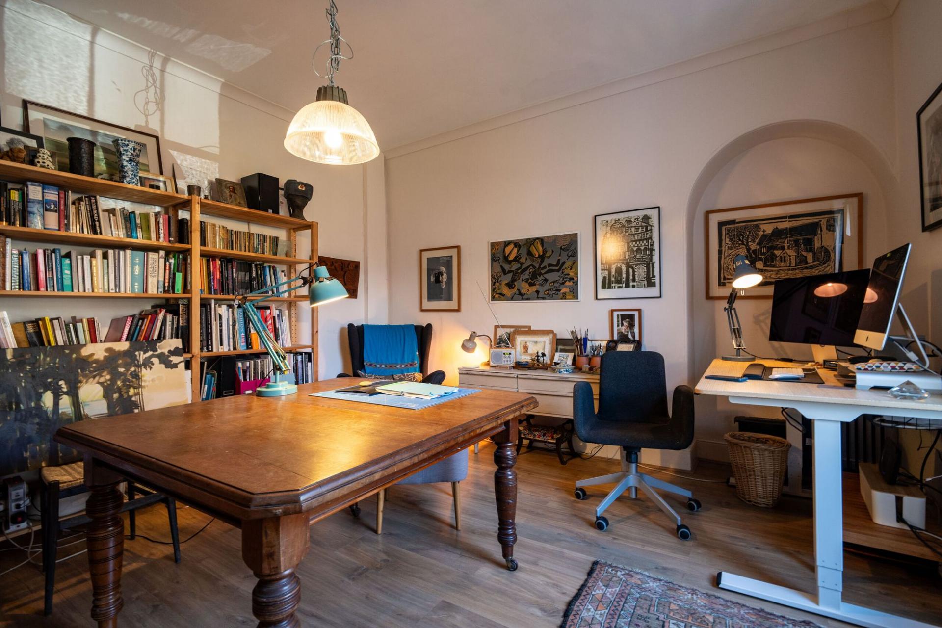 Leading up to a large studio area, well lit with two velux windows, Two radiators, Book shelving, part panelled walls.