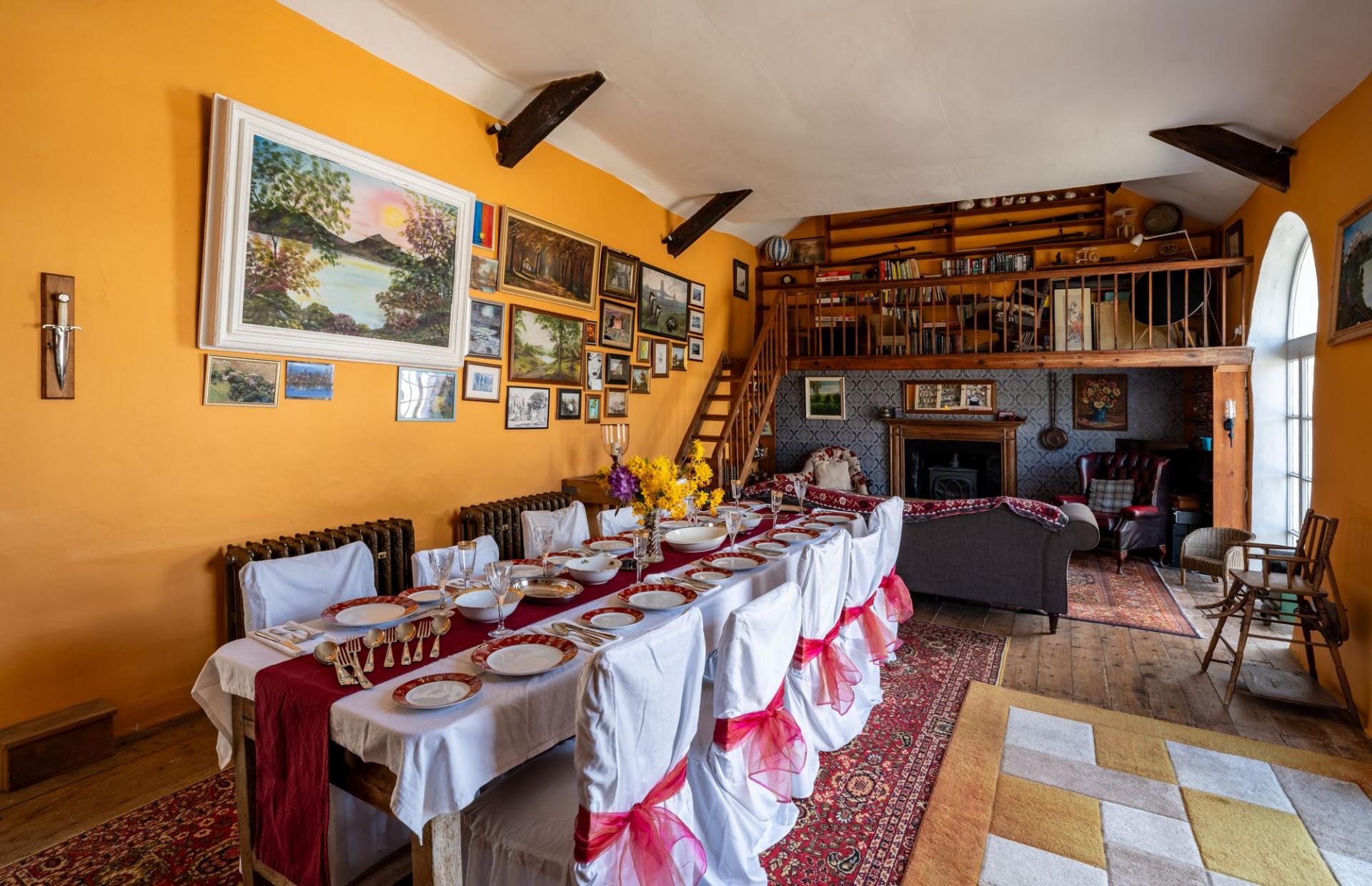 A particular feature of Brynmeheryn is the Hall, a generous and atmospheric room with soaring ceilings, floor-to-ceiling windows and doors, a wood-burning stove, three cast-iron radiators, and stairs to a galleried mezzanine area with shelving — ideal as an artist’s retreat, home office, or additional reception room.