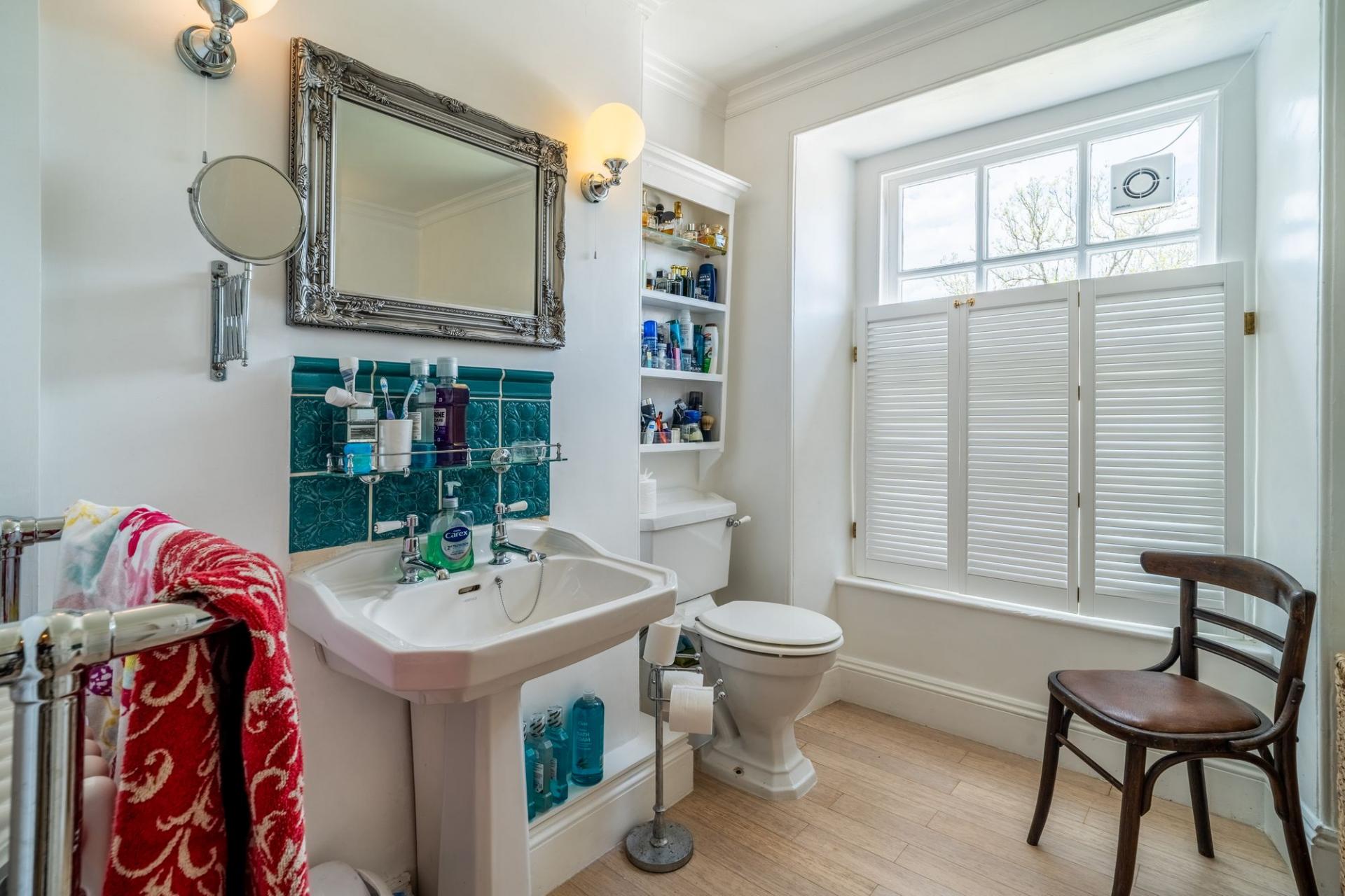 Ground Floor Bathroom – Well-appointed and of good size, comprising panel-enclosed bath with shower attachment and screen, vanity basin, low-level WC, attractive shelving, louvered shutters, and a traditional cast-iron radiator.