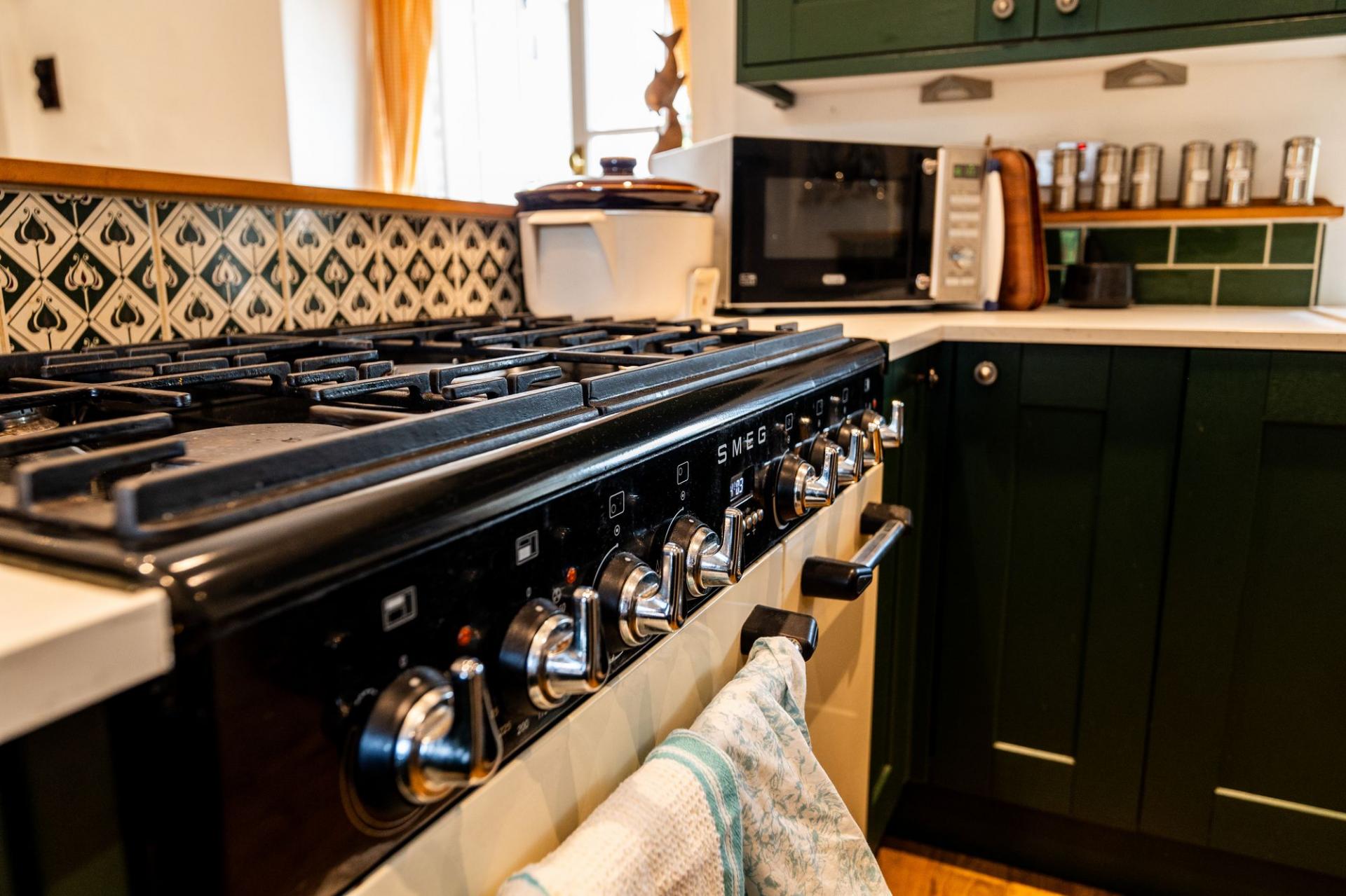 Accessed via a stable-style door. This traditional country kitchen enjoys an original fireplace housing a built-in bread oven, a range of base and wall units, single drainer sink with mixer tap, space for a range-style gas cooker, part-tiled walls, and a large walk-in pantry with slate worktop and garden views.