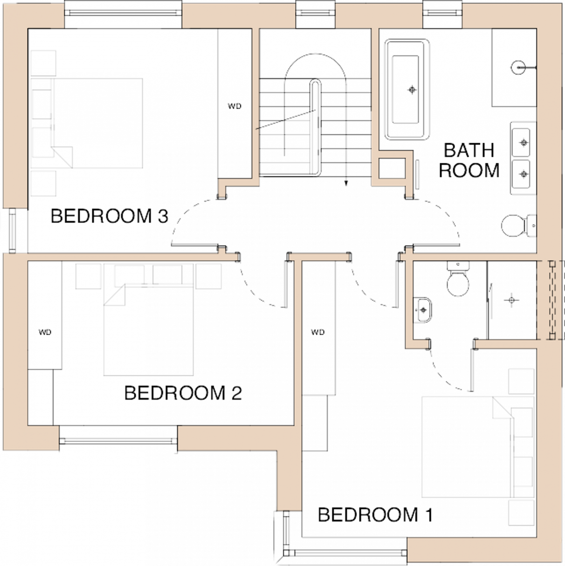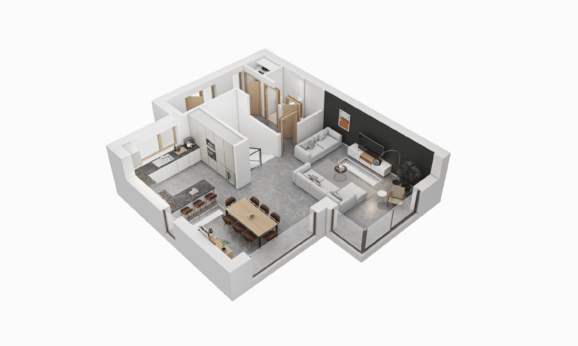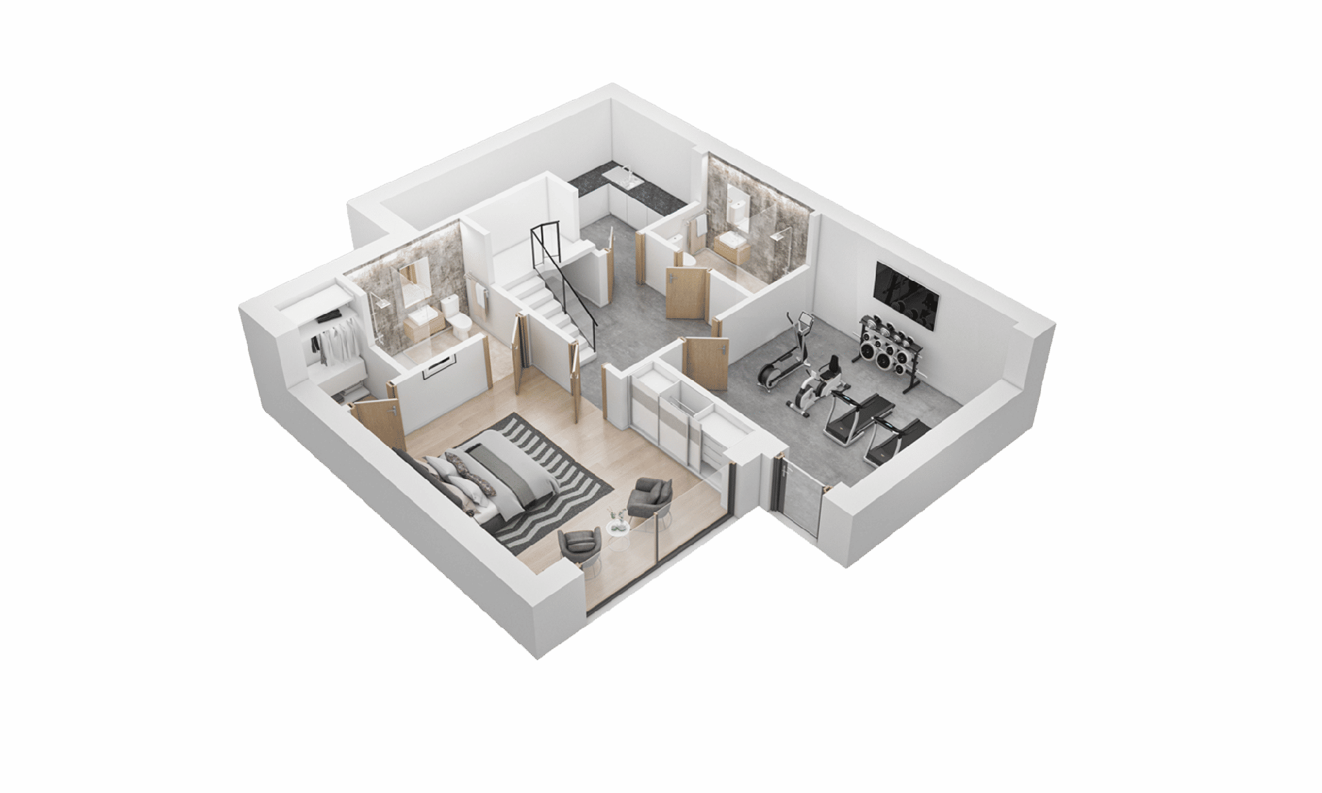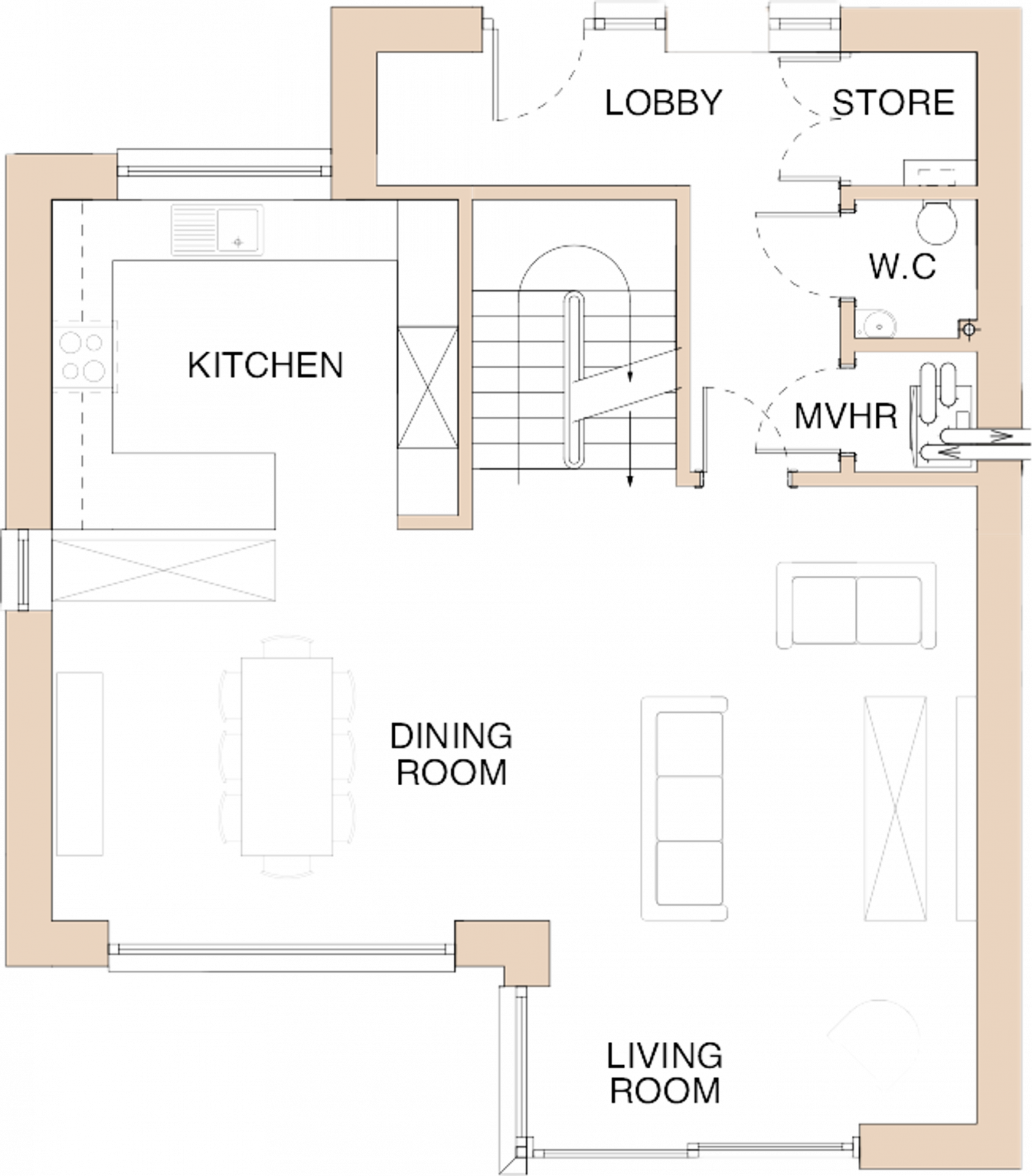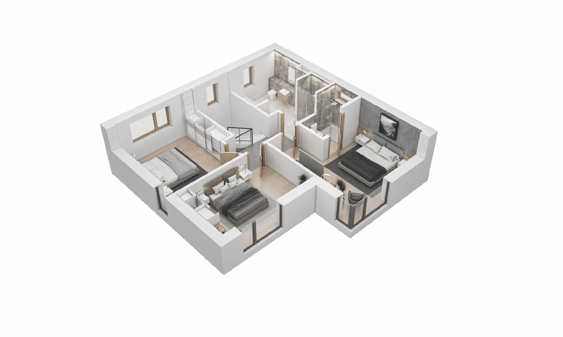 At the heart of each home, an attractive open-plan living area seamlessly connects to a south-facing terrace, boasting expansive countryside views. The integration of living spaces continues with a light-bathed dining area featuring full-height windows and a chic, modern kitchen with dual-aspect views. The upper levels of the homes are just as impressive, featuring a luxurious master bedroom with an ensuite and spectacular views, alongside two additional bedrooms and a modern family bathroom.