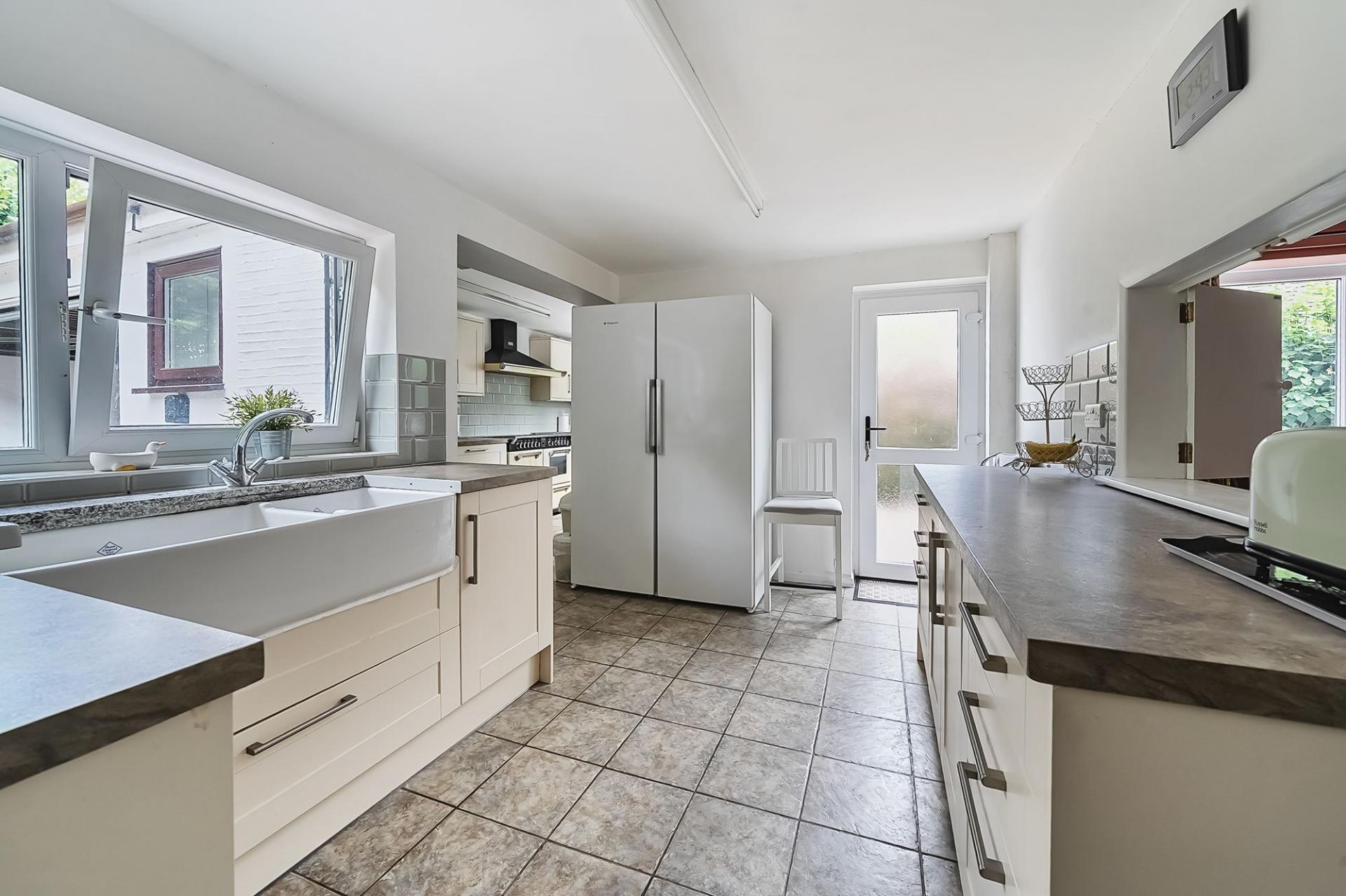 A bright and practical kitchen fitted with a range of modern base and wall units, tiled splashbacks, and ample worktop space. The design includes an integrated Belfast-style sink beneath a large window overlooking the garden, and a serving hatch into the dining room, ideal for family living and entertaining. There is plenty of space for a range-style cooker, fridge-freezer, and additional appliances, with tiled flooring throughout for easy maintenance.