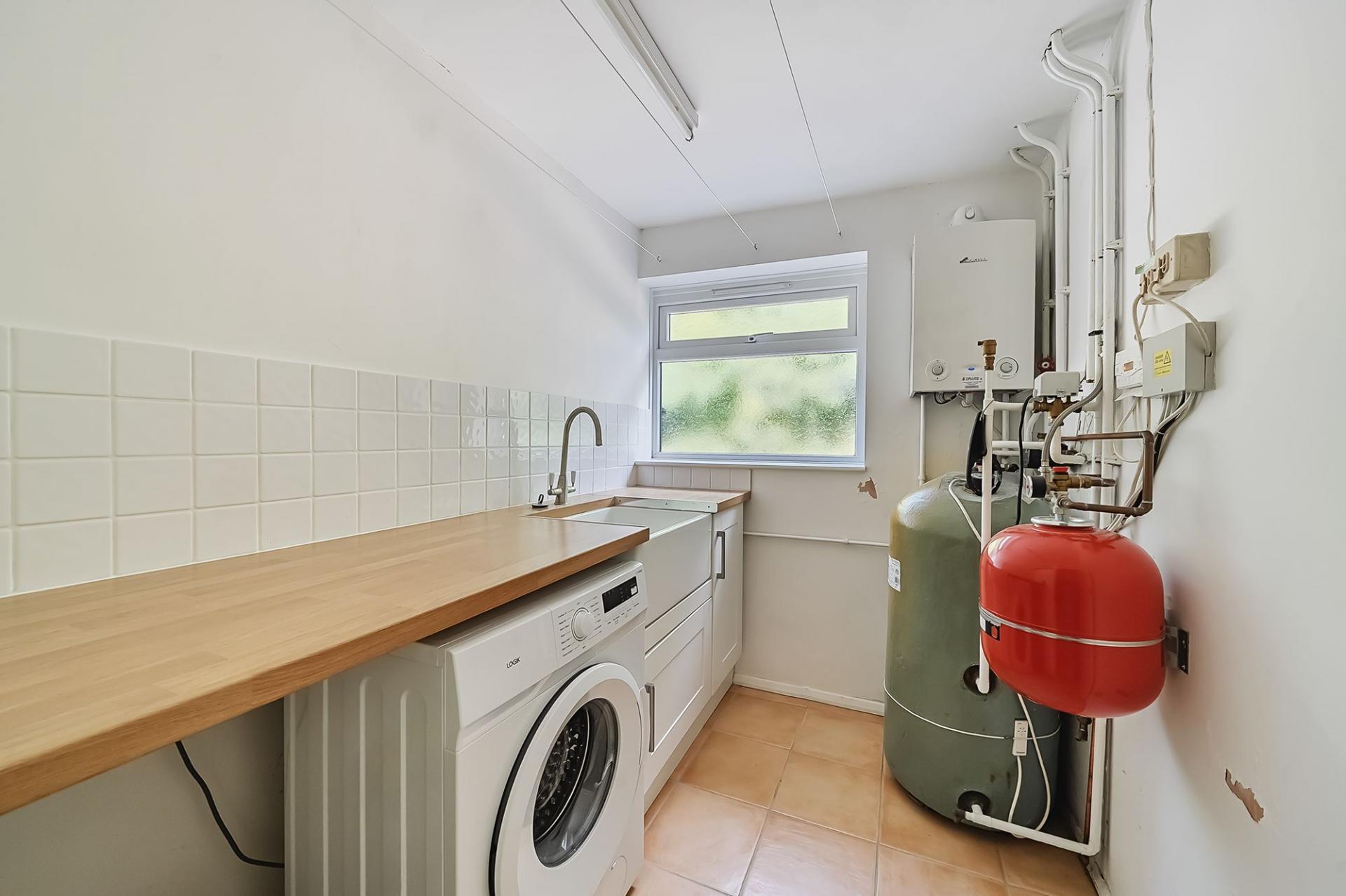 A practical utility space fitted with work surfaces, sink unit and tiled splashbacks, with plumbing for laundry appliances. The room also houses the boiler and hot water cylinder, while a rear window provides natural light. An ideal space for everyday household tasks and additional storage.