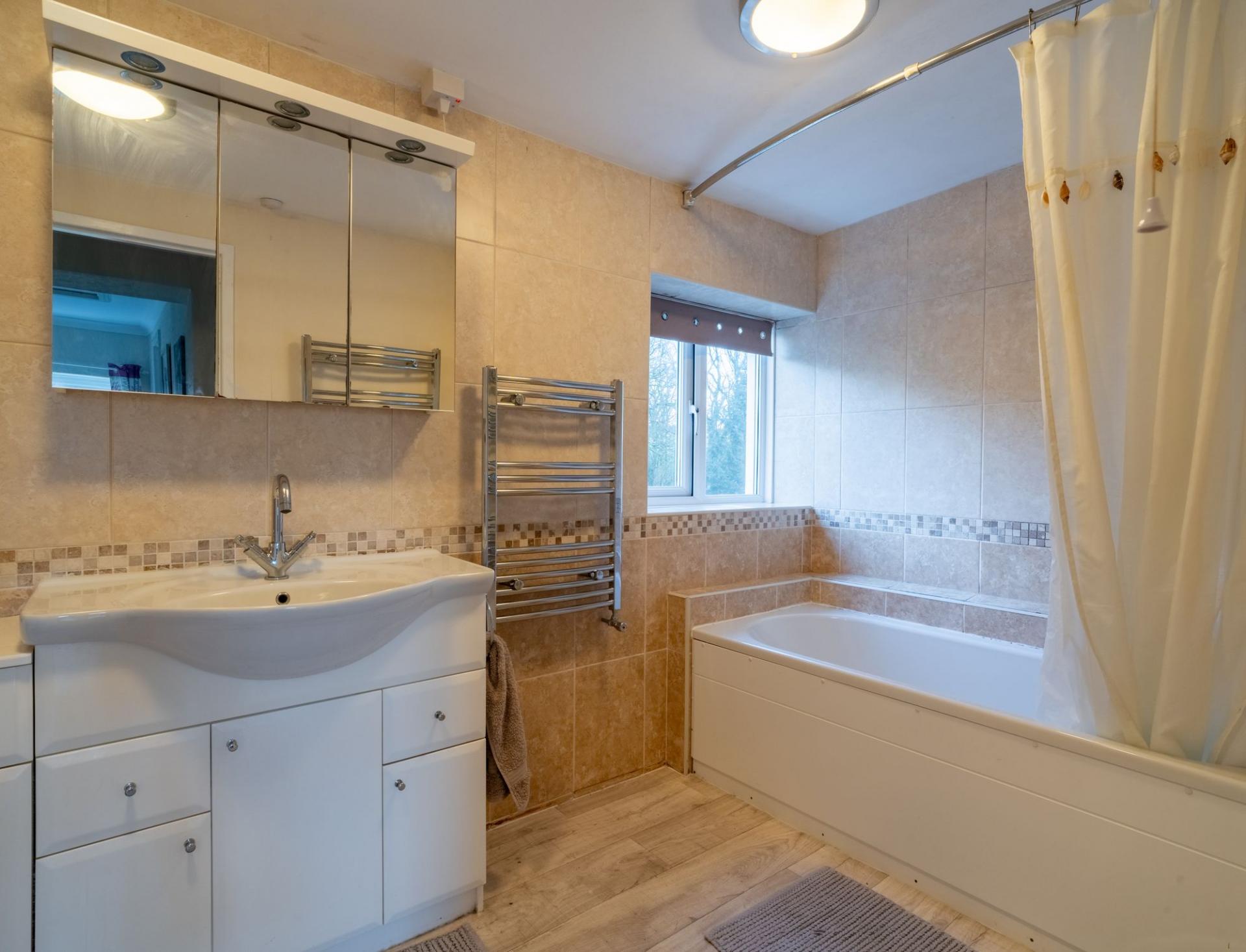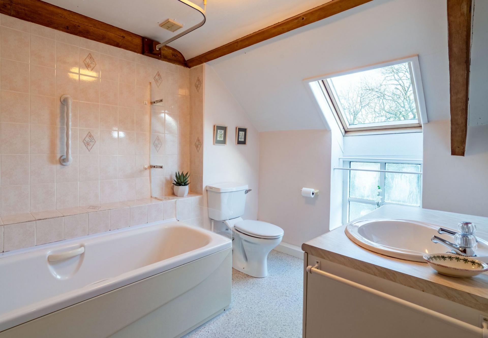 With part sloping ceiling with exposed beam. Vinyl floor covering. Radiator. Double glazed 'Velux' window. Double glazed window. Part tiled walls. Extractor fan. Wall light with shaver point. 3 Piece suite in white comprising WC, wash hand basin with fitted storage cupboard beneath and panelled bath with plumbed-in shower over, curtain and rail.