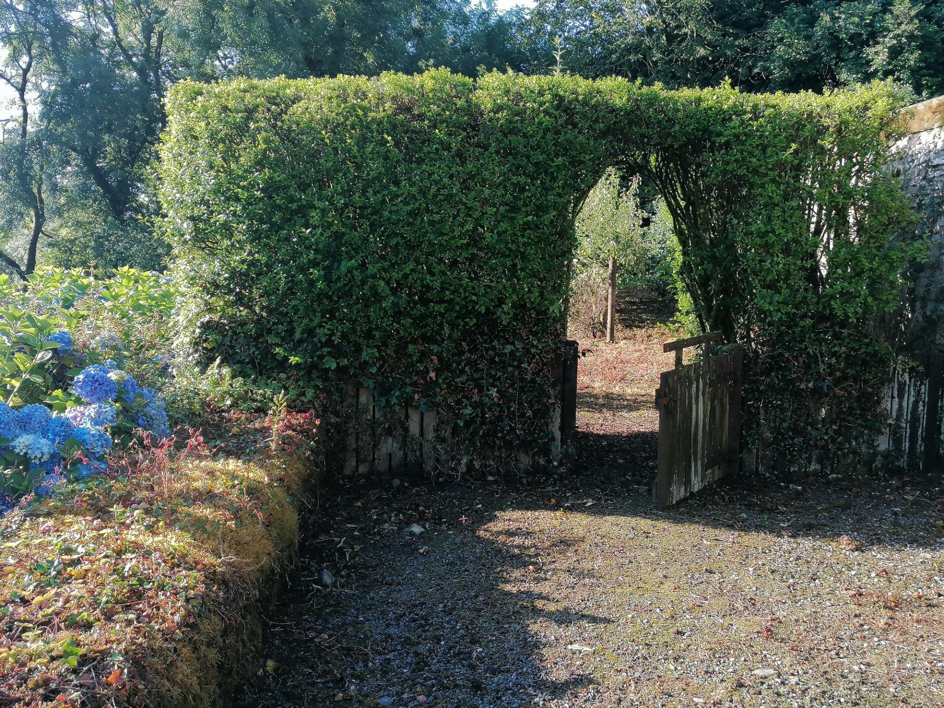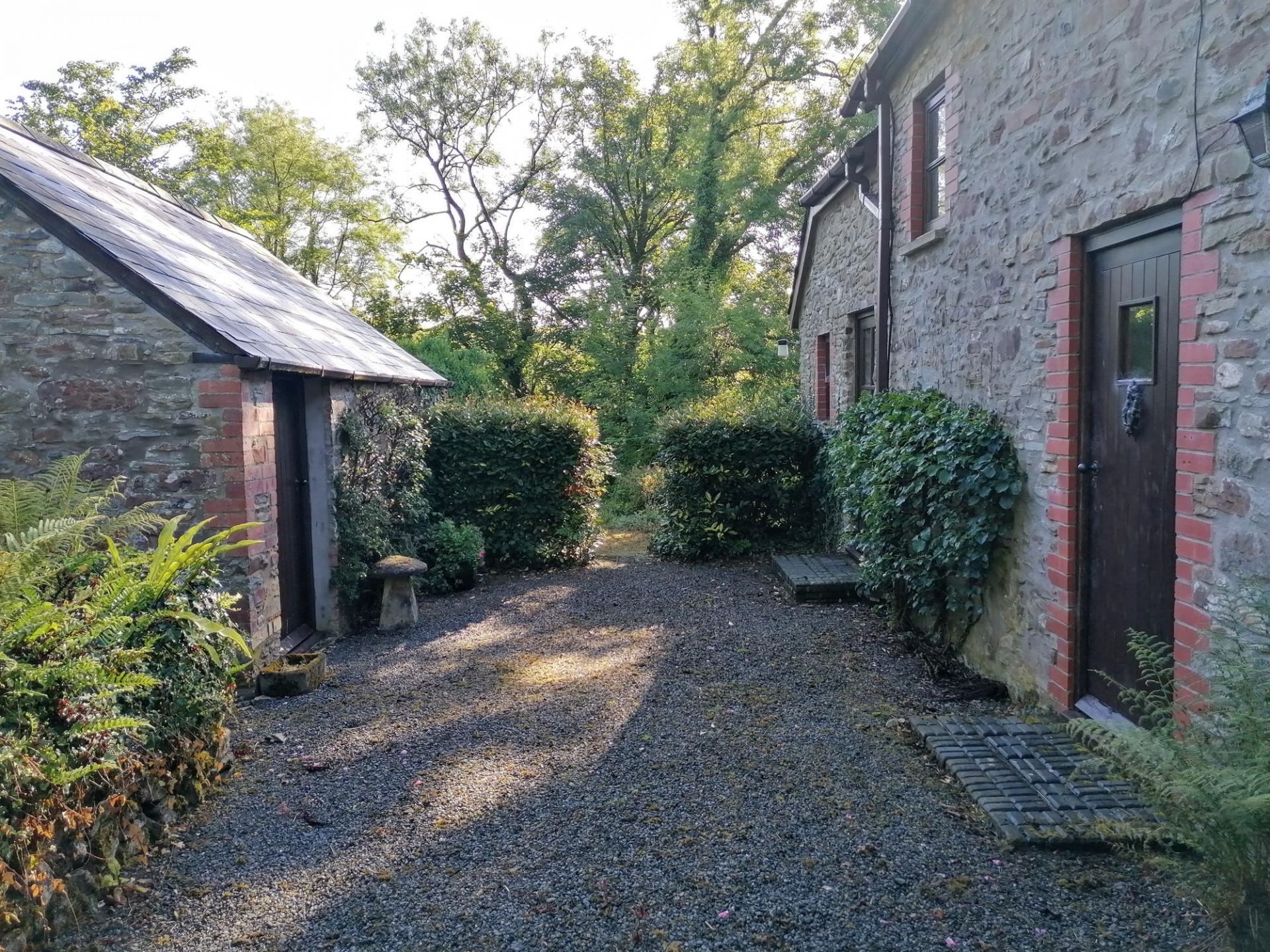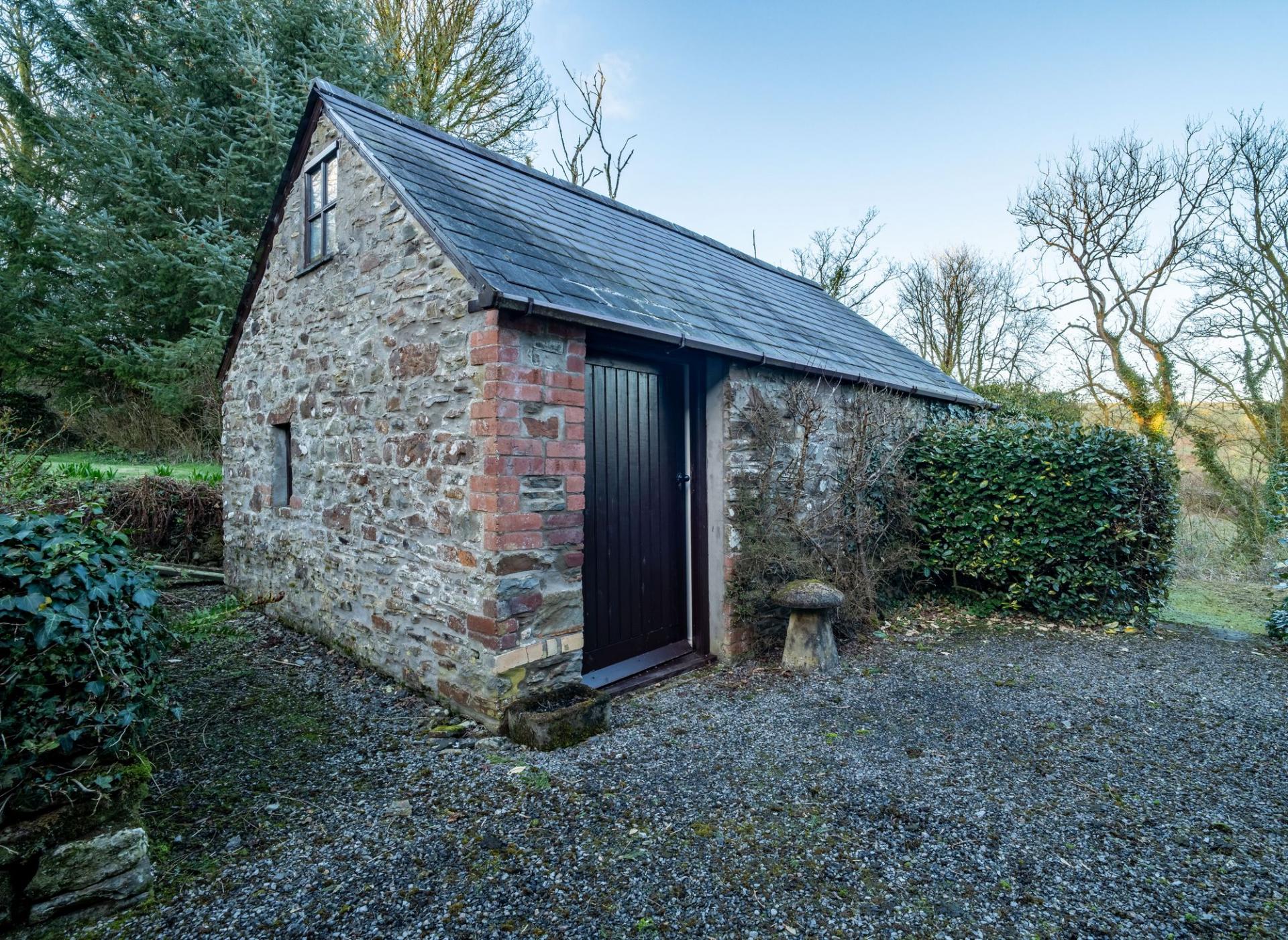 The pig sties front onto a part walled Orchard Courtyard with apple and pear trees. Beyond and below the outbuildings and orchard is a further lawned area that is bounded/interspersed with mature trees which runs down to the stream and gives access to the 2.3 acres of sloping woodland.