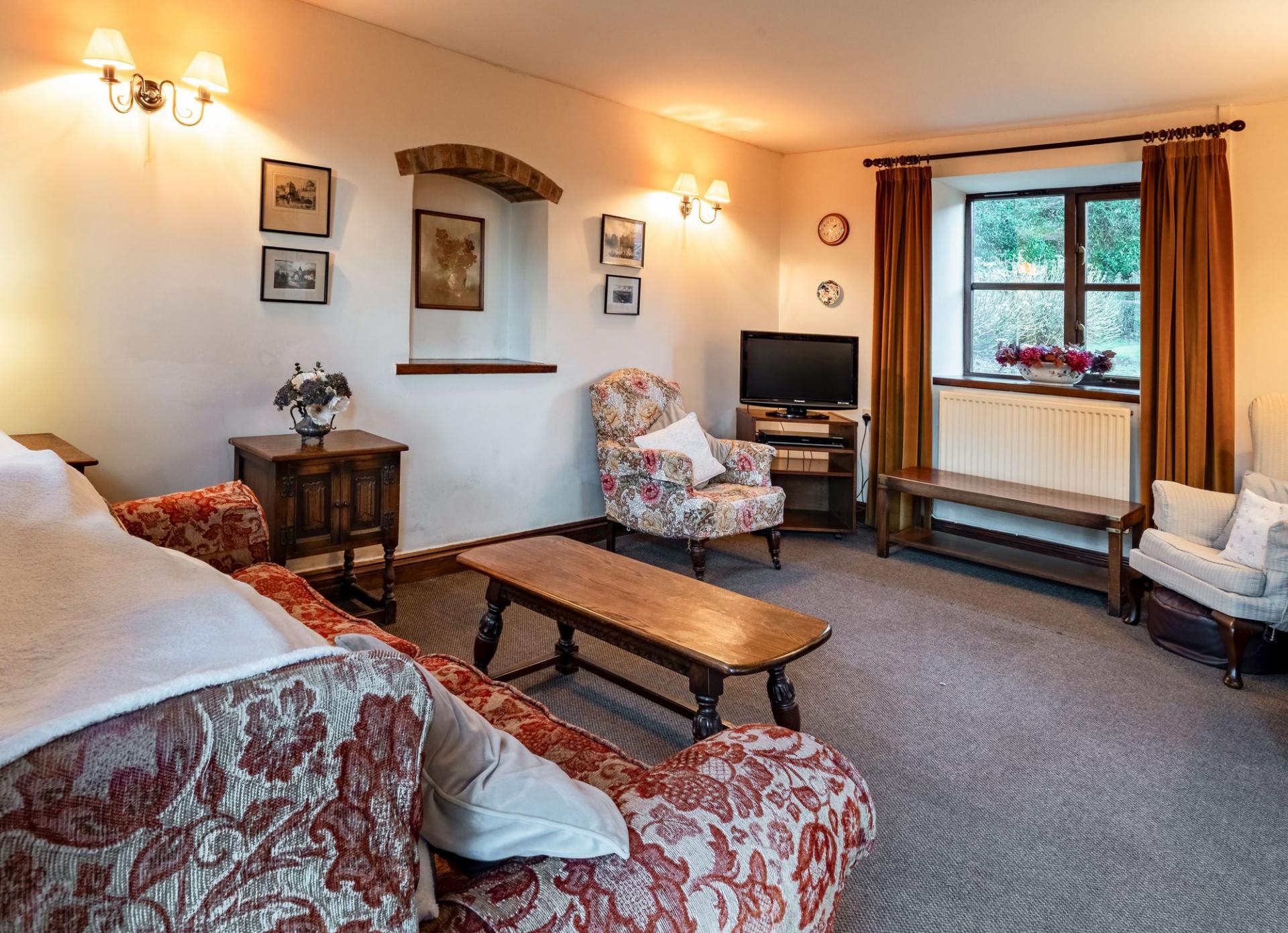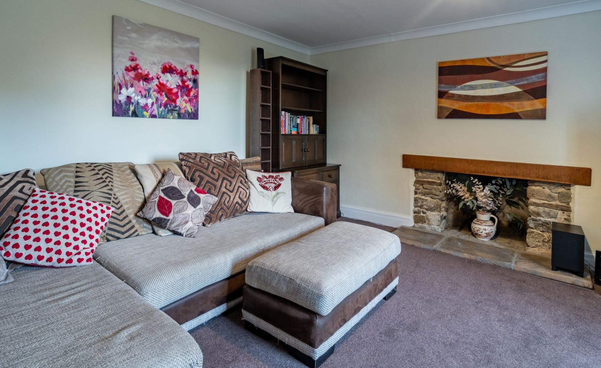 'L' shaped with double aspect. Ledge and Brace boarded door to the yard at rear. 3 Radiators. 3 Wall light fittings. Mains smoke alarm. C/h thermostat control. 3 Double glazed windows. Feature brick arched alcove. Understairs storage cupboard. Telephone point. 10 Power points. Arched opening to