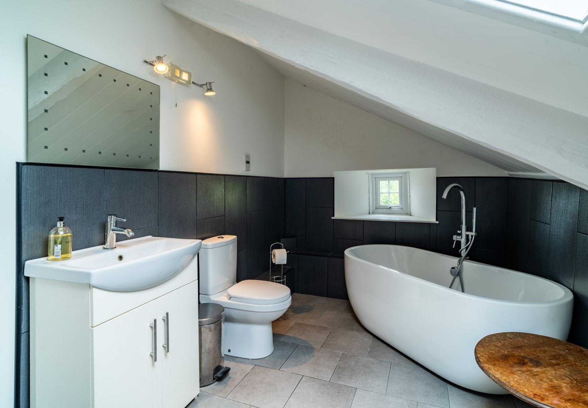 Refitted with slipper bath, vanity basin, WC, radiator, Velux window, tiled floor, part-tiled walls, and a further small double-glazed window.