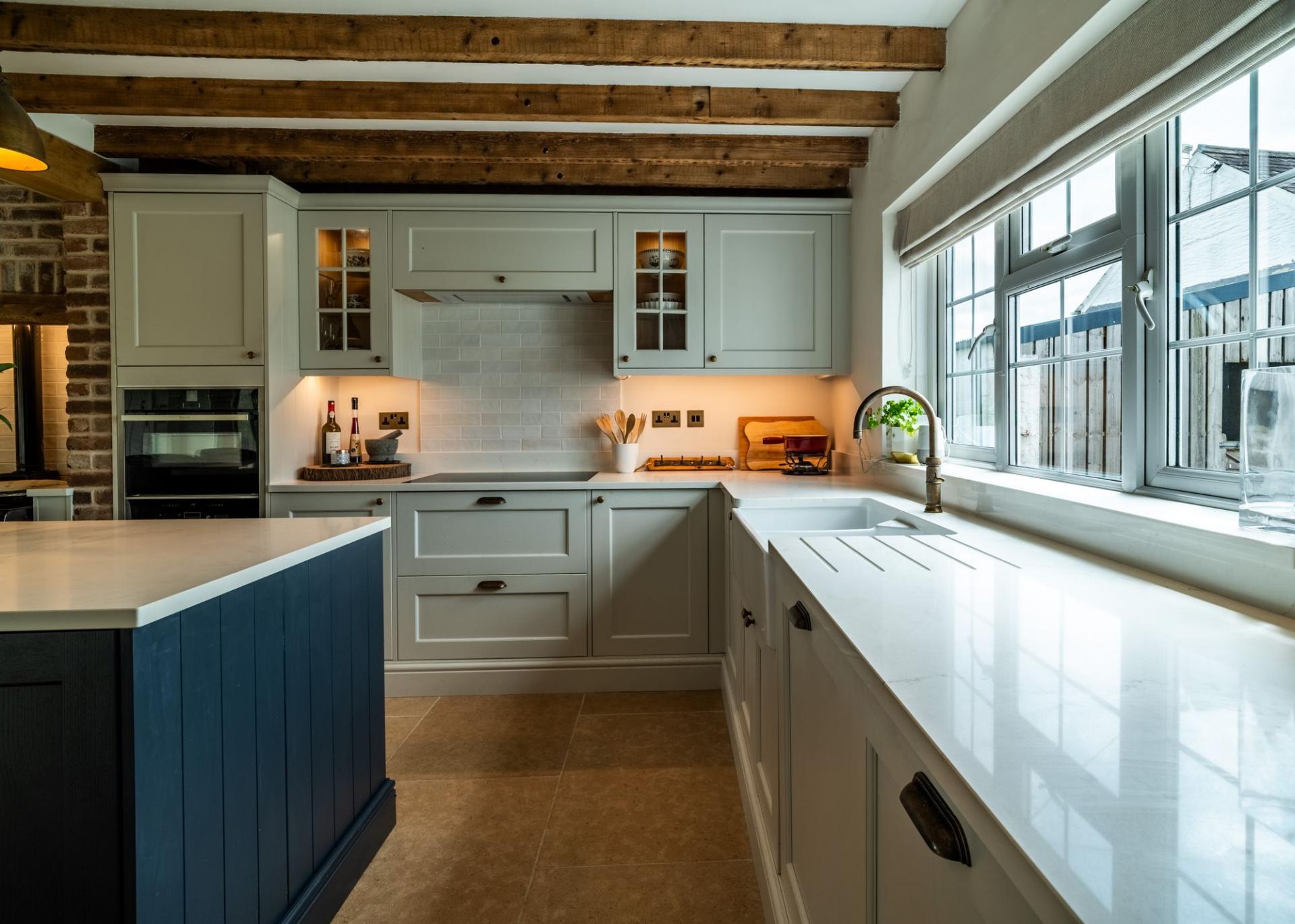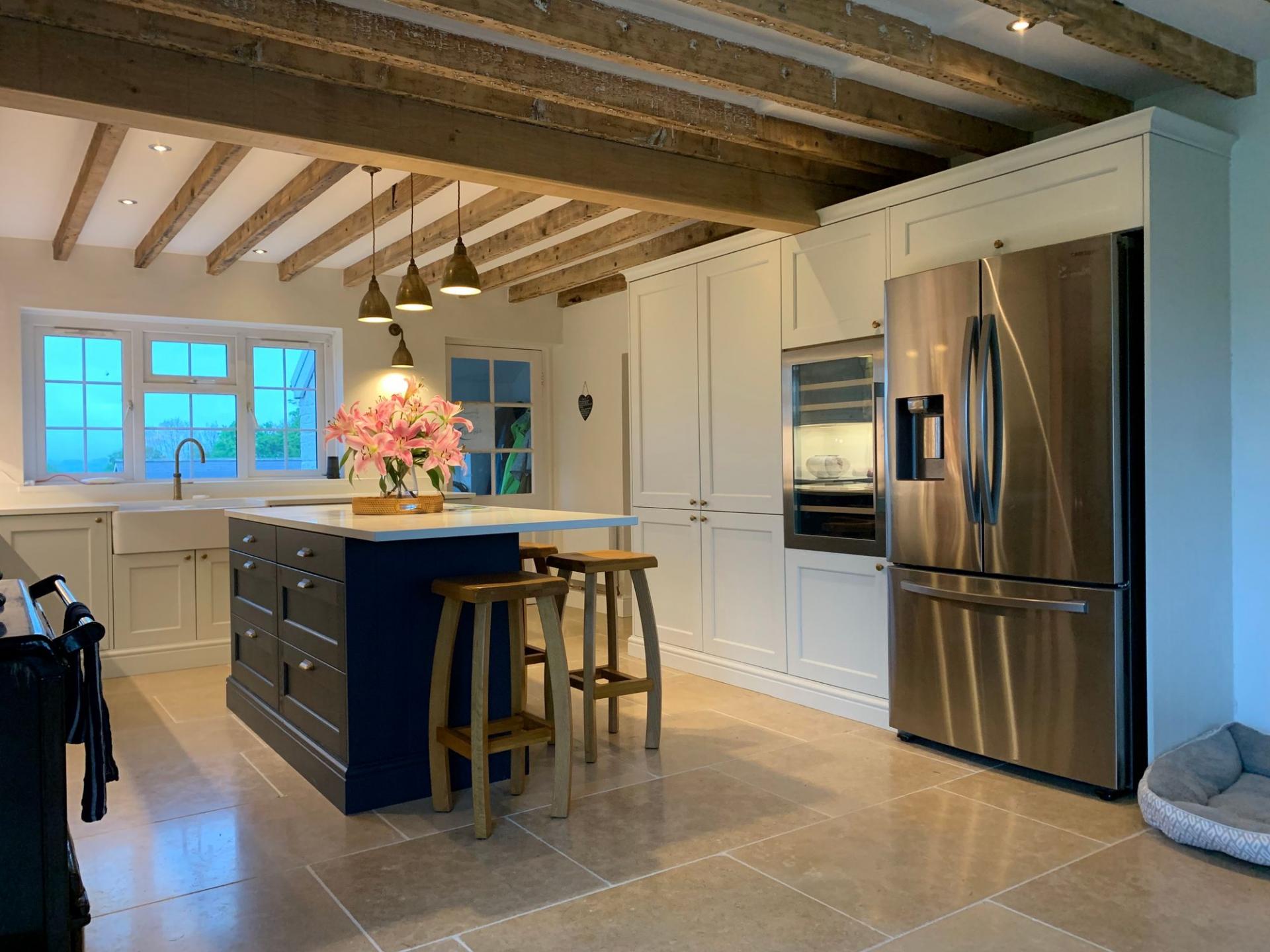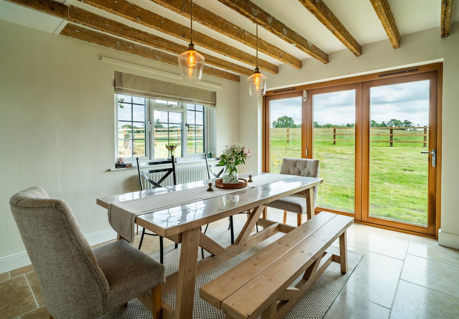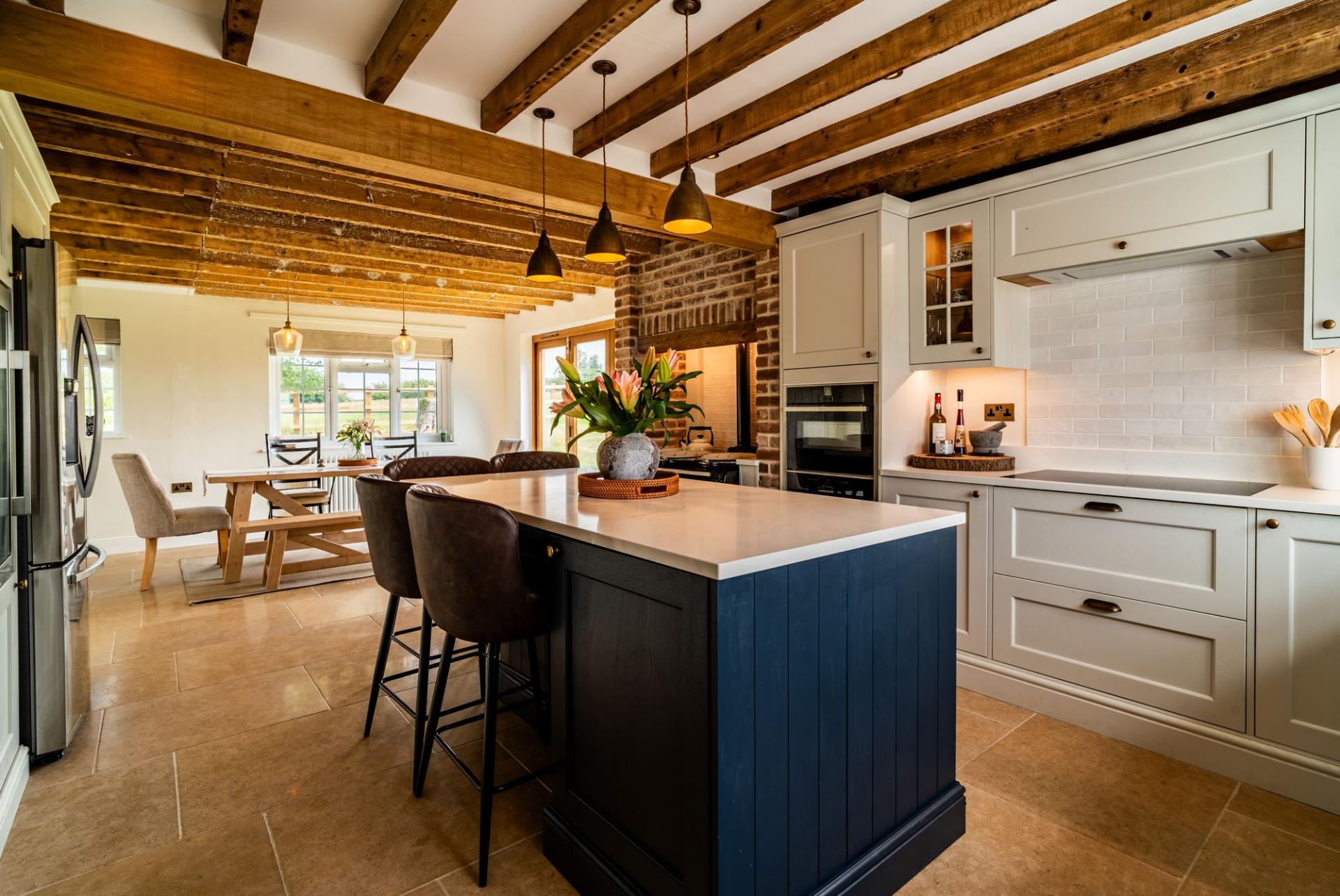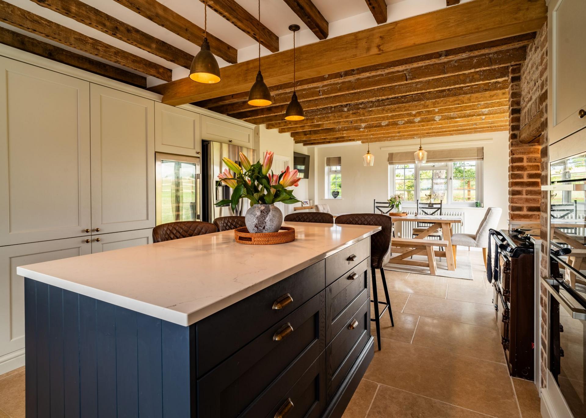 A beautifully appointed space with a comprehensive range of solid wood shaker base units, Quartz worktops, integrated double oven, 5 ring induction hob with extractor, integrated wine/beer fridge, and double-bowl ceramic butler. A refitted AGA adds charm, while bi-folding doors and two large UPVC windows offer panoramic garden views. The space flows seamlessly into a family dining area with limestone tiled floors and exposed beams. Further entrance porch/boot room (1.75m x 1.65m)