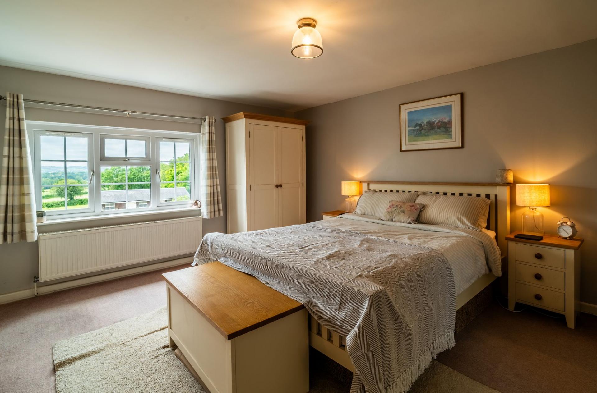 Generous front-facing double with beautiful views over the courtyard and paddocks. Two built-in wardrobes, radiator, and access through to: