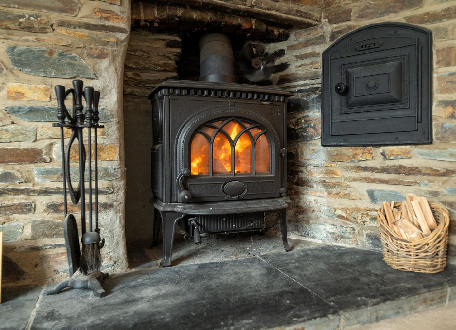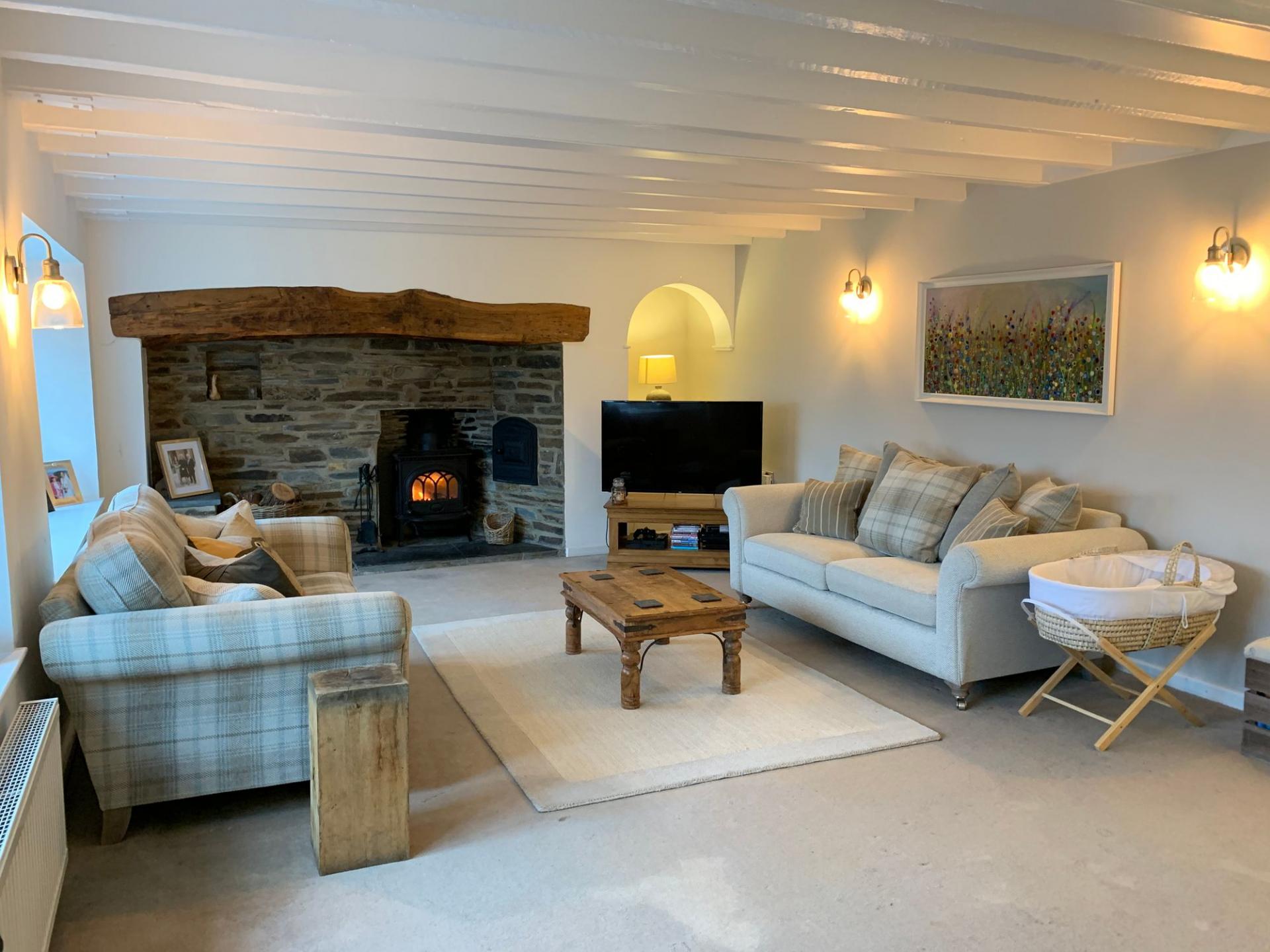 A charming dual-aspect reception room with exposed stonework, feature fireplace housing a wood-burning stove and original bread oven. Two radiators, recessed display area, beamed ceiling and countryside views.