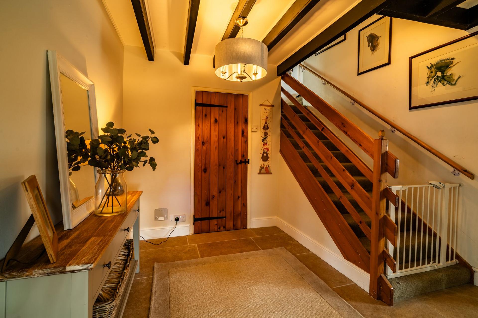 UPVC glazed front door opens into a welcoming tiled porch, flowing into a spacious entrance hall with beamed ceiling, tiled floor, under-stairs storage and stairs rising to the first floor.