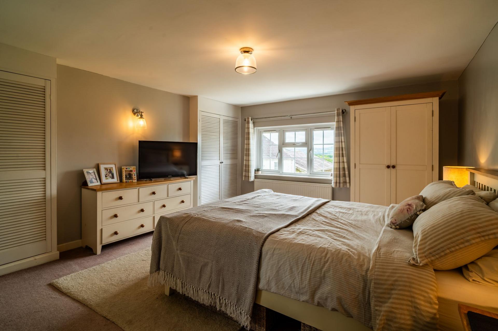 Double bedroom with front aspect, two built-in wardrobes, radiator, and rural views.