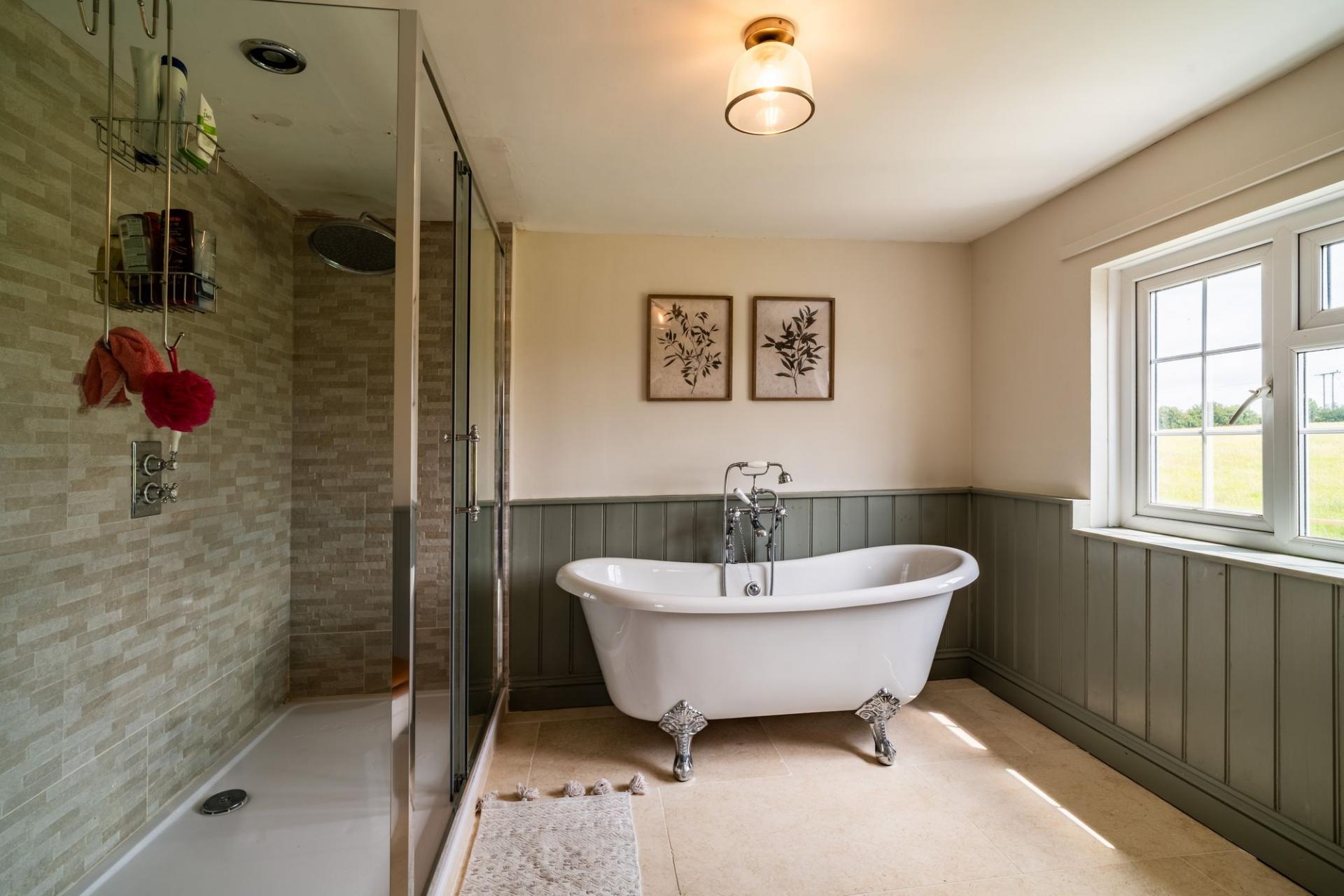 Luxurious four-piece suite including slipper bath with handheld shower, large walk-in rainfall shower, vanity unit with basin, low-level WC, heated towel rail, part wood-panelled walls, underfloor heating and stunning countryside views from the large double-glazed window.