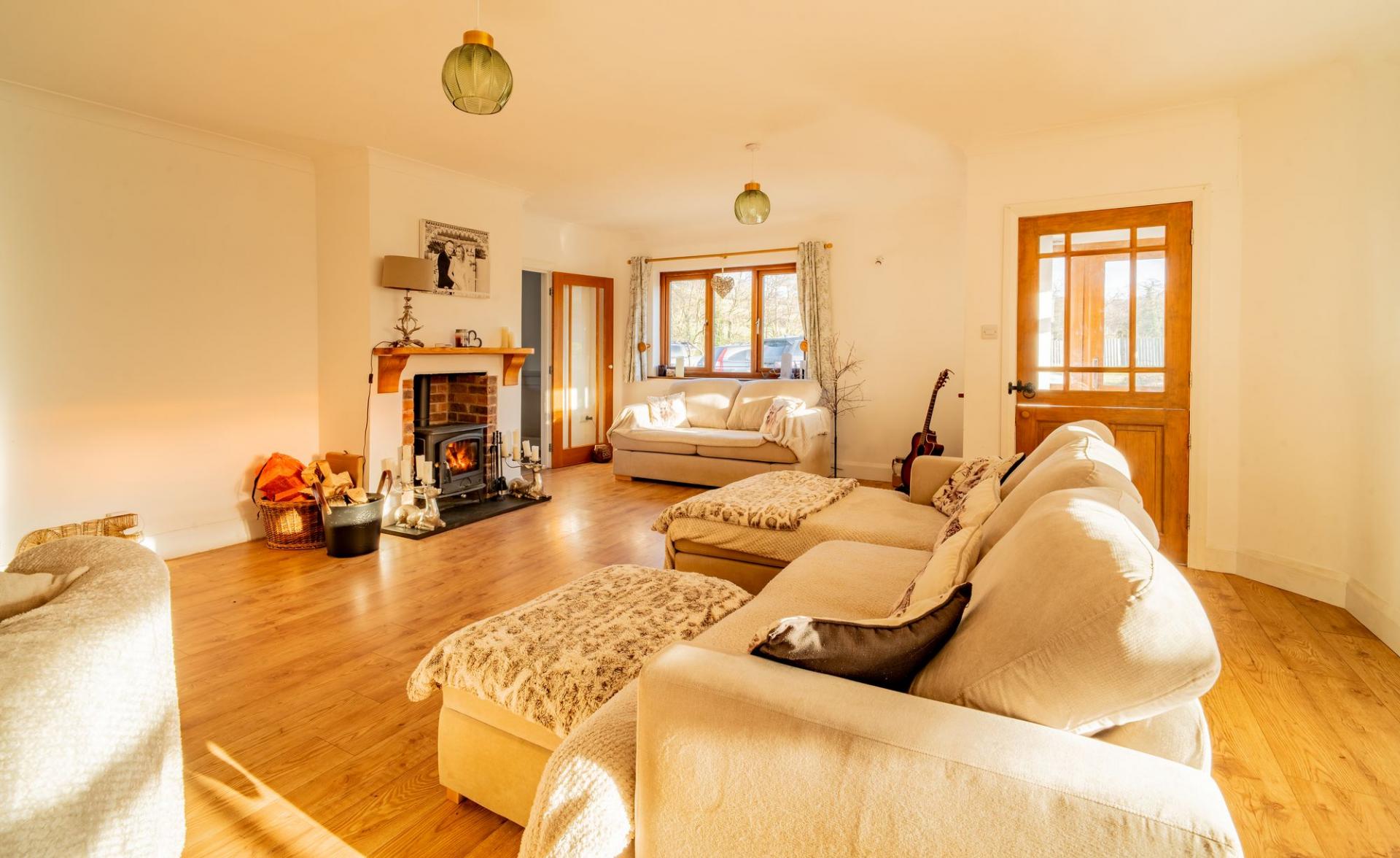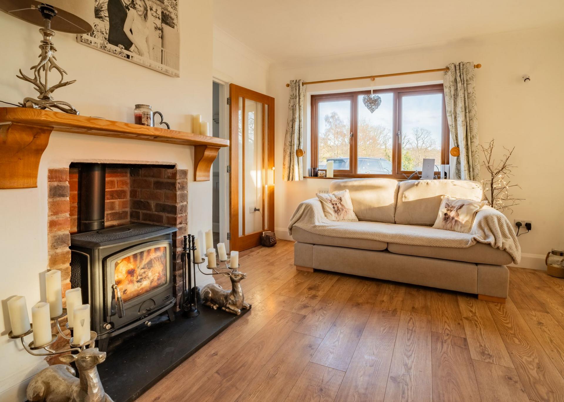 Side aspect window, Log burner set in fireplace. Open to the conservatory. Door to Dining Room.