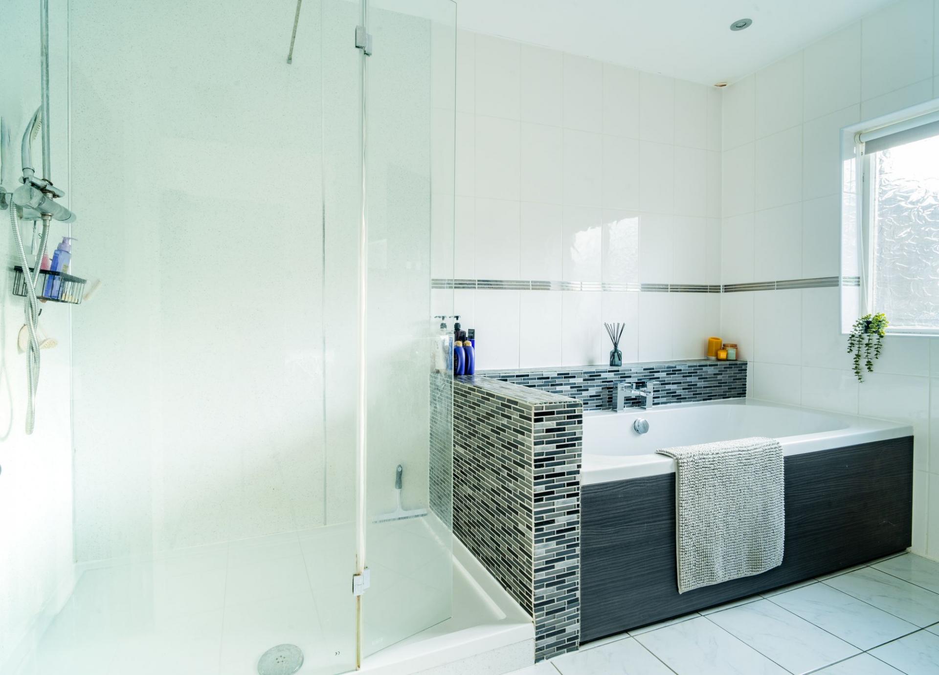 Opaque window. Bath, Double shower cubicle, basin and toilet.