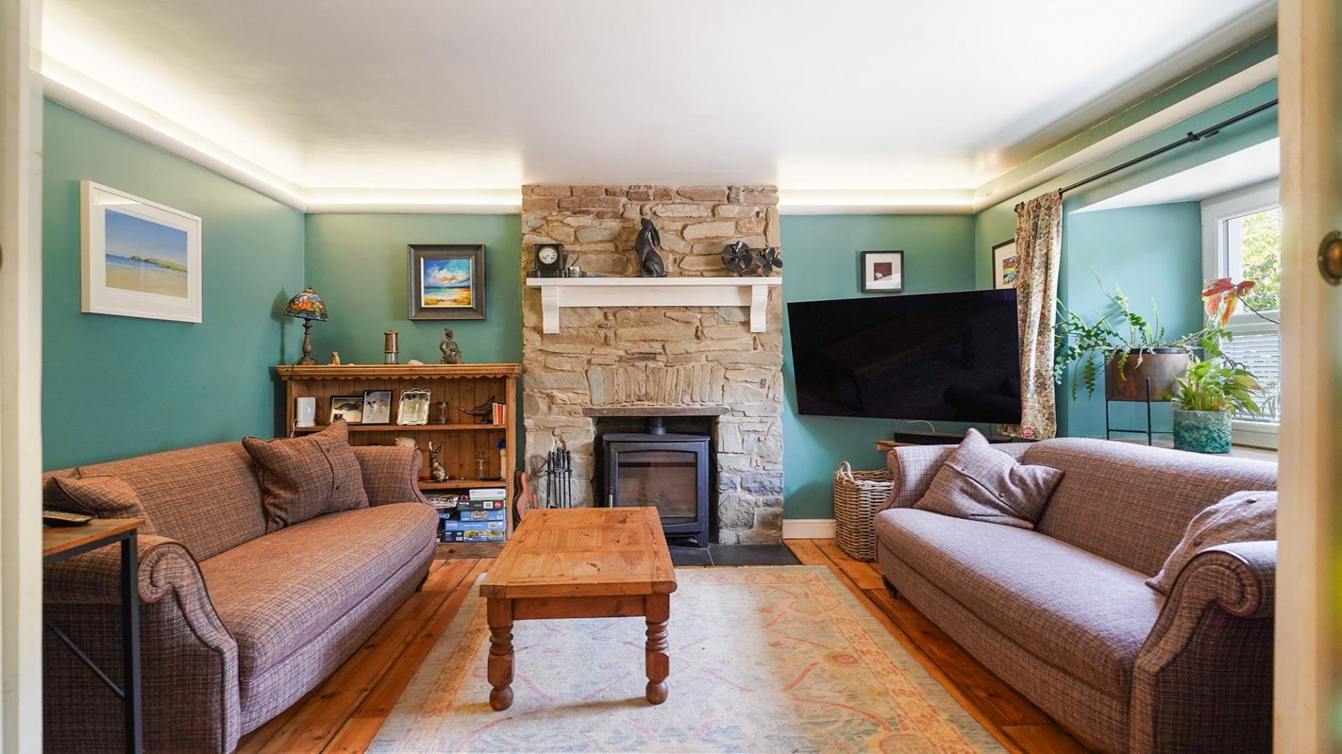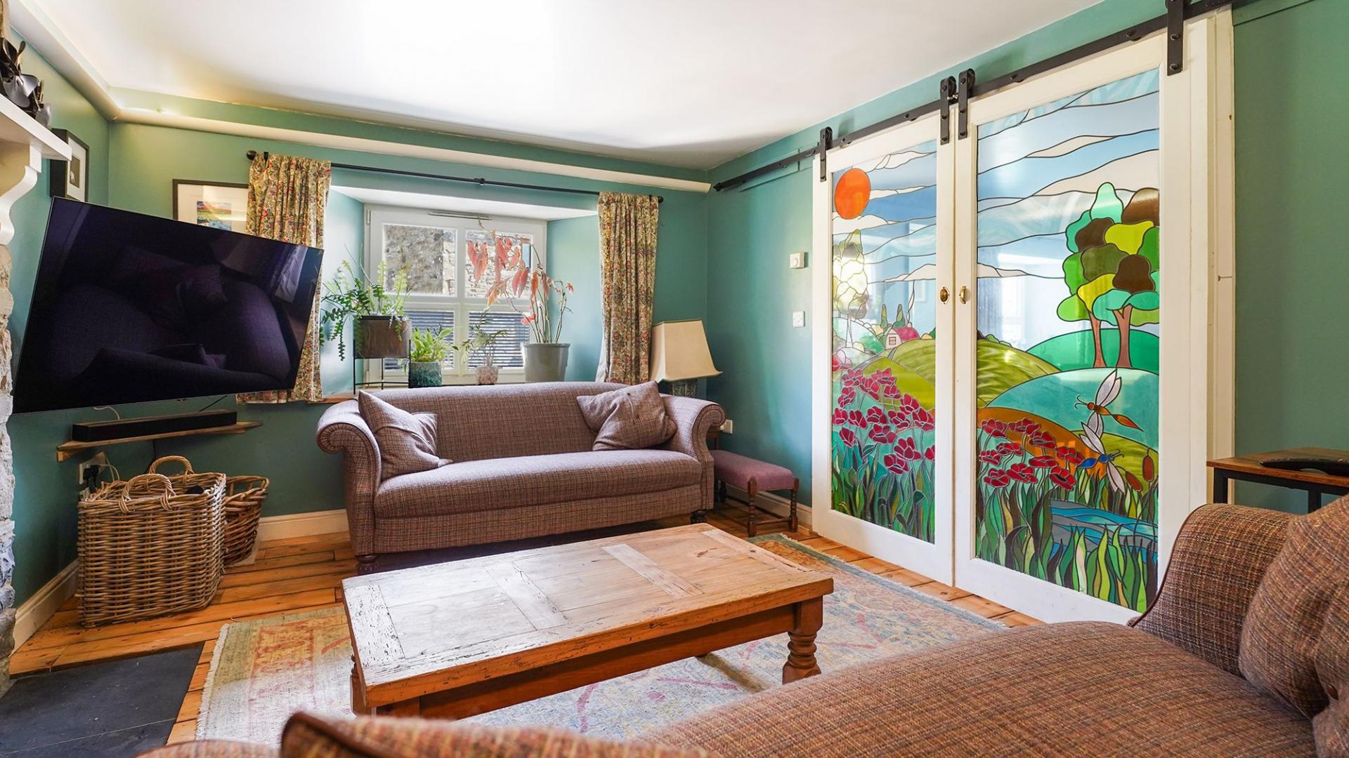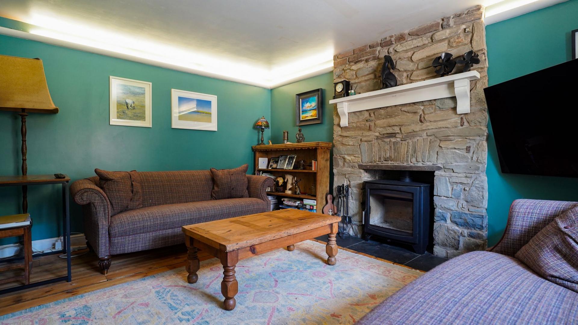 A characterful reception space featuring a wood-burning stove set within an impressive fireplace with overhead mantle, timber flooring, double-glazed window, part-exposed walling, and feature sliding doors with cast iron rail mechanism.