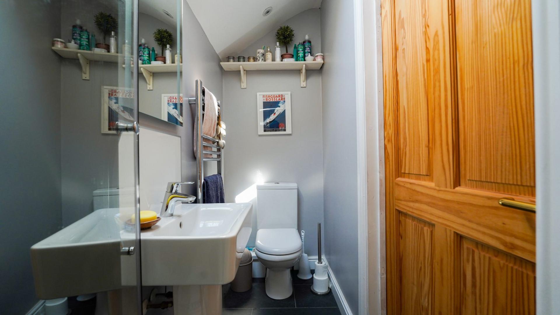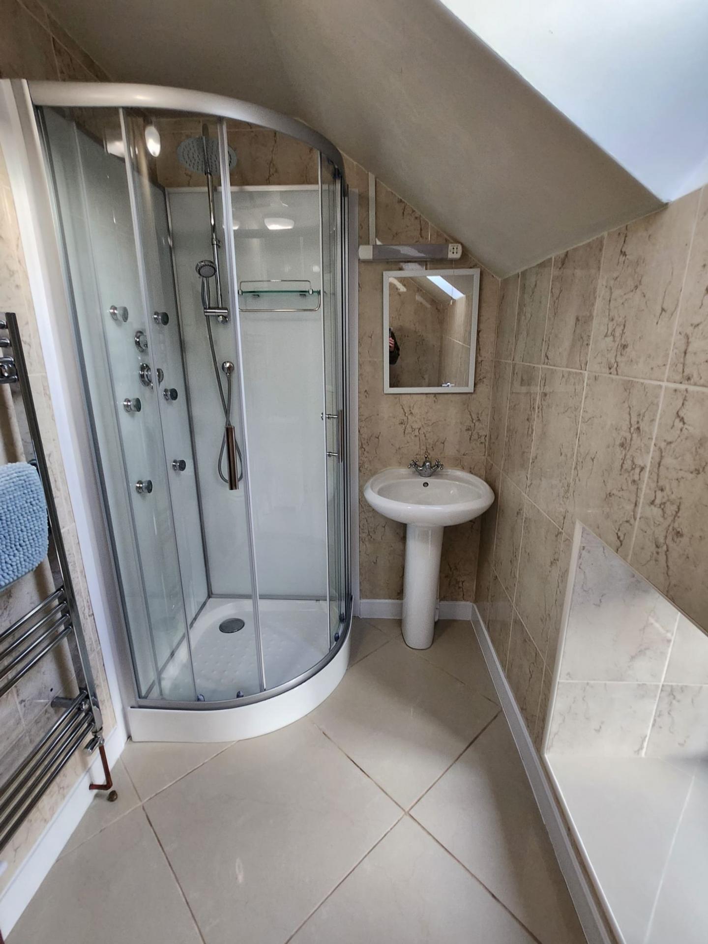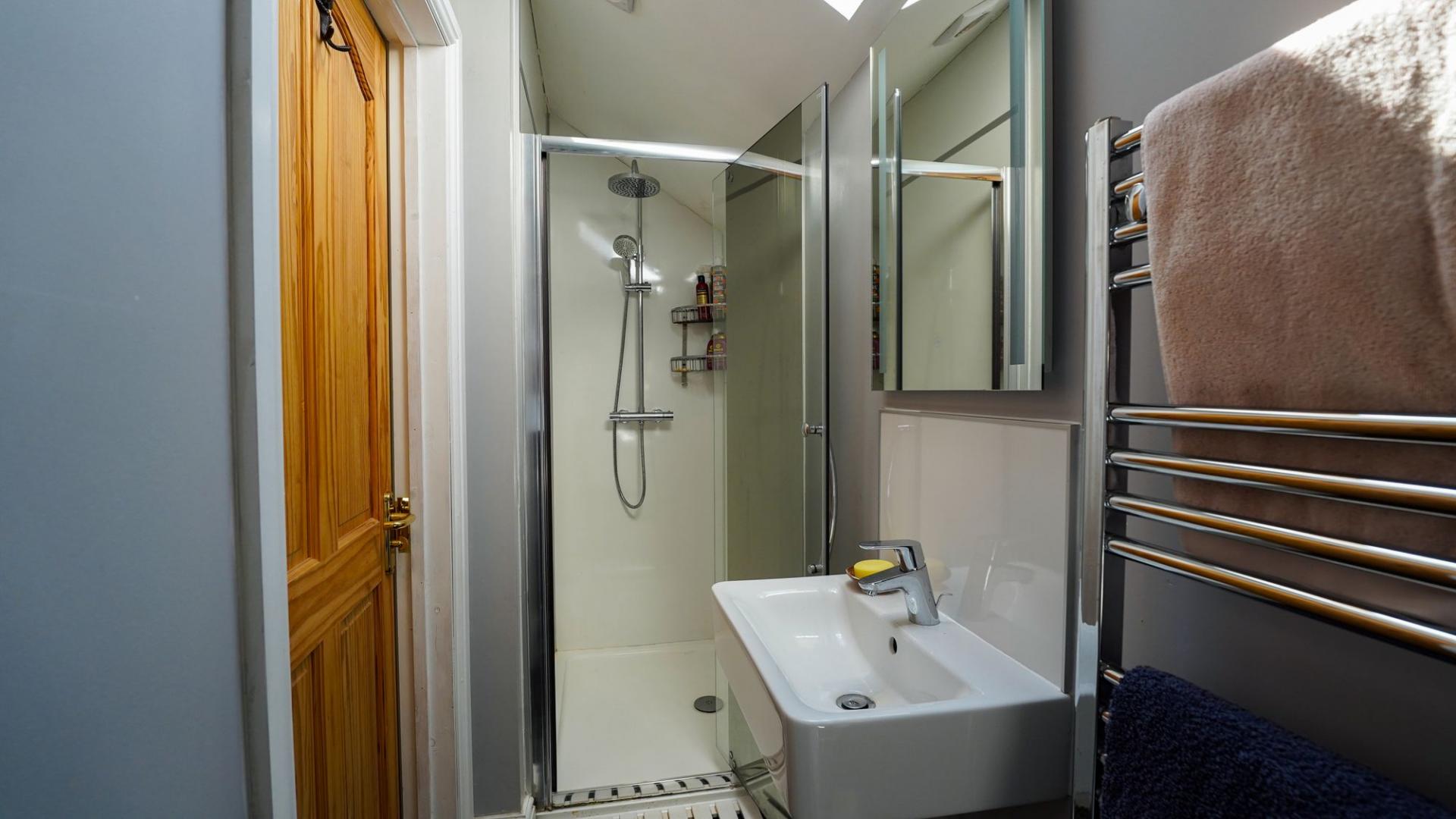 Walk-in rainfall shower with handheld attachment, pedestal wash hand basin, low-level WC, slate-tiled flooring, heated towel rail, and Velux window.