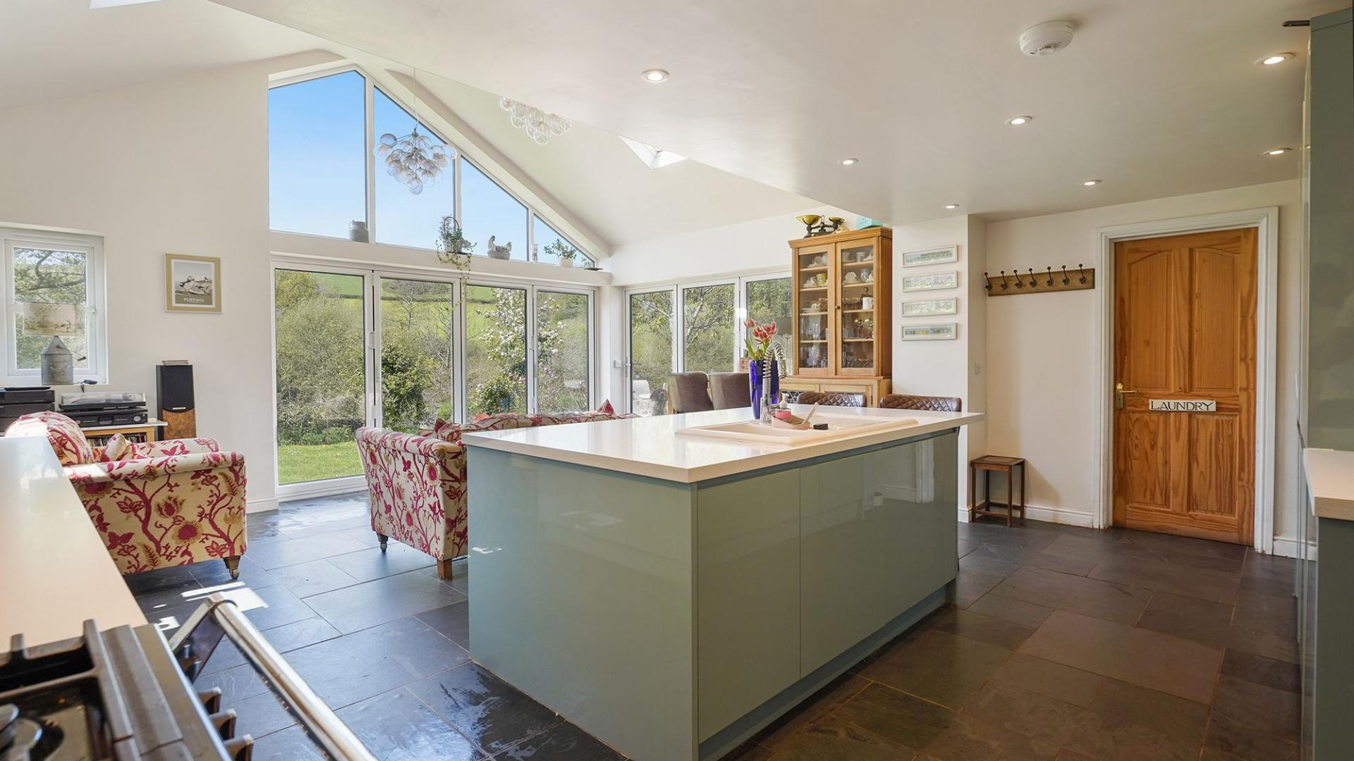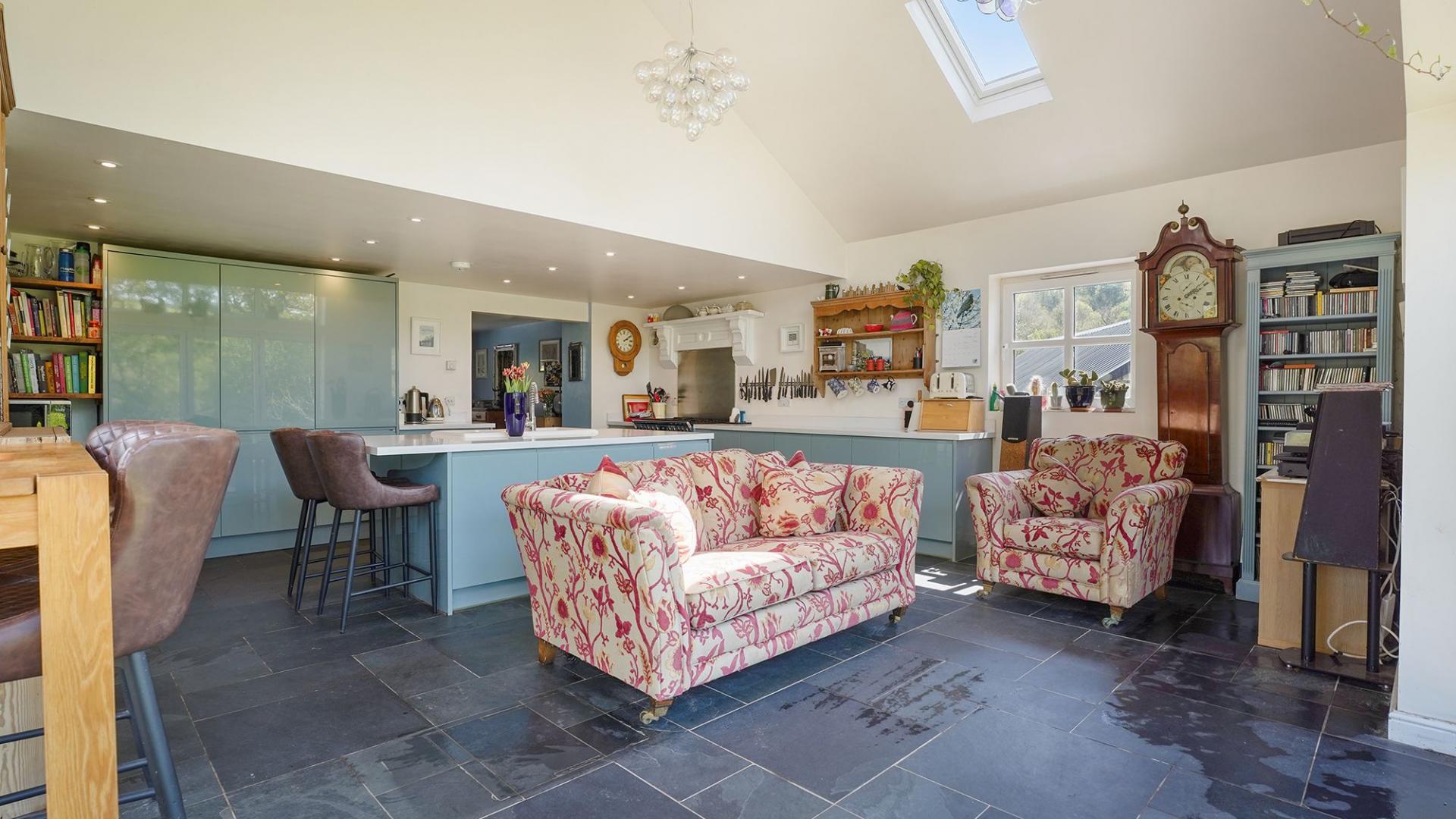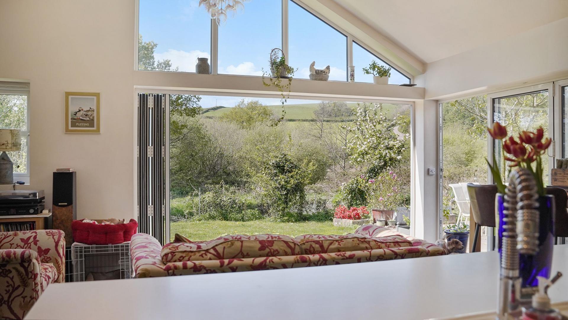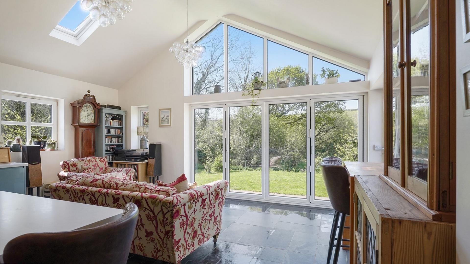 A spectacular vaulted-ceiling space with skylights and bifold doors opening onto the rear garden and side patio, overlooking countryside and river.