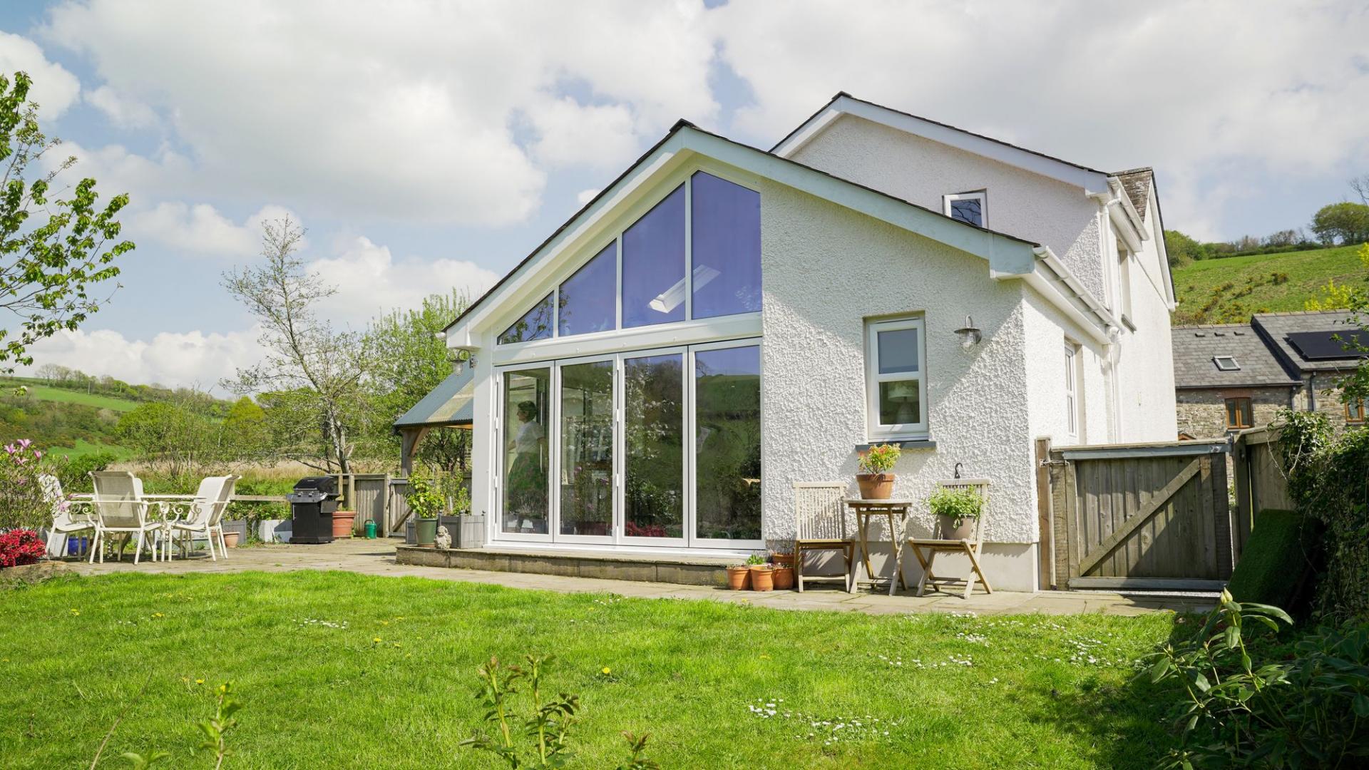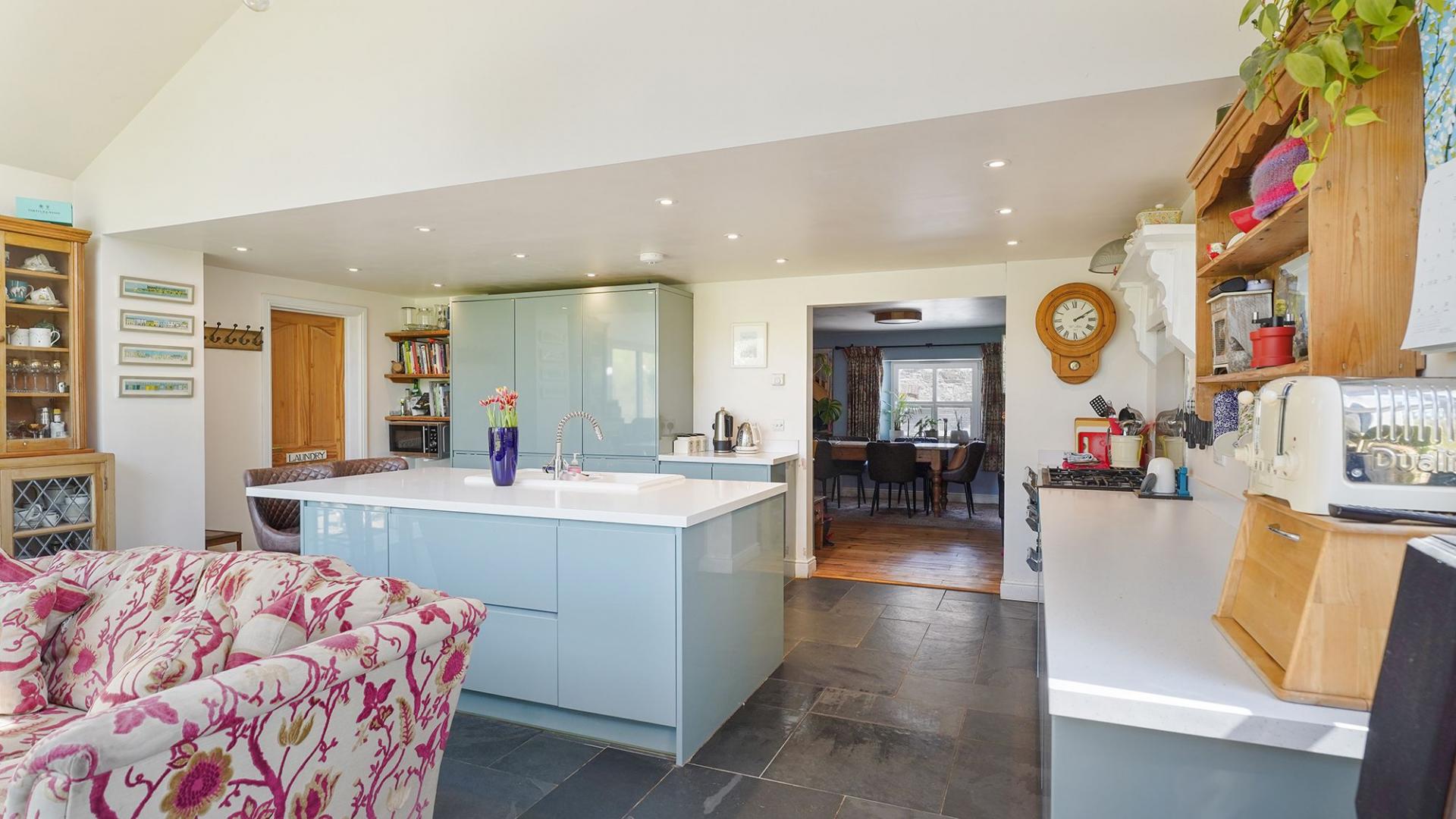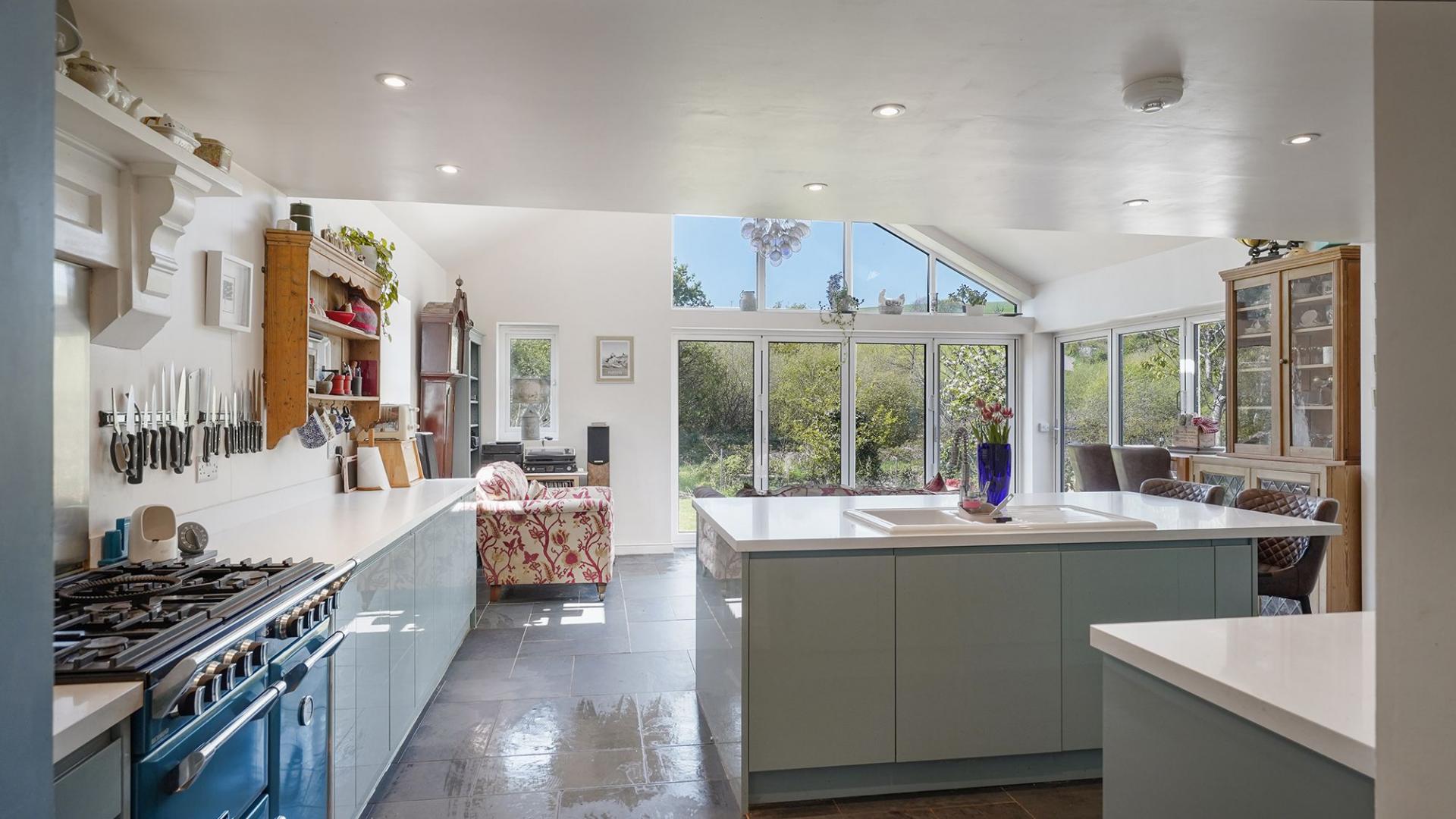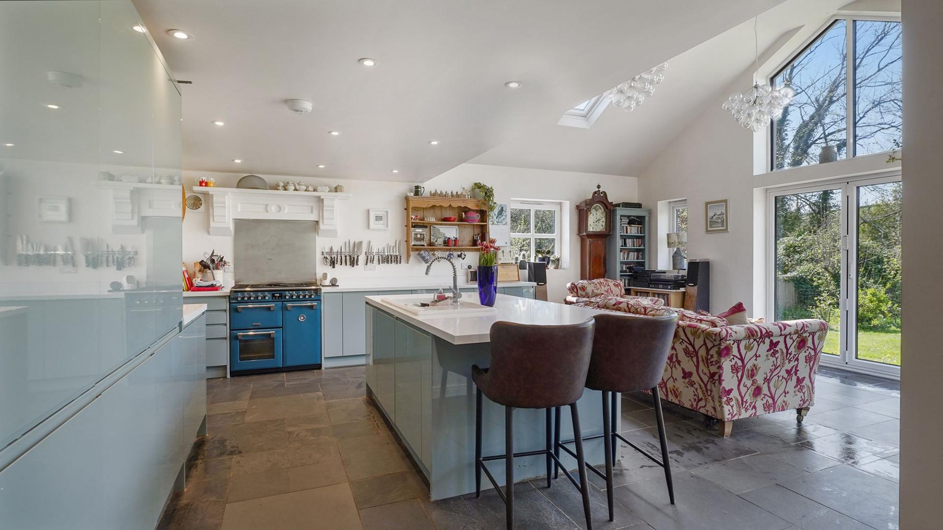 A spectacular vaulted-ceiling space with skylights and bifold doors opening onto the rear garden and side patio, overlooking countryside and river.