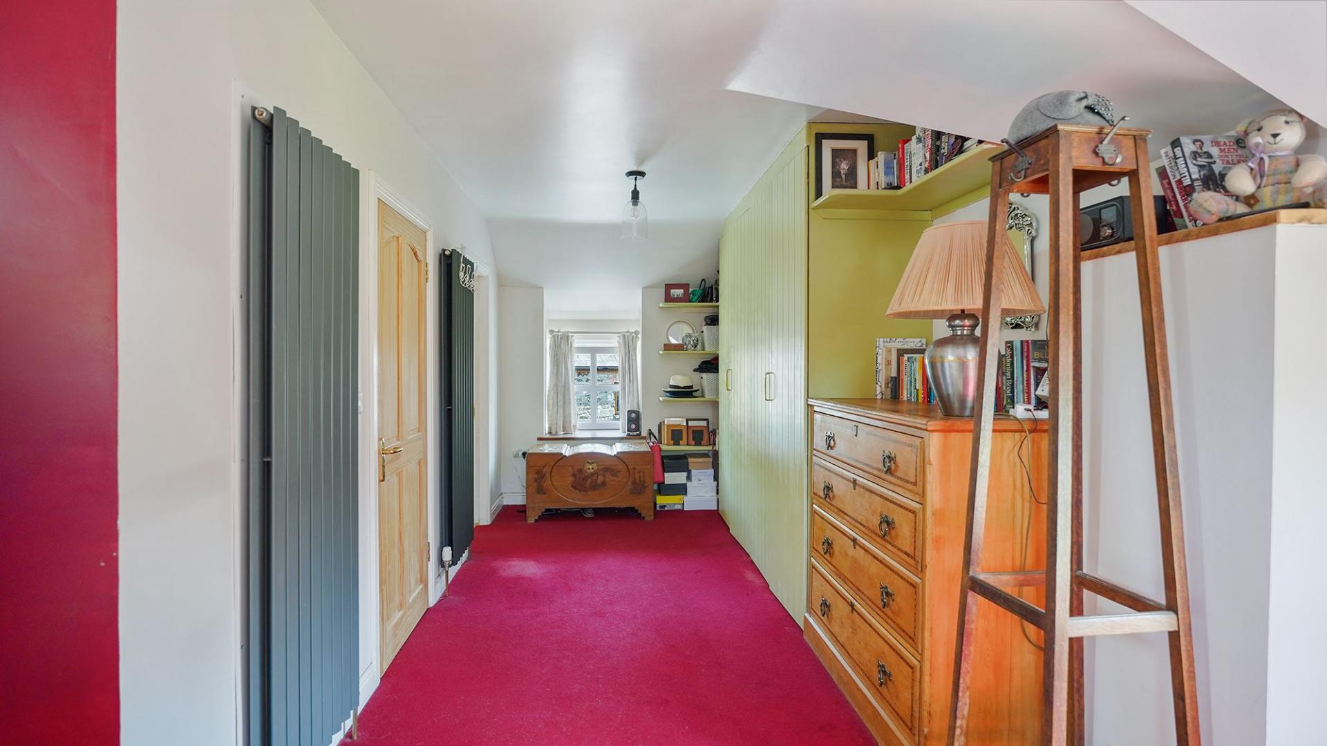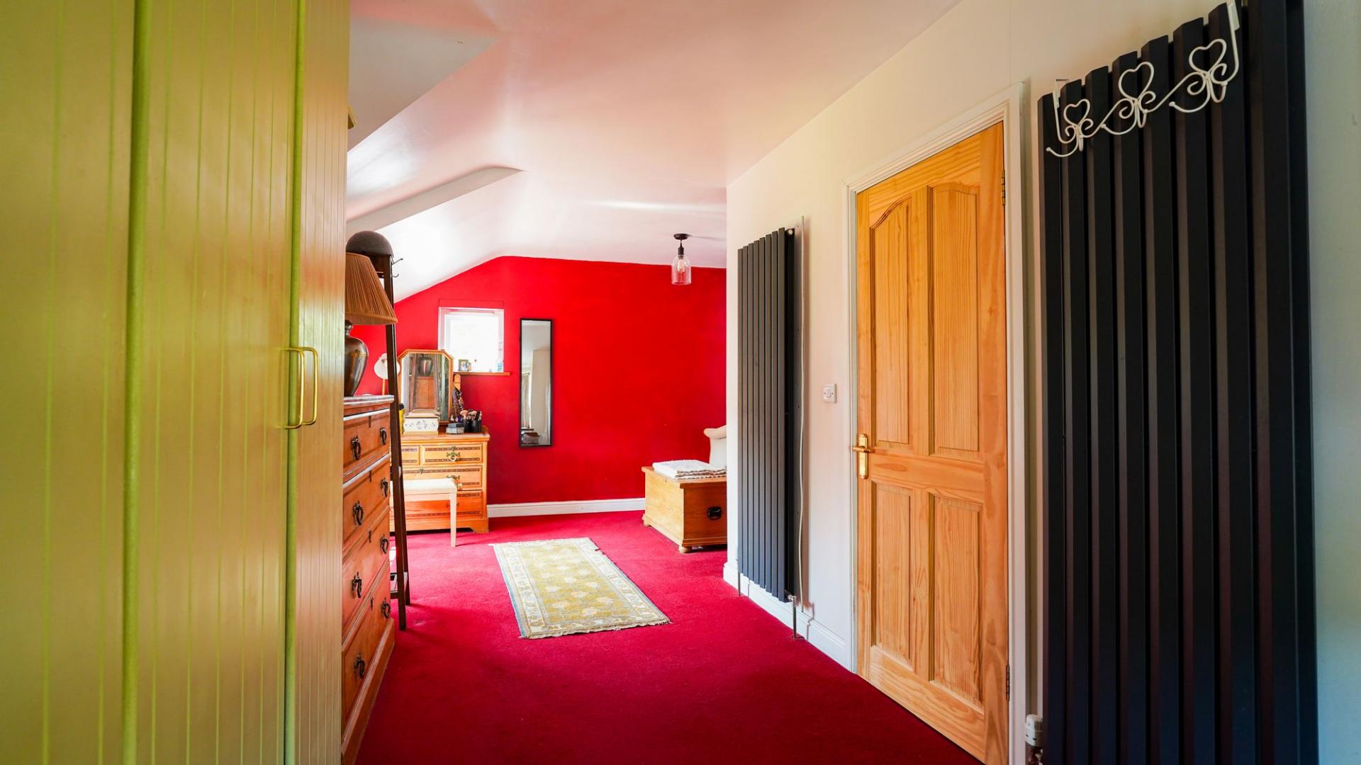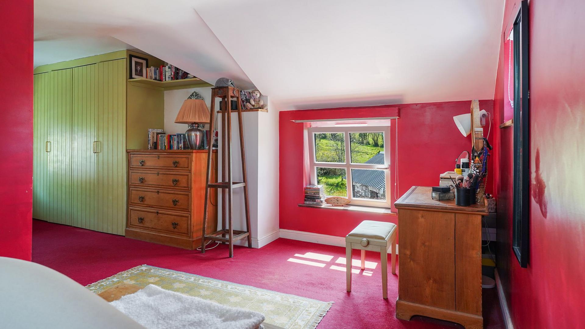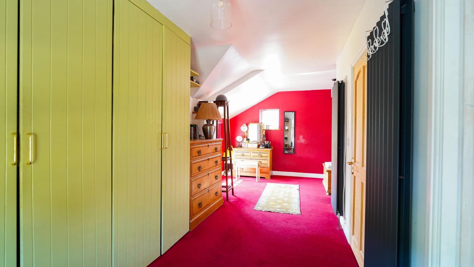 A spacious, L-shaped room with two radiators, four double-glazed windows offering triple aspect views, and a Velux skylight. Includes a dedicated dressing area with two built-in wardrobes and ample floor space. The room could be reconfigured to create a third bedroom if desired.