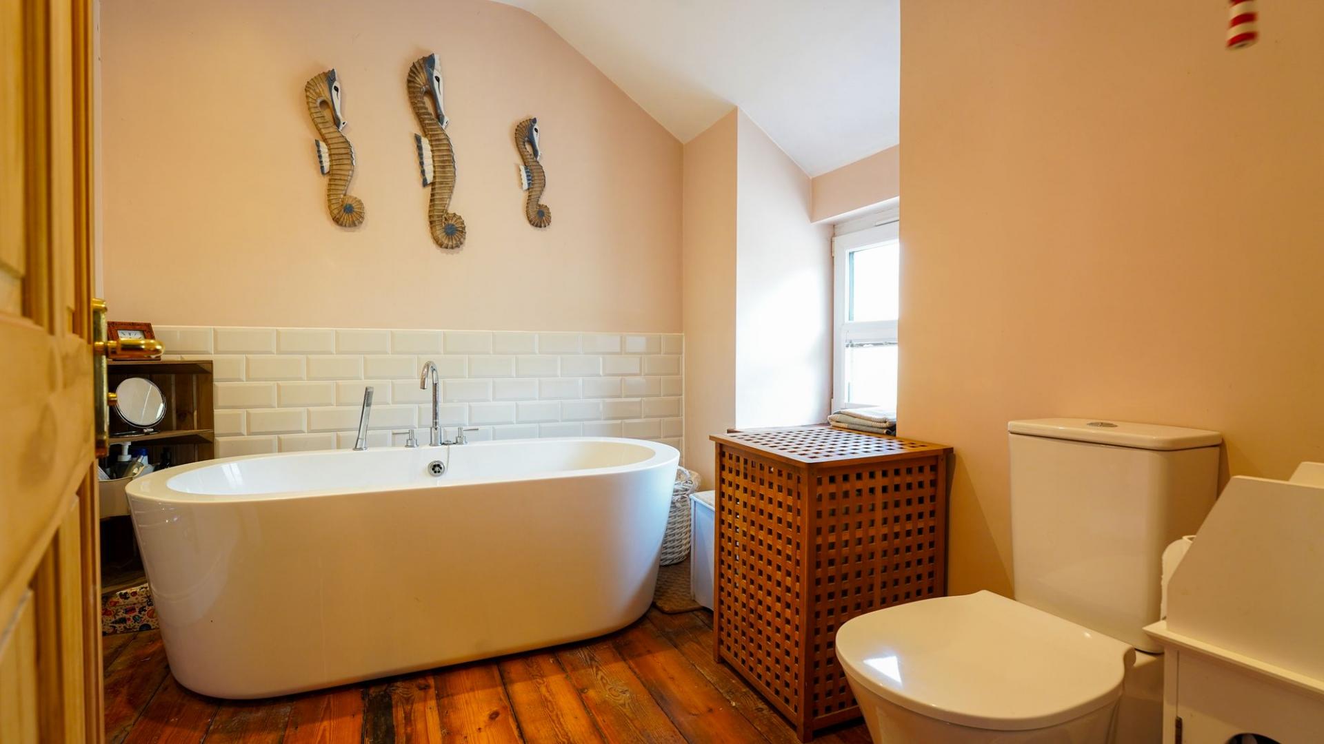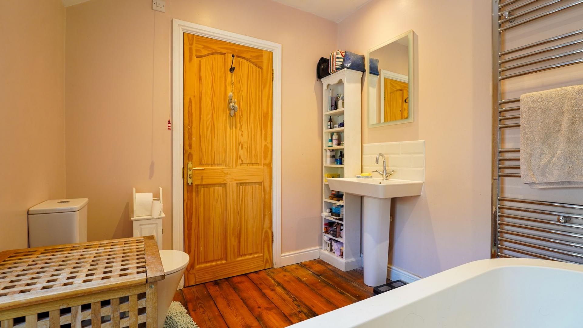 Features a freestanding bath with mixer tap and handheld shower attachment, pedestal wash basin, low-level WC, timber-panelled flooring, obscured window, and heated towel rail.