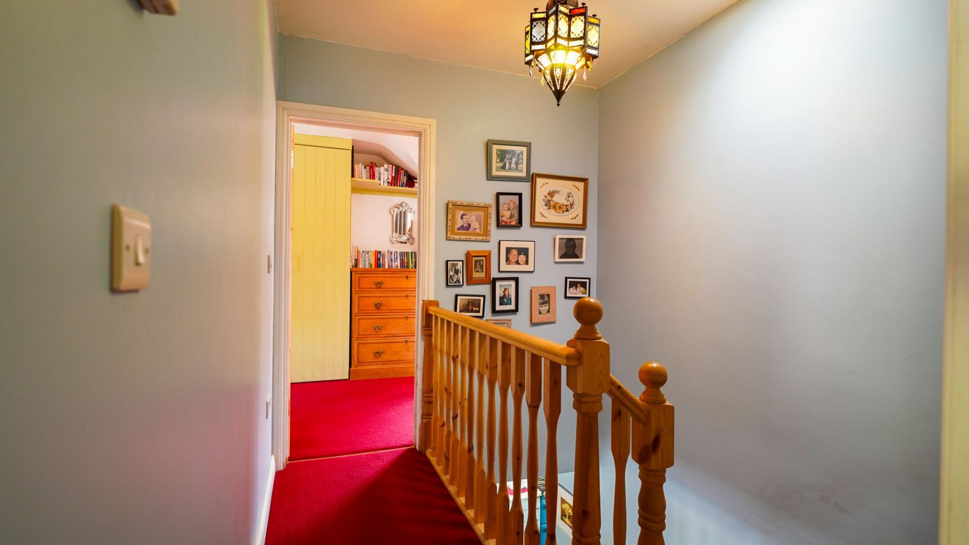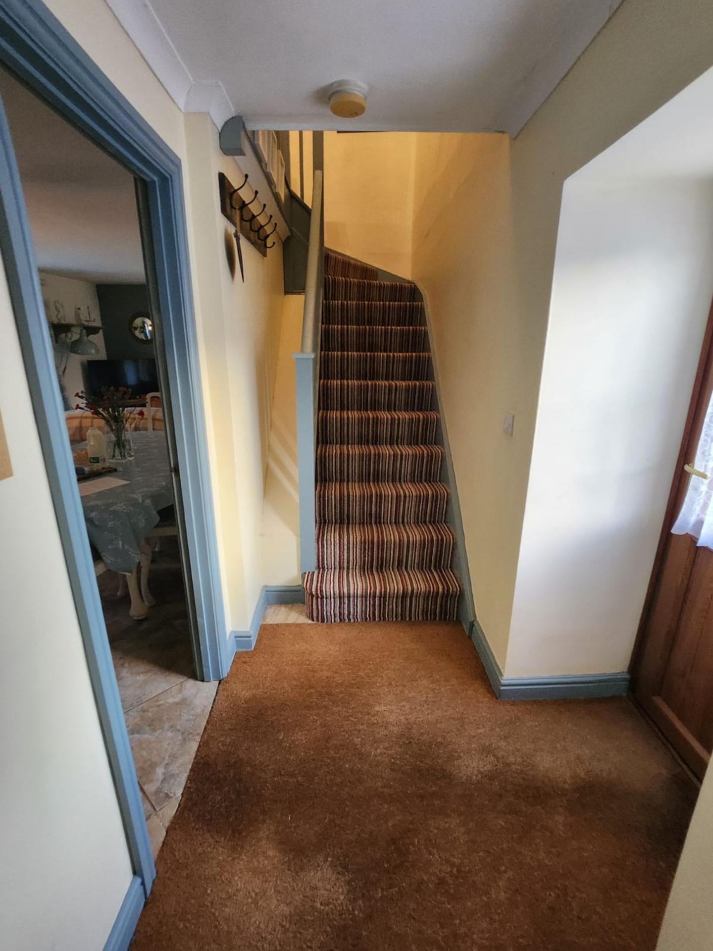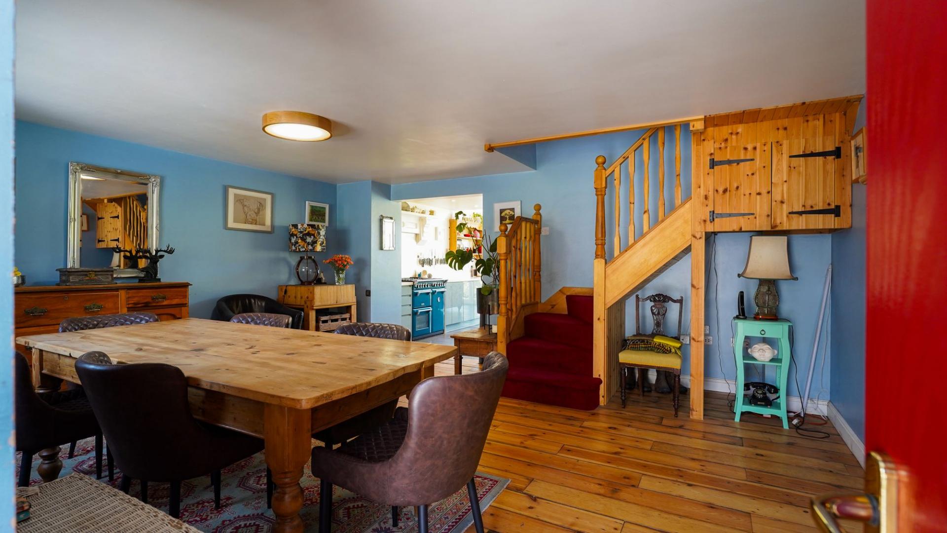 A warm and welcoming space with attractive timber flooring, a double-glazed front-facing window, and stairs rising to the first-floor landing. Under-stairs storage area, open-plan flow into the kitchen and sitting room.