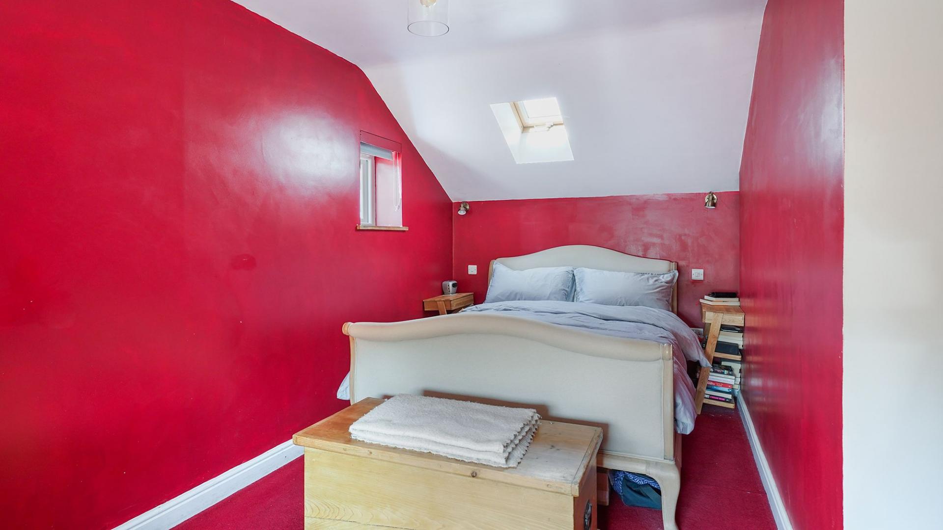 A large L-shaped room with triple aspect, four UPVC double-glazed windows, and a Velux skylight. Dedicated dressing area with two built-in double wardrobes. Wall-mounted designer radiator. Easily reconfigurable into 2 bedrooms if desired.