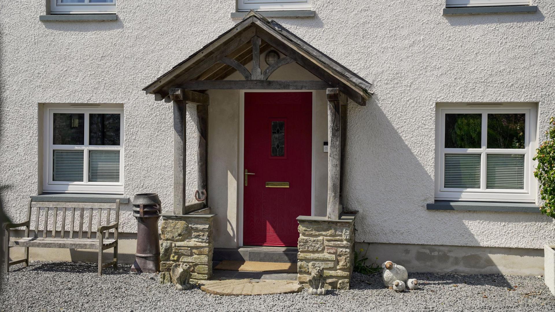 A rustic-style canopied entrance with a slate-tiled step leading to a composite double-glazed security door.